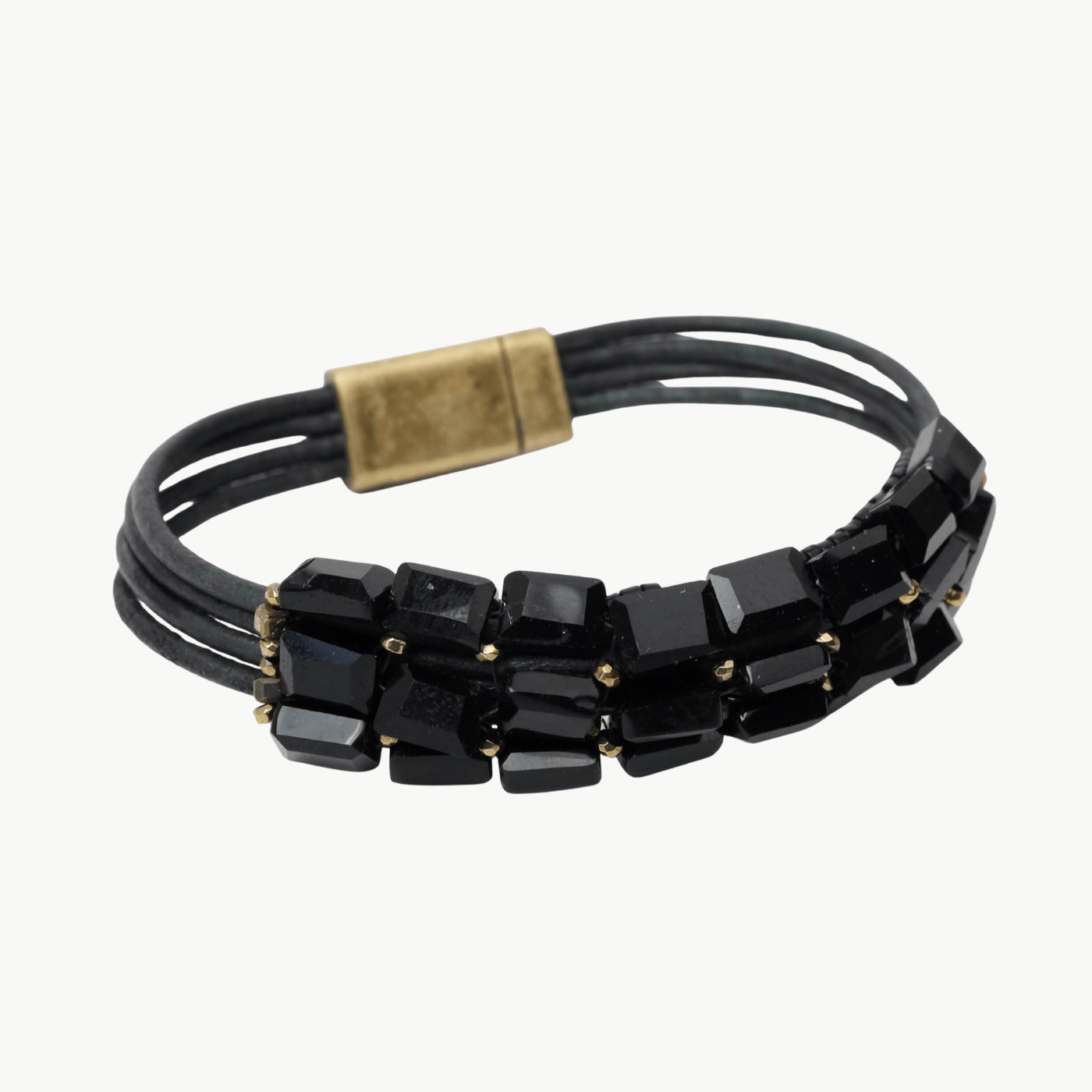 A sleek strand of antique black leather is hand woven with glossy black onyx tiles, creating a bold, modern look with rich depth and shine. The faceted stones catch the light softly while maintaining a clean, minimalist edge. Finished with an 8mm brass rivet clasp, this bracelet blends natural texture with polished sophistication.