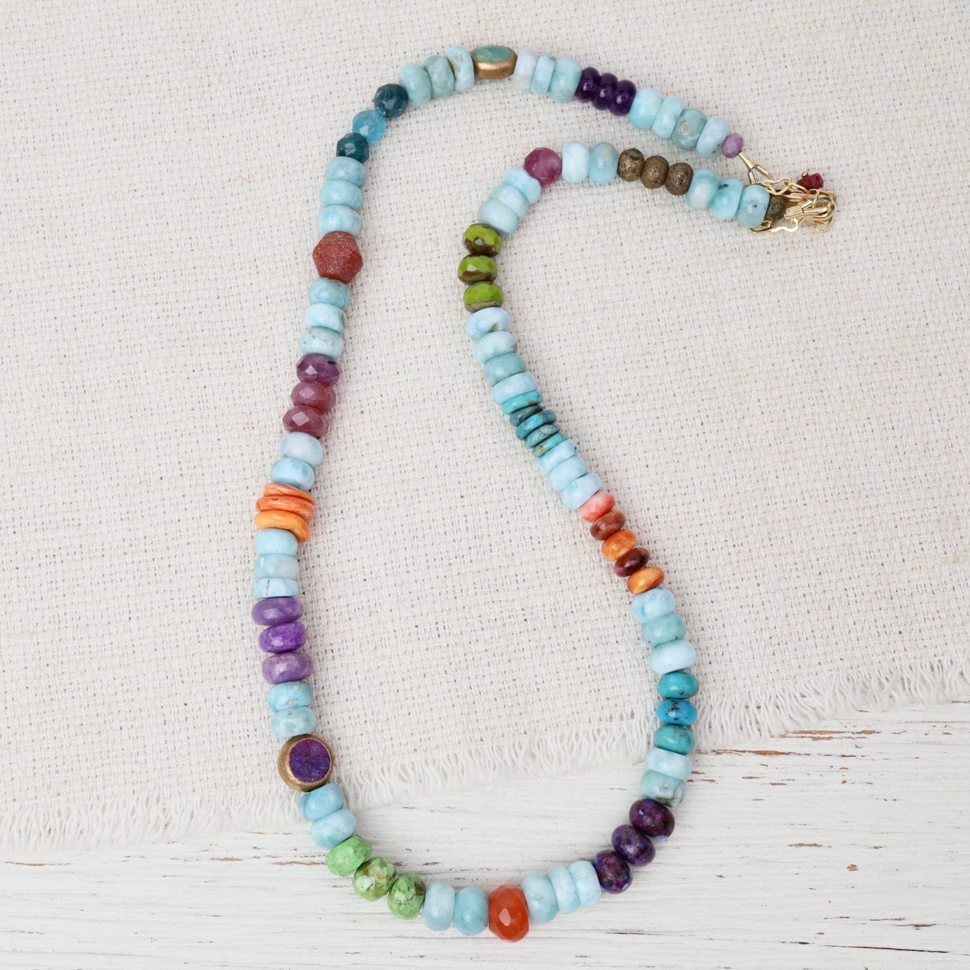 Soft, oceanic hues meet vibrant pops of color in this one-of-a-kind necklace. Centered around tranquil larimar stones, it features a joyful mix of turquoise, amethyst, ruby, spiny oyster, gaspeite, carnelian, and phosphosiderite — creating a lively balance of calm and color.