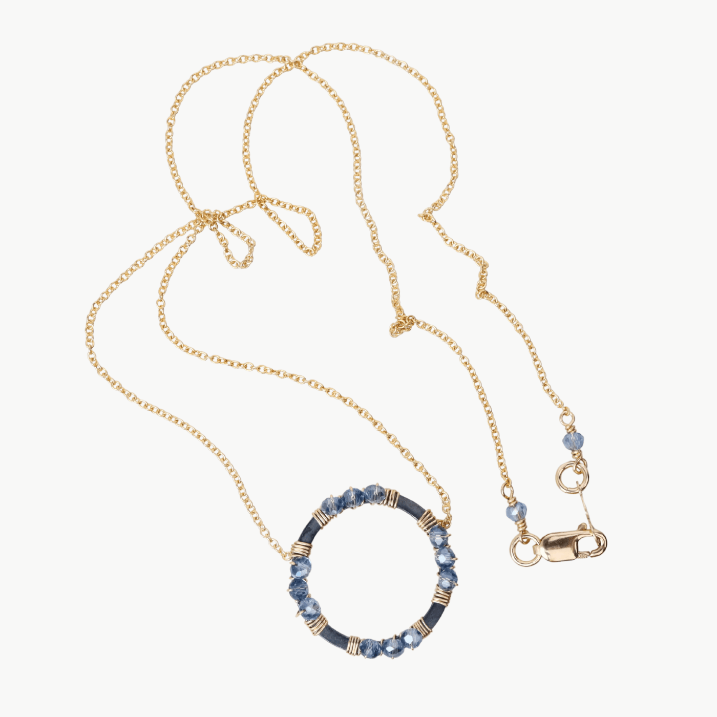 A striking circle of darkened silver is wrapped with shimmering blue crystals, creating a delicate contrast of tone and texture. Suspended from a classic gold filled cable chain, this piece is effortless on its own or layered with your everyday favorites.