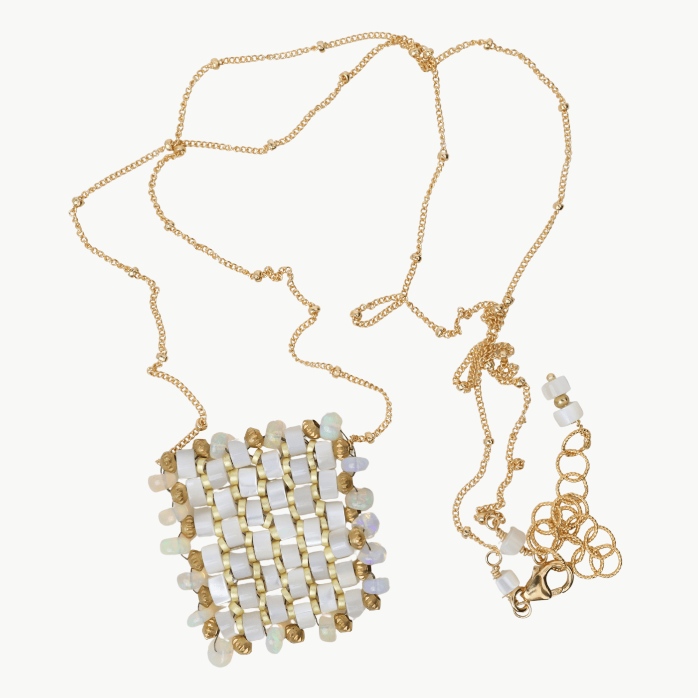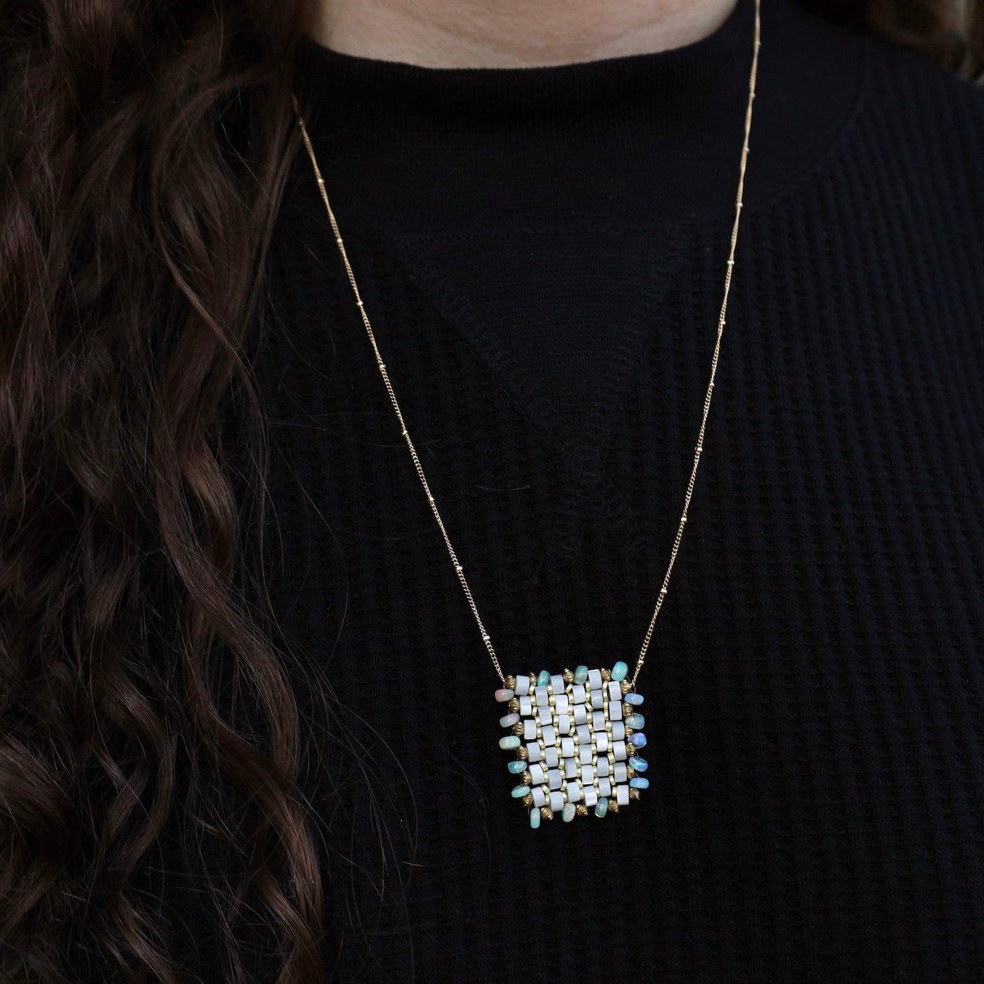 A luminous, hand-stitched design that glows with soft iridescence, this necklace features a woven panel of smooth mother of pearl tiles accented with shimmering opal trim. The gently shifting colors of the opals bring a touch of magic to the structured “flag” silhouette, creating a piece that feels both modern and ethereal. Suspended from a delicate gold filled chain, it’s effortless, elegant, and beautifully unique.
