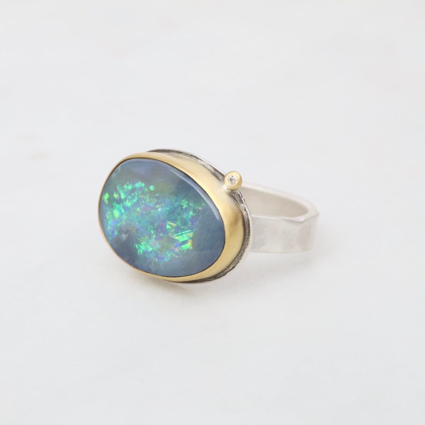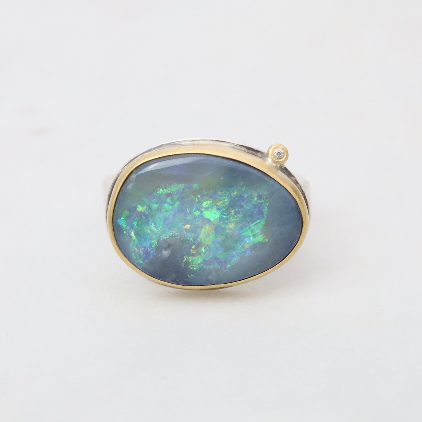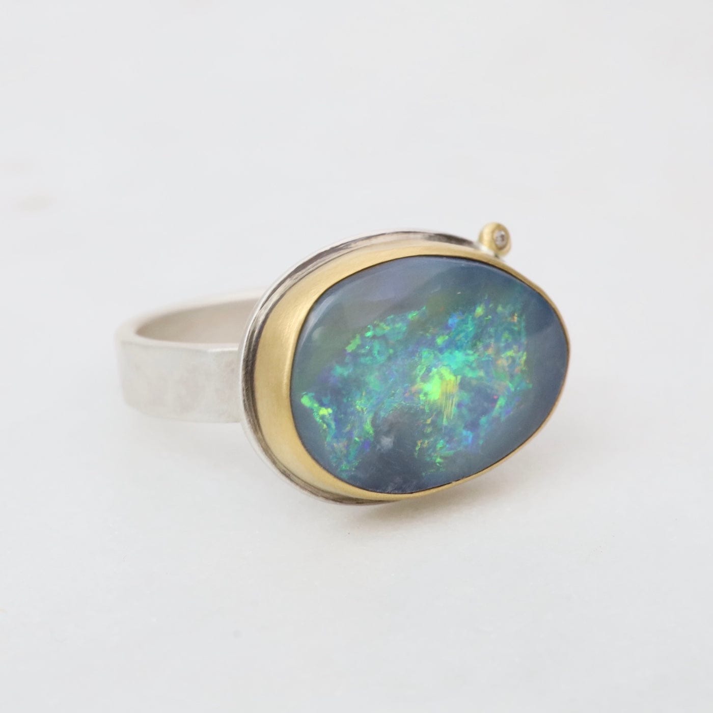 An organically shaped, magical, one of a kind boulder opal is wrapped in warm 22k gold and accented with one sparkling diamond. A truly special and powerful ring, dancing with color and light.