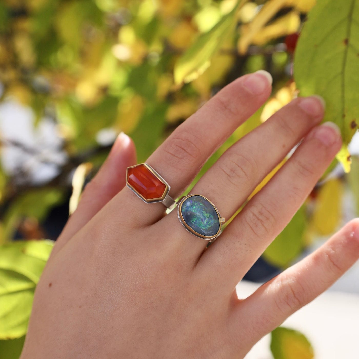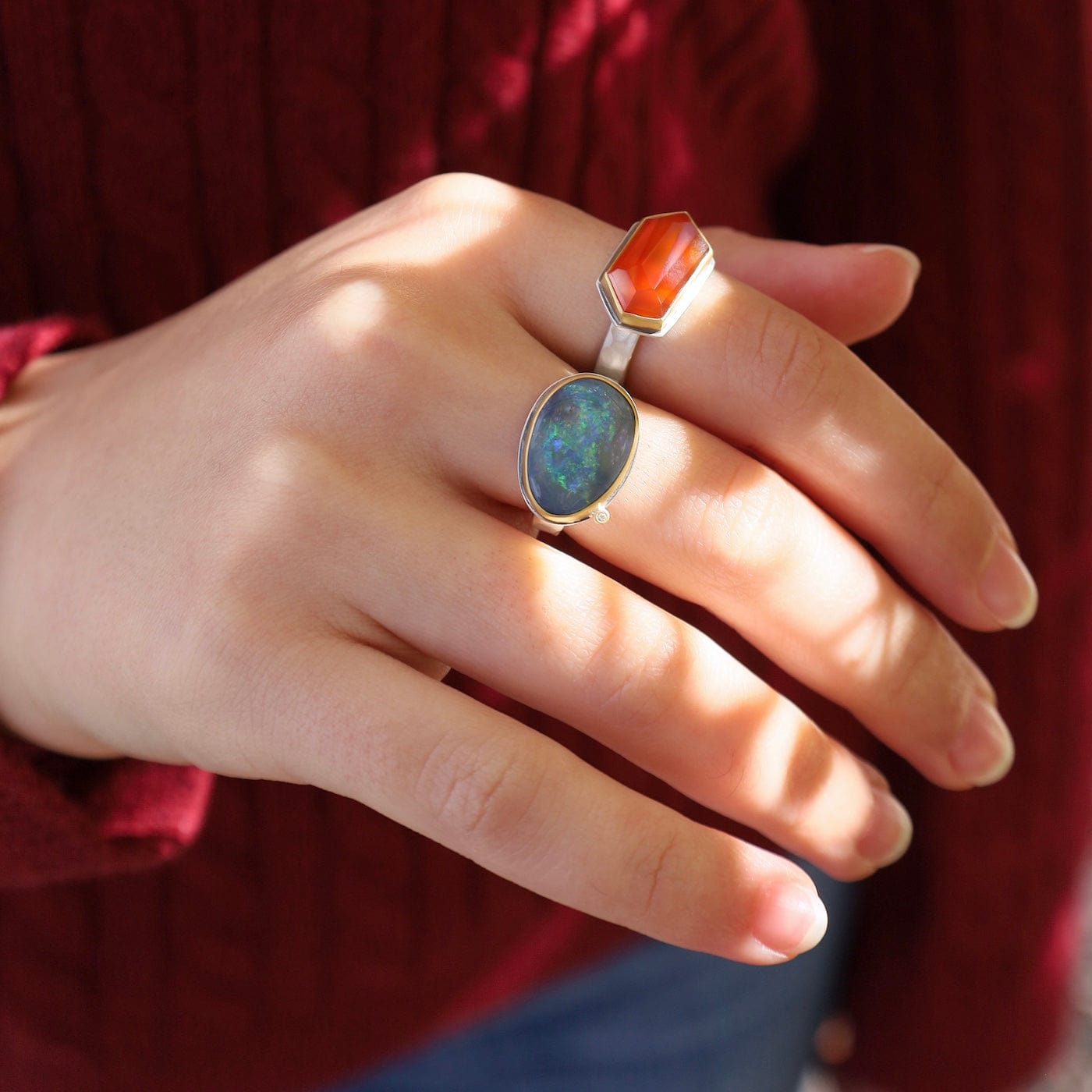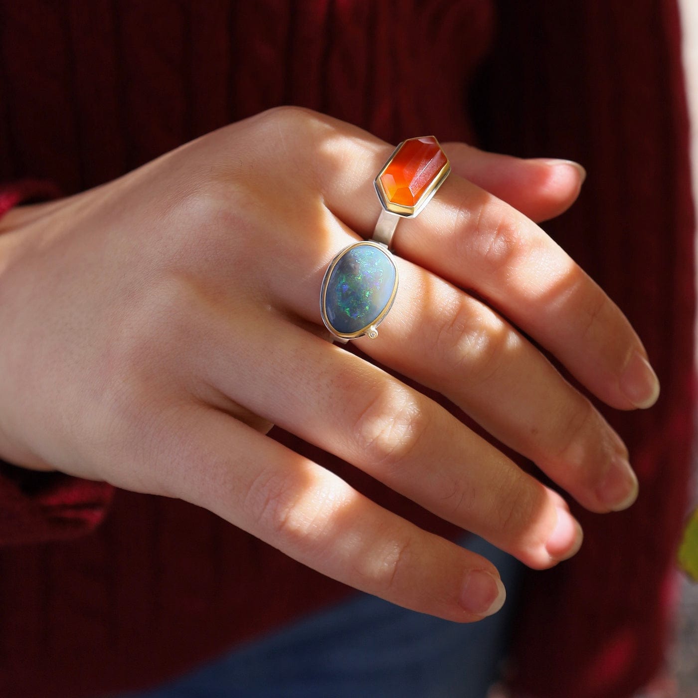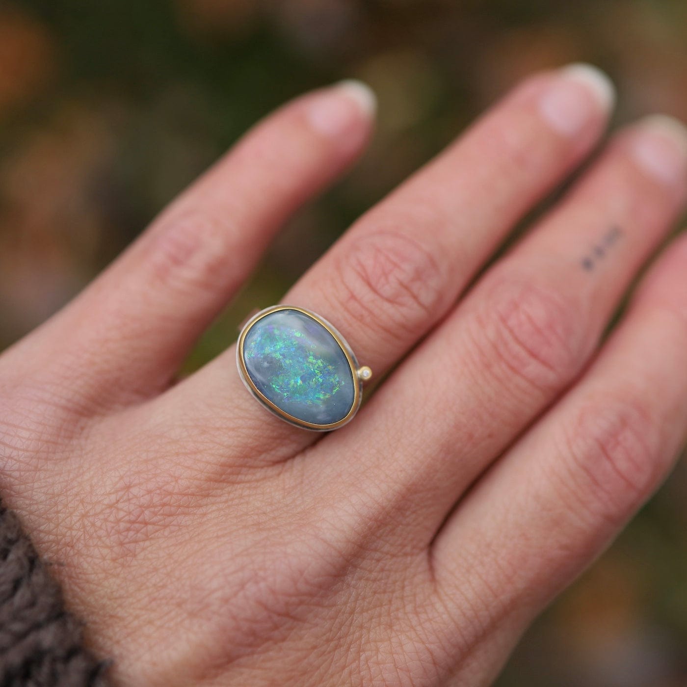 An organically shaped, magical, one of a kind boulder opal is wrapped in warm 22k gold and accented with one sparkling diamond. A truly special and powerful ring, dancing with color and light.