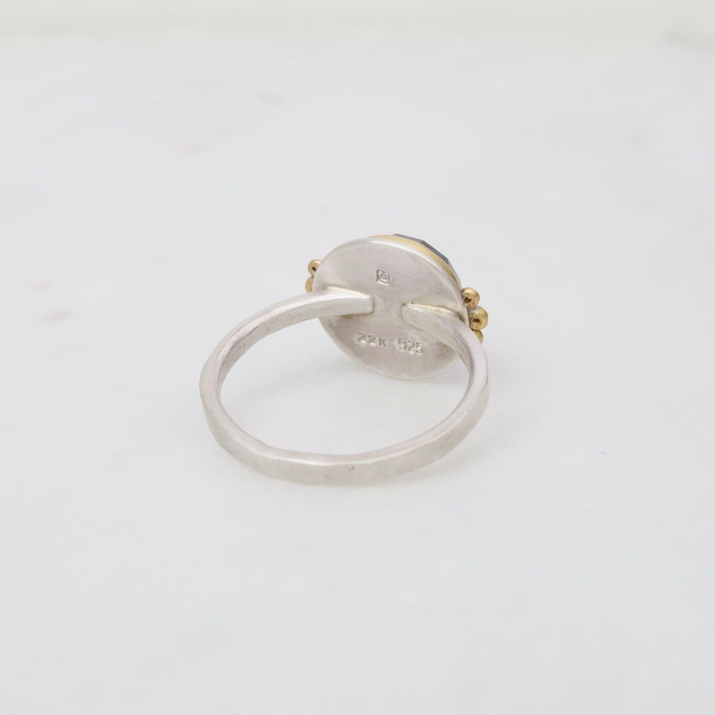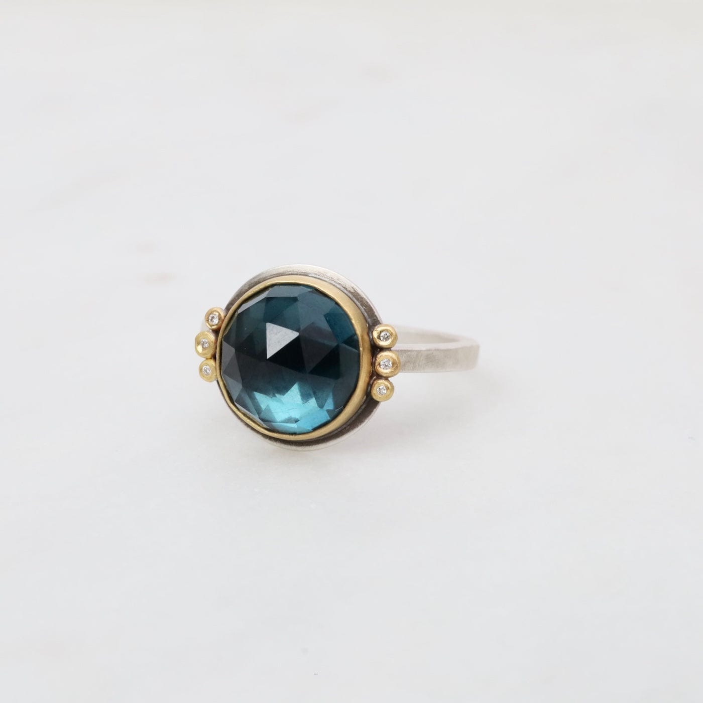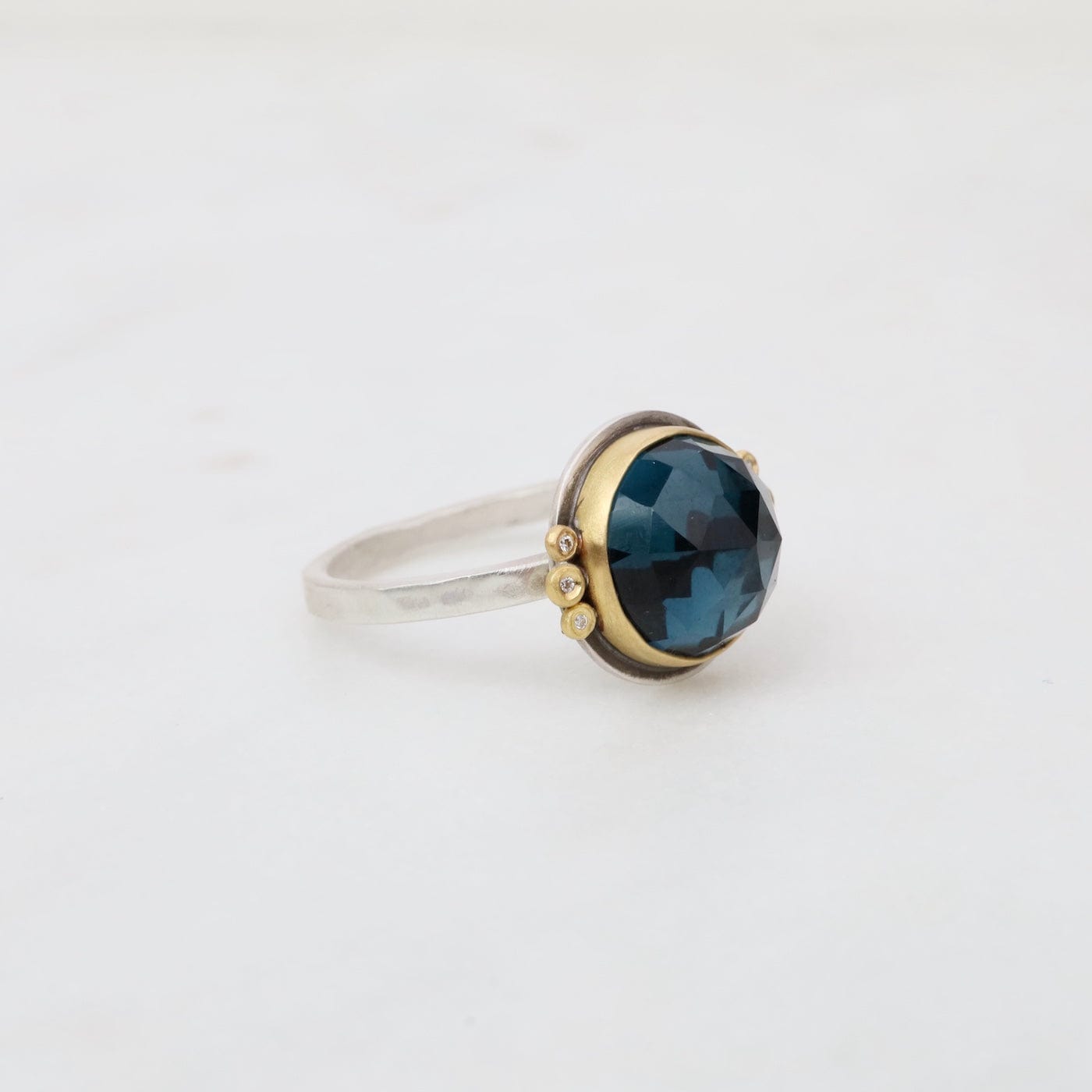 A glowing, rose cut London blue topaz is wrapped in warm 22k gold, and accented with a pair of sparkling diamond trios. This stone has a lovely color, a luminous and sparkly deep blue.