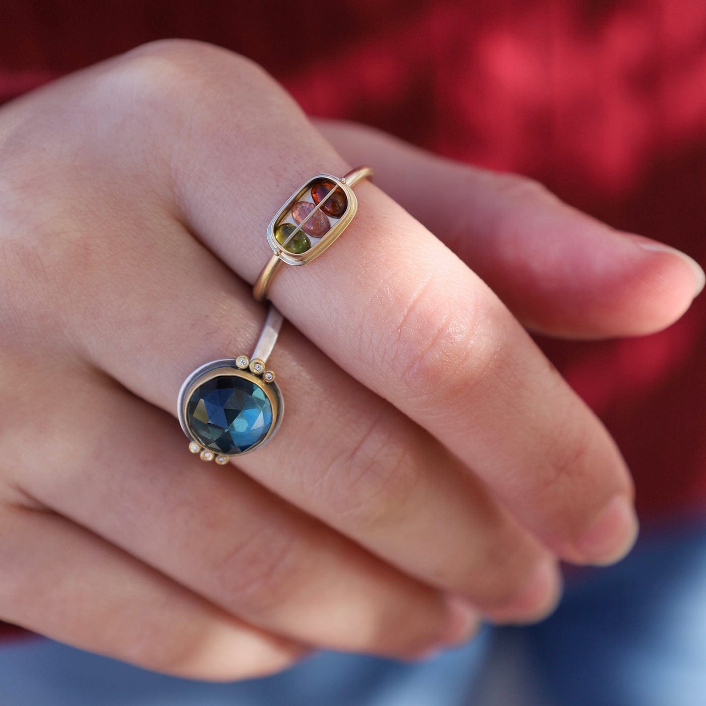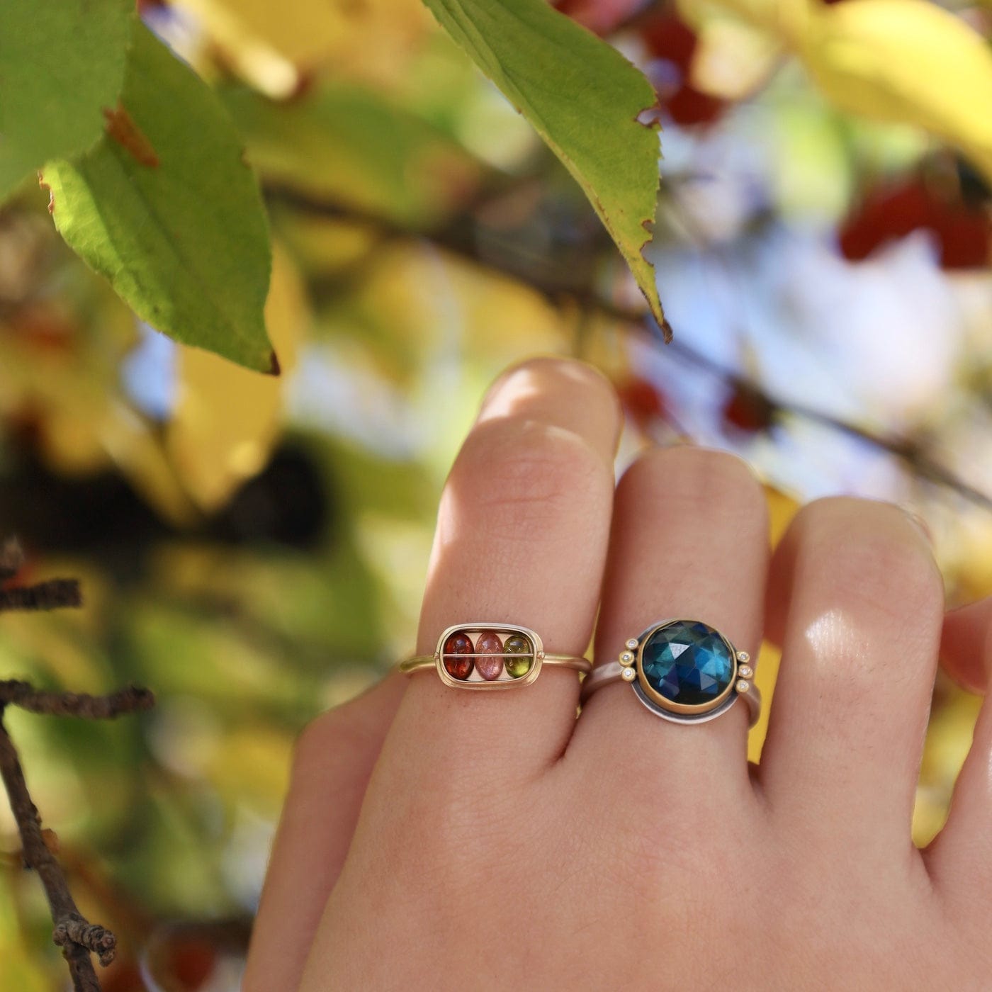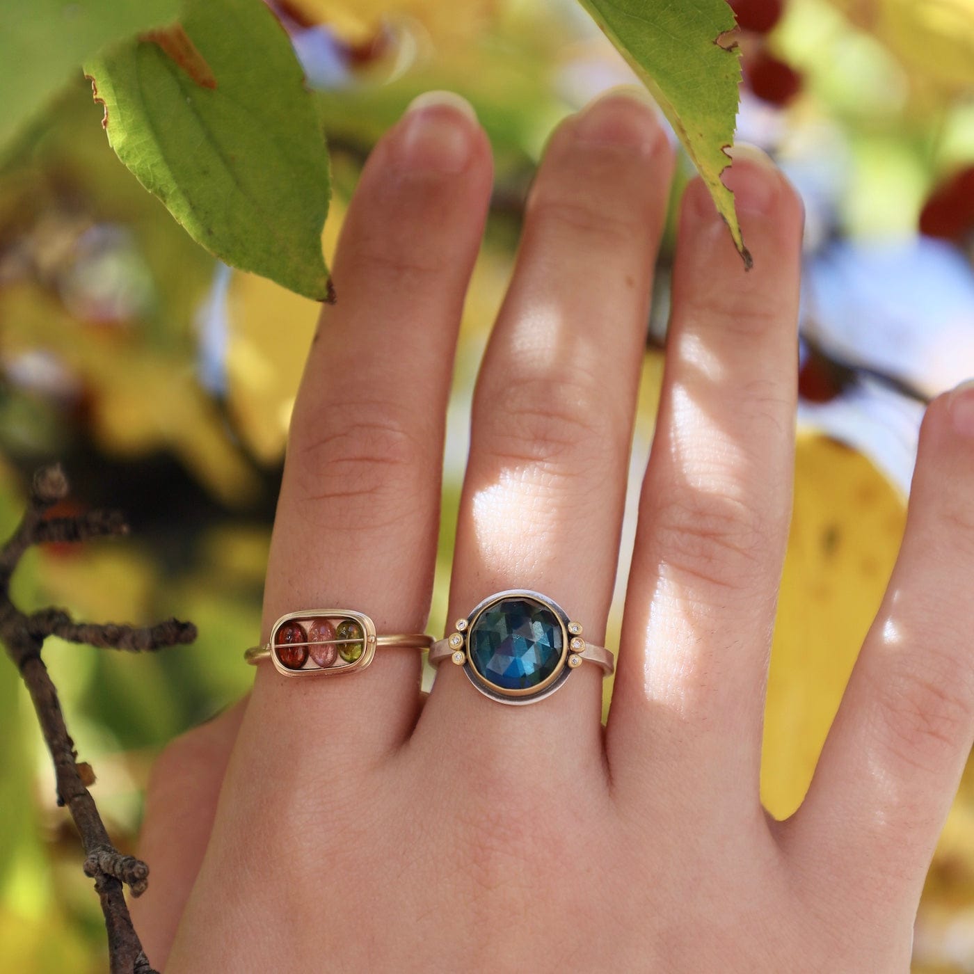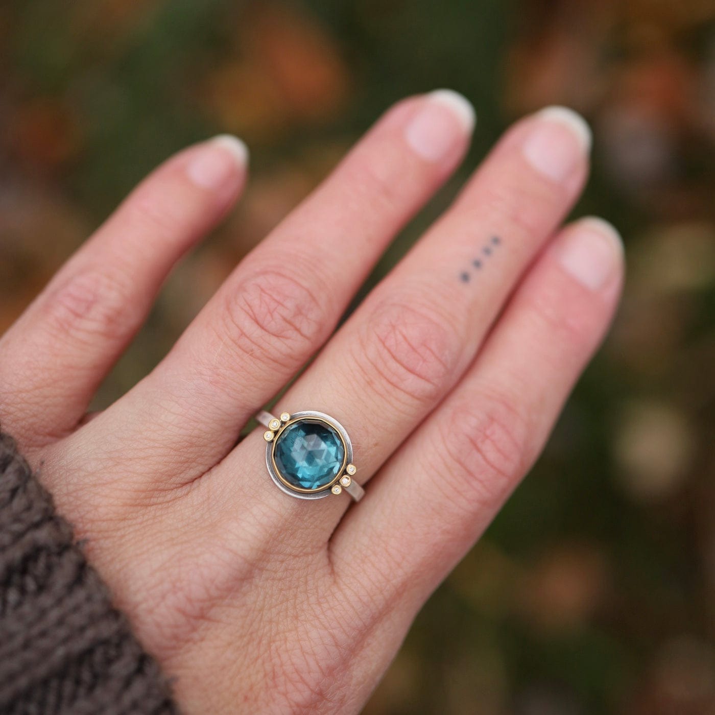 A glowing, rose cut London blue topaz is wrapped in warm 22k gold, and accented with a pair of sparkling diamond trios. This stone has a lovely color, a luminous and sparkly deep blue.