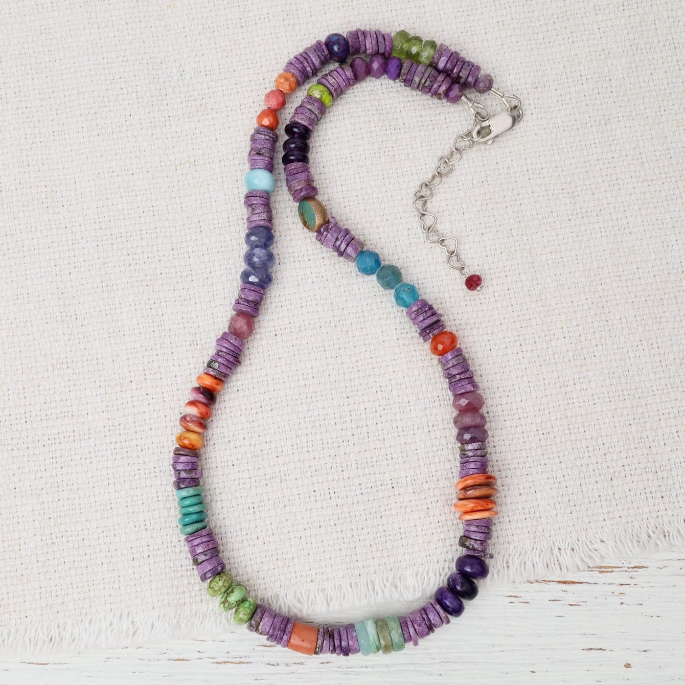 Vibrant and full of character, this one-of-a-kind necklace showcases natural charoite heishi beads accented by an array of colorful gemstones including turquoise, carnelian, amethyst, and green opal. Each bead brings its own texture and hue, creating a joyful, artful piece that’s truly unique. Finished with a sterling silver clasp and extender for adjustable wear.