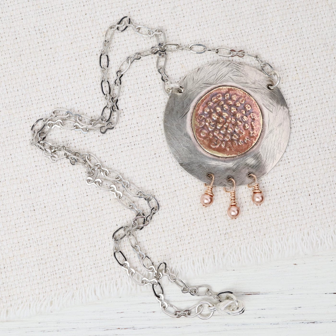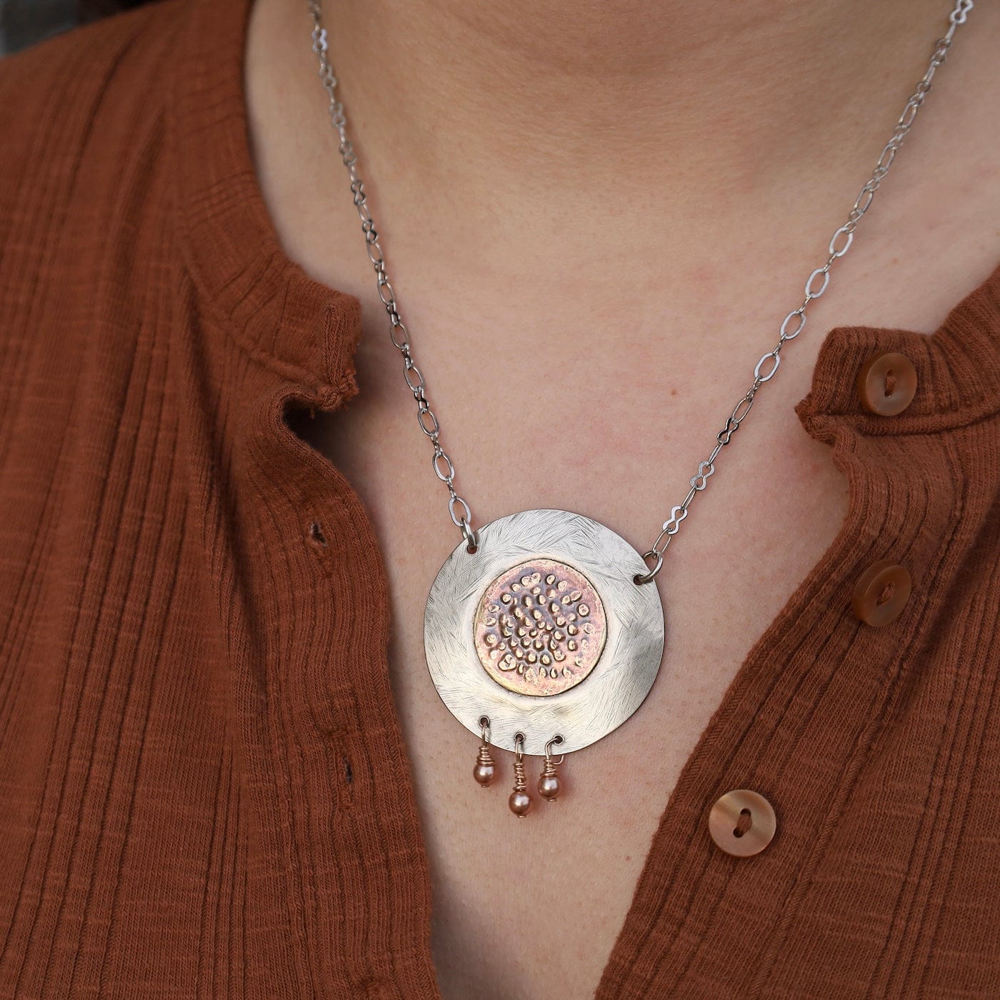 The Aztec Sun Necklace radiates warmth and artisan character, blending mixed metals and soft pearl accents into a striking, symbolic centerpiece. Its textured design and handcrafted feel make it a beautiful statement piece for everyday wear or special occasions.