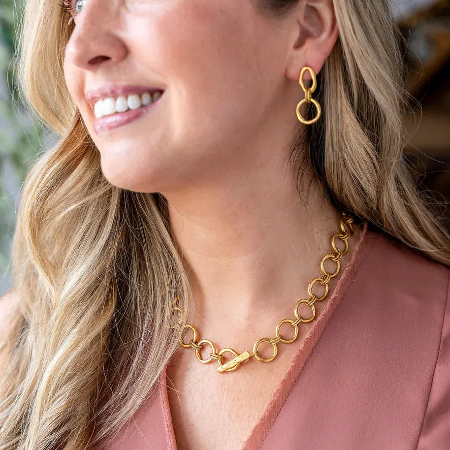 Sculptural and endlessly versatile, this matte gold necklace from the Sculpted Circle series is designed to adapt to your style. Hand-formed open links in two sizes are joined by rope-textured connectors, creating a bold yet balanced design with beautiful movement and texture. Wear it with the larger sculpted circles facing forward for a statement look, flip it to highlight the smaller links and toggle clasp for a more refined feel, or style it as a lariat by adjusting the clasp to suit your neckline. Thoughtfully designed to offer multiple looks in one striking piece.