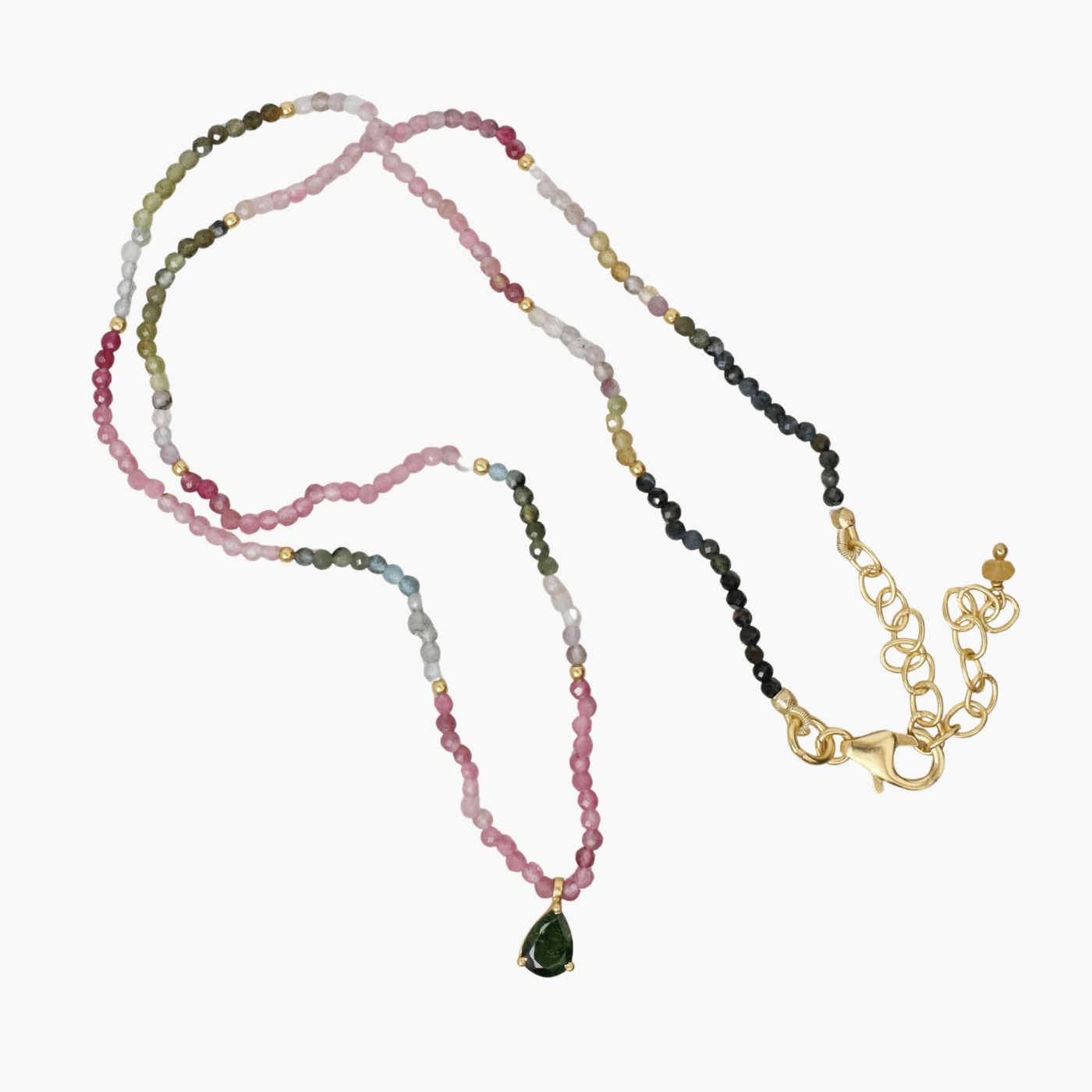 A delicate celebration of color, this necklace features a strand of petite faceted tourmaline beads in soft pinks, greens, and blues, accented with warm gold details. At the center glows a deep green tourmaline teardrop, adding richness and grounding energy to the pastel palette. Elegant, joyful, and easy to layer — a gemstone treasure in a petite profile.