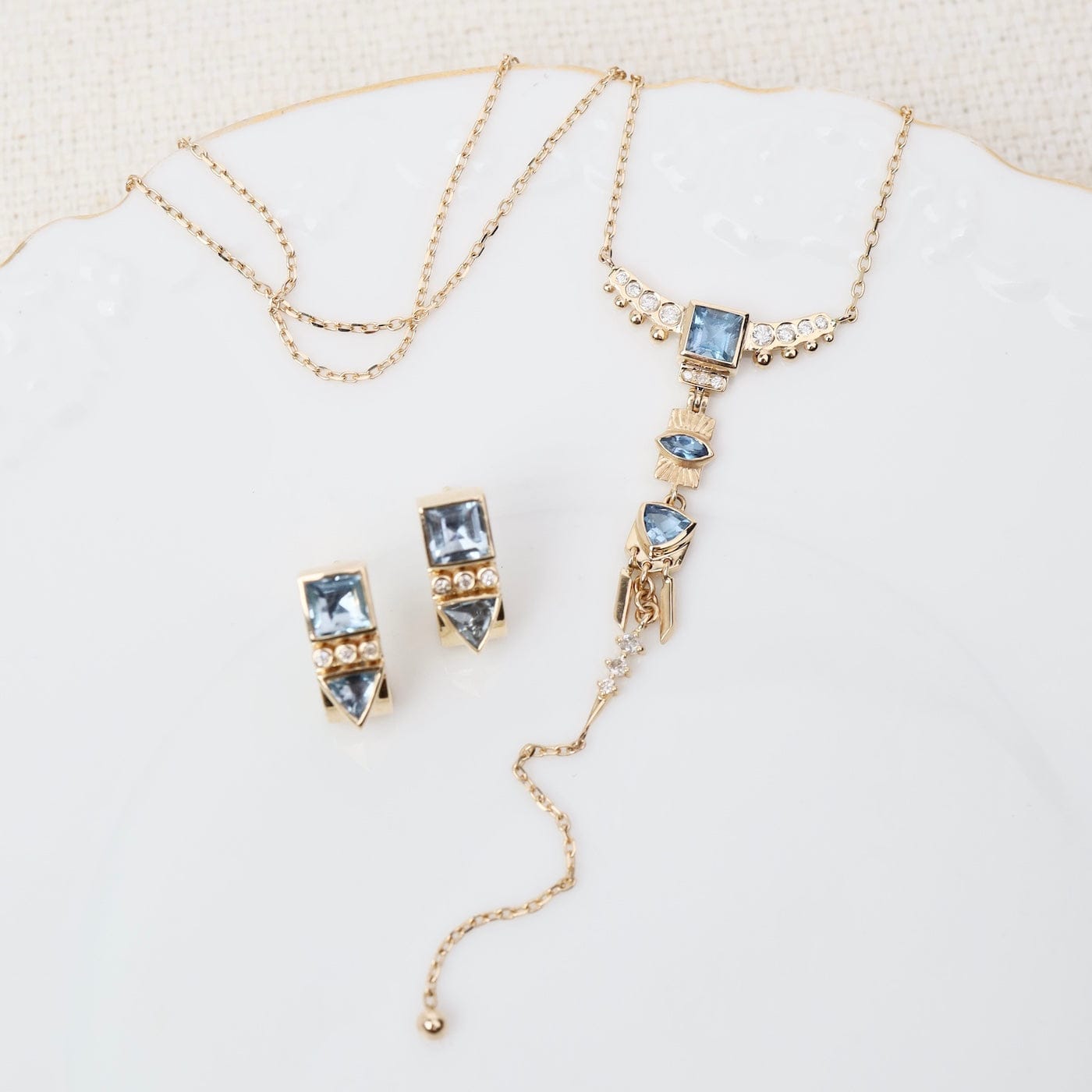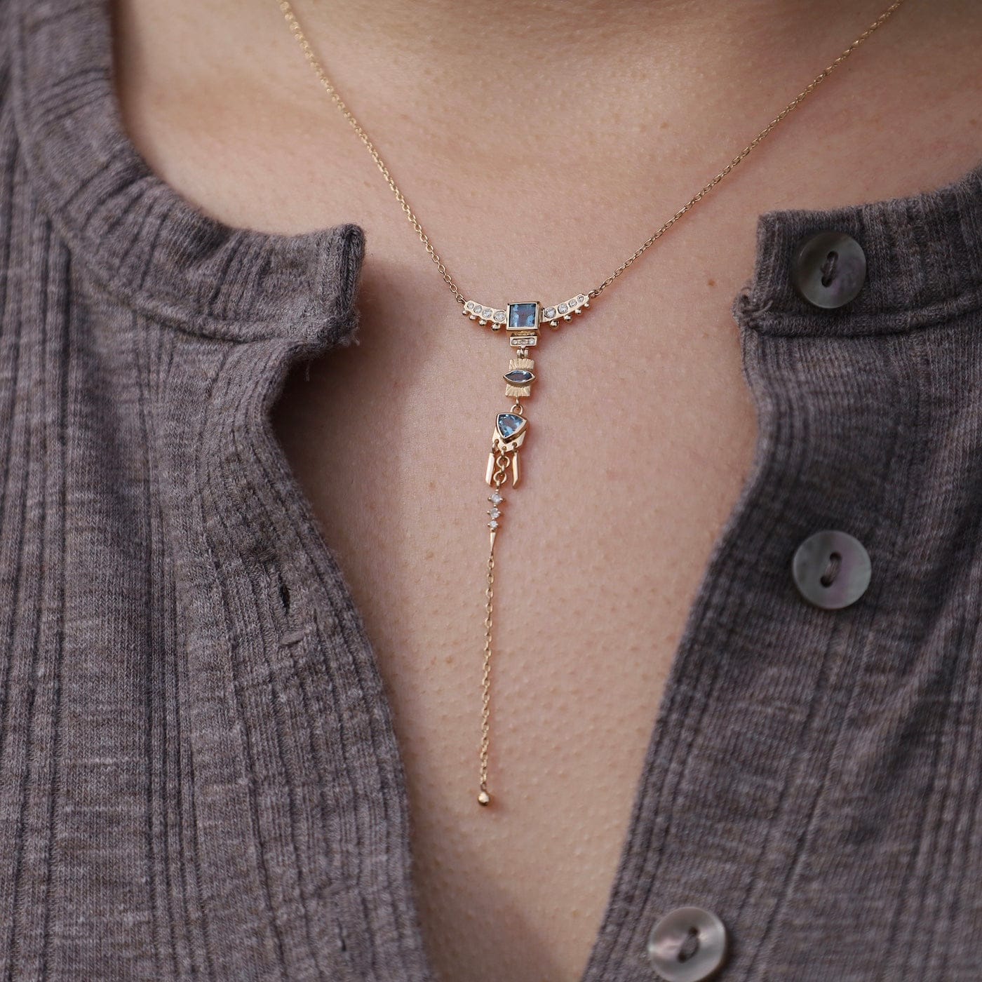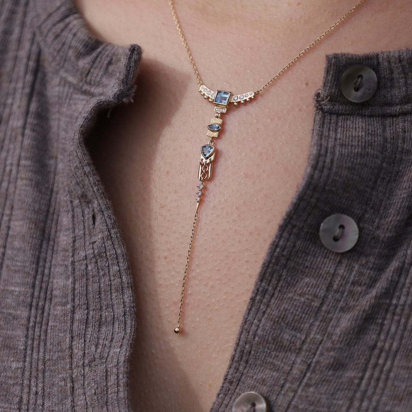 A celestial cascade of aquamarine and diamonds forms this luminous 14k gold lariat necklace. Each geometric aquamarine is artfully arranged in a totem-like composition, accented by pavé diamond wings and a slender golden drop that moves gracefully with you. A statement of balance, beauty, and tranquil energy, perfect for layering or wearing solo.