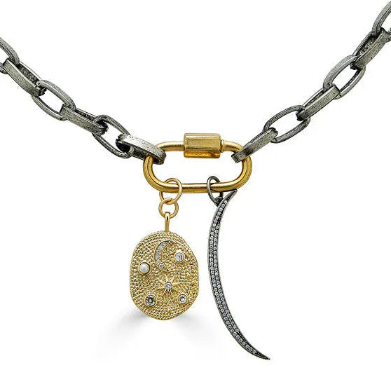 Bold and celestial, this statement necklace features chunky matte silver paperclip links paired with a contrasting gold carabiner clasp. Two symbolic charms—a pavé crescent moon and a textured star medallion—add sparkle and meaning, creating a modern piece that stands beautifully on its own or layered with other chains.
