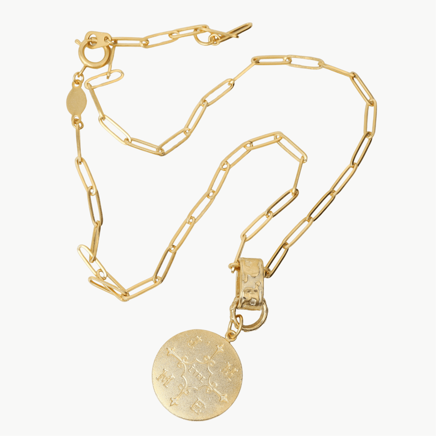 This beautifully detailed French-inspired pendant brings an old-world charm to a modern paperclip chain. The etched medallion hangs from an engraved bail and textured ring, creating a layered, heirloom look that’s effortless to wear—whether styled solo or paired with other chains.