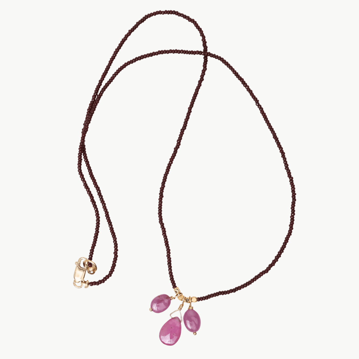 Rich brown seed beads create a warm backdrop for a vibrant cluster of pink sapphires, each stone adding a soft pop of color and sparkle. Gold vermeil accents bring a refined glow, making this necklace an elegant everyday piece with a touch of romance.
