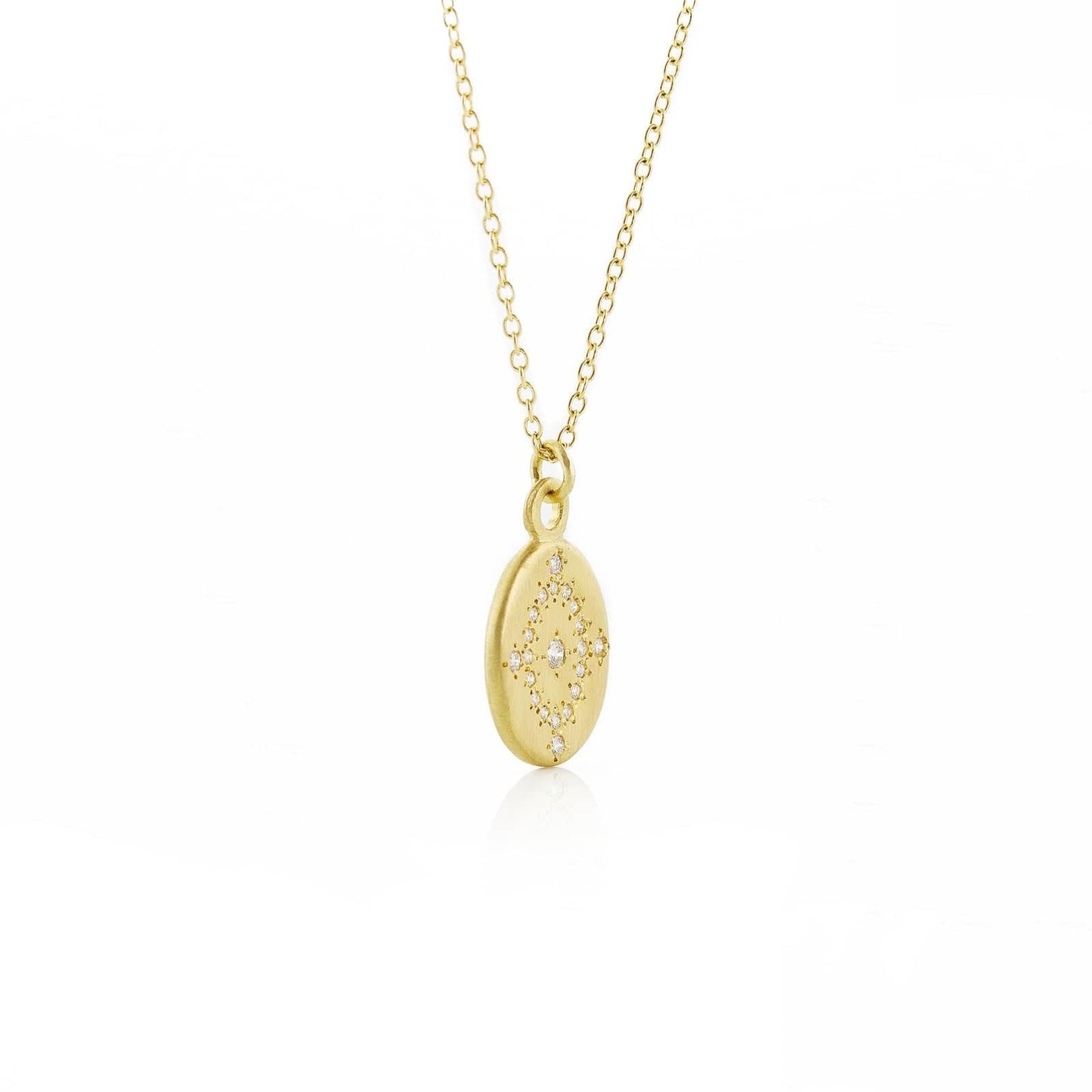The Daydream Pendant pairs luminous elegance with delicate detail. An oval drop, framed in a radiant starburst of hand-set diamonds, sways gently from a fine 18k gold chain. It captures quiet brilliance and effortless grace, a refined balance of sparkle and softness.