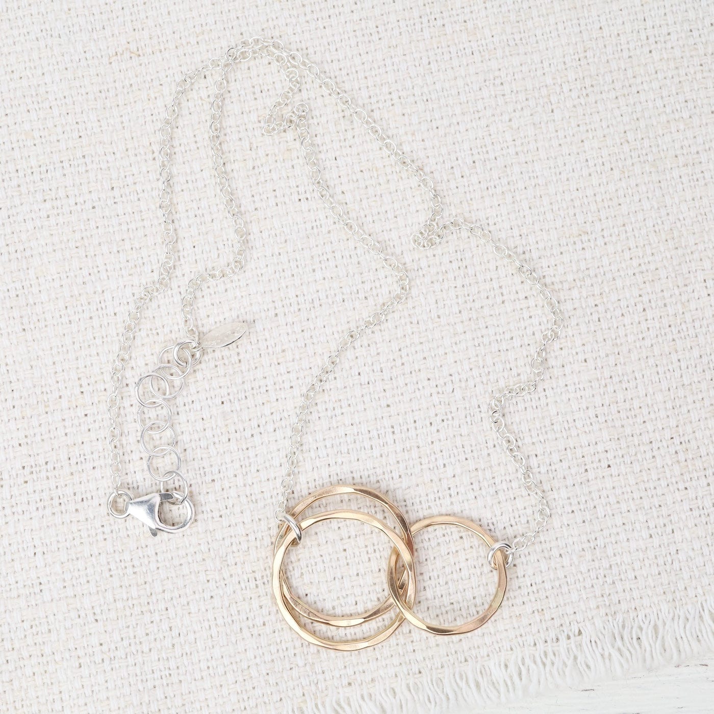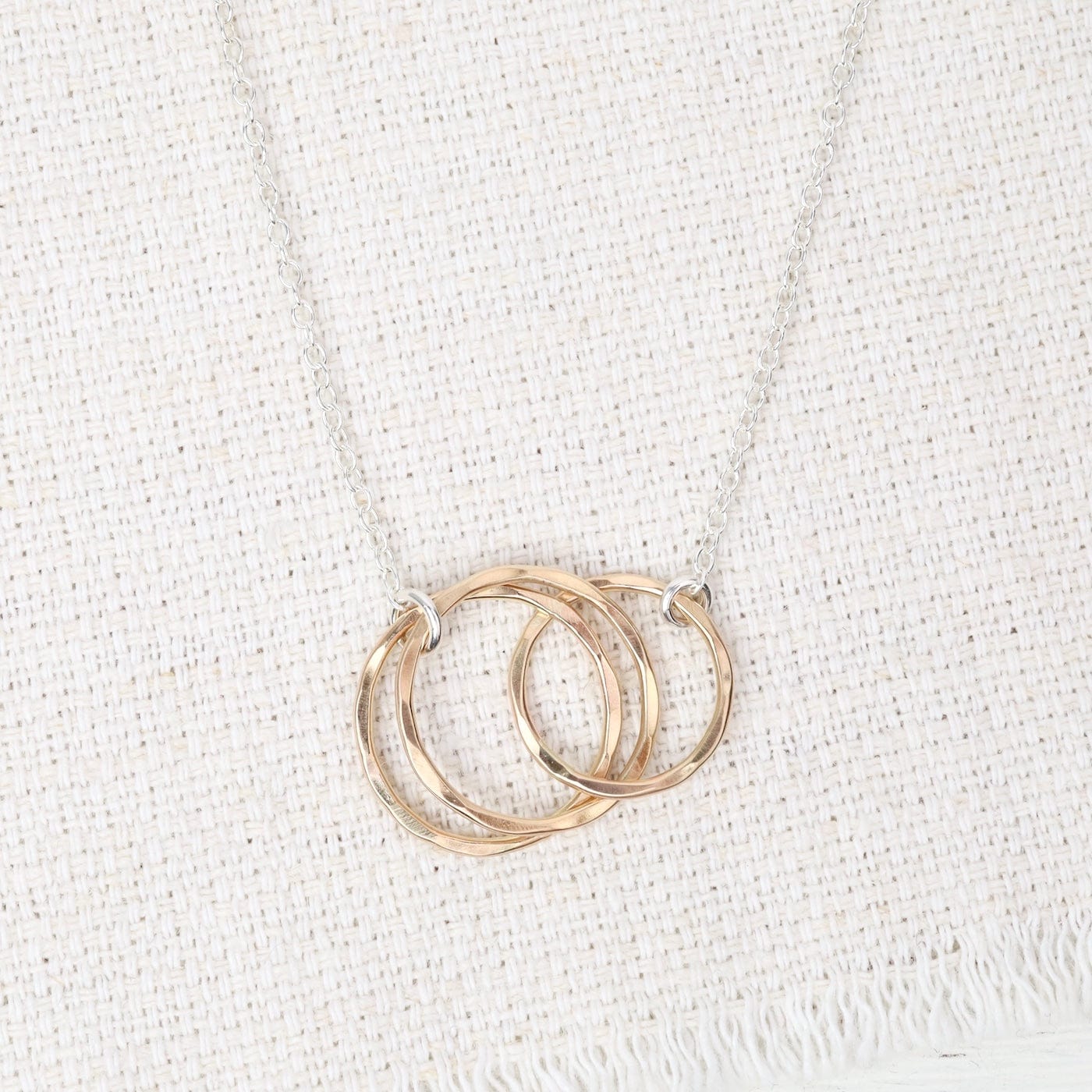 Three interlocking 14k gold-filled circles shimmer with subtle texture, representing unity and enduring connection. Suspended from a sterling silver cable chain, this hand-forged design blends warmth and strength in perfect harmony—ideal for daily wear or meaningful gifting.