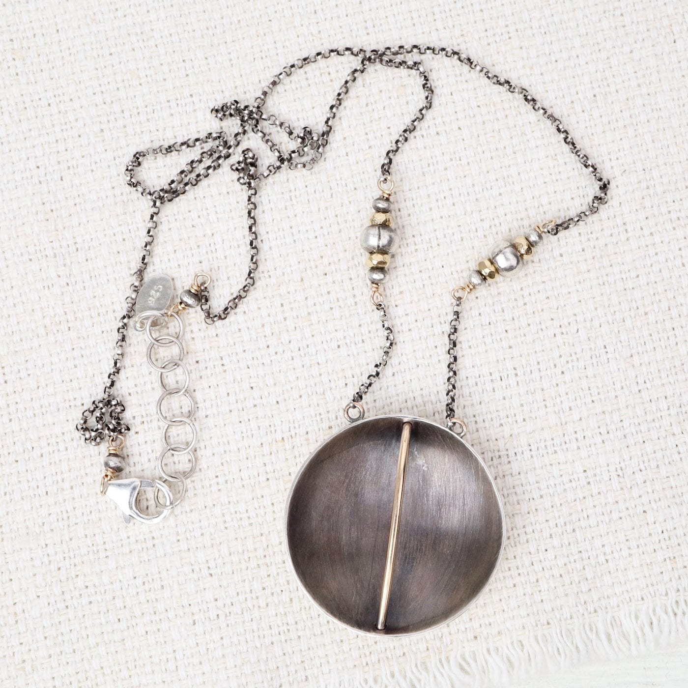 A striking balance of light and shadow, this necklace features a cupped oxidized sterling silver disc split by a radiant 14k gold-filled line—symbolizing harmony in contrast. Suspended on a beaded sterling silver chain, it’s an artful expression of modern elegance and refined craftsmanship.