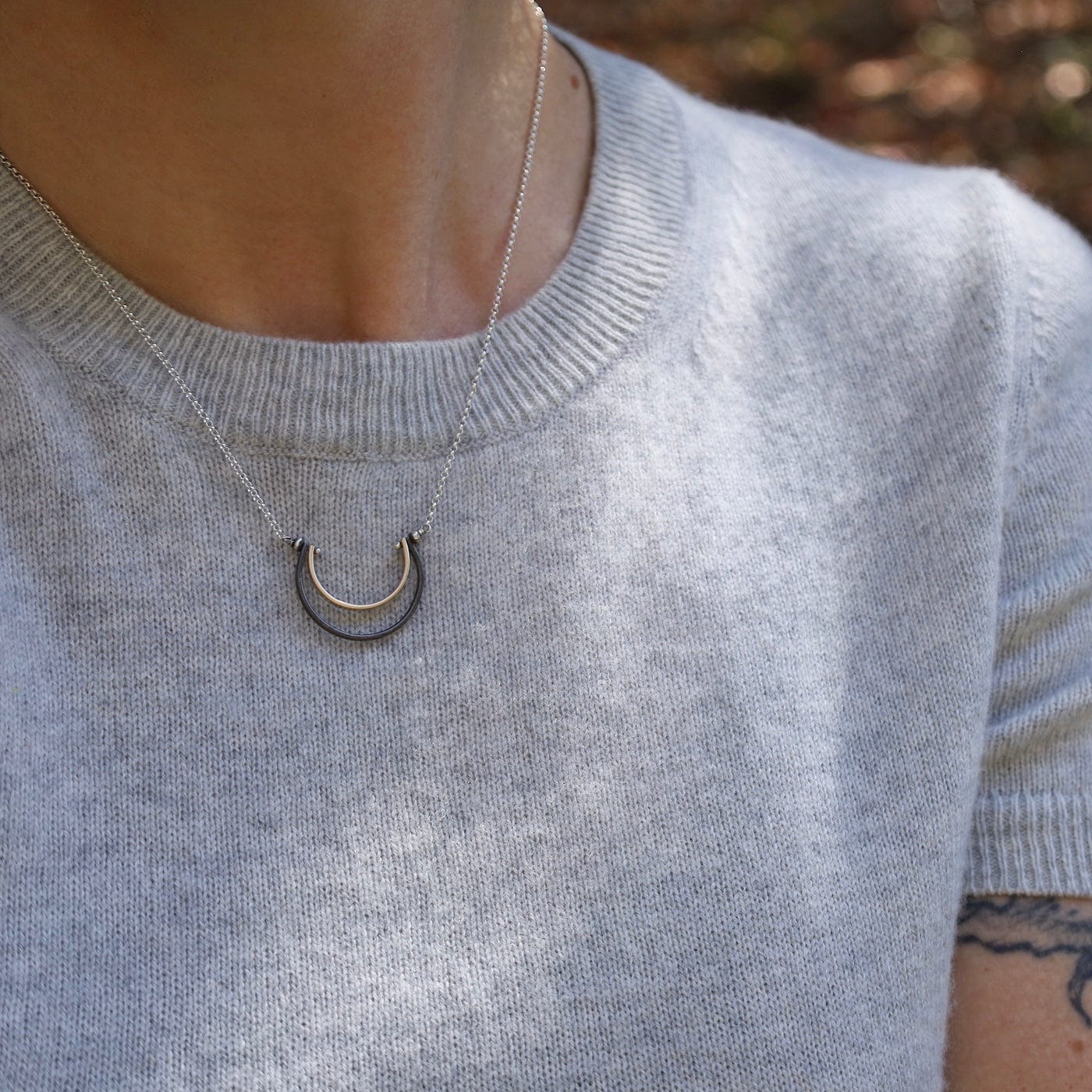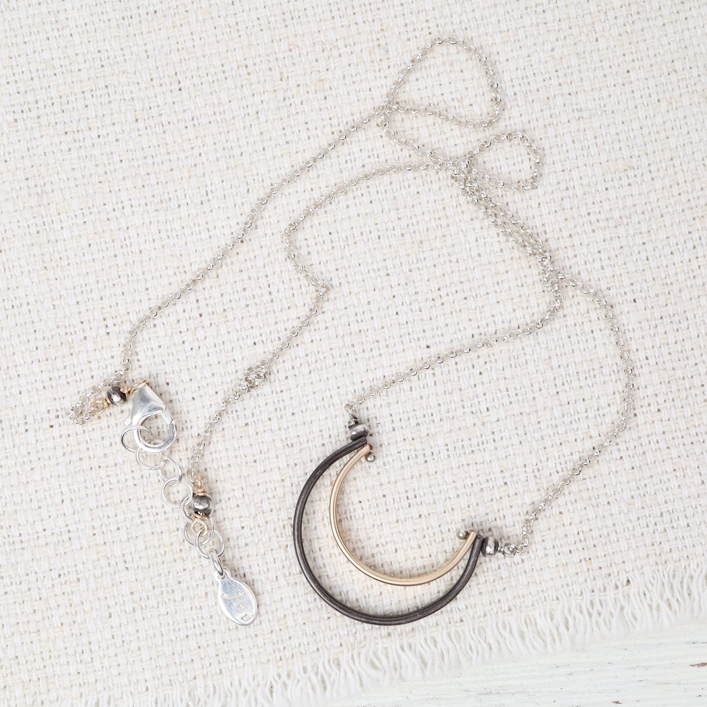 A celestial-inspired design that balances contrast and form. This necklace features interlocking arcs of warm gold fill and oxidized sterling silver, creating a sleek and modern crescent motif that rests gracefully along the collarbone. Finished with a delicate sterling silver chain and secure lobster clasp.