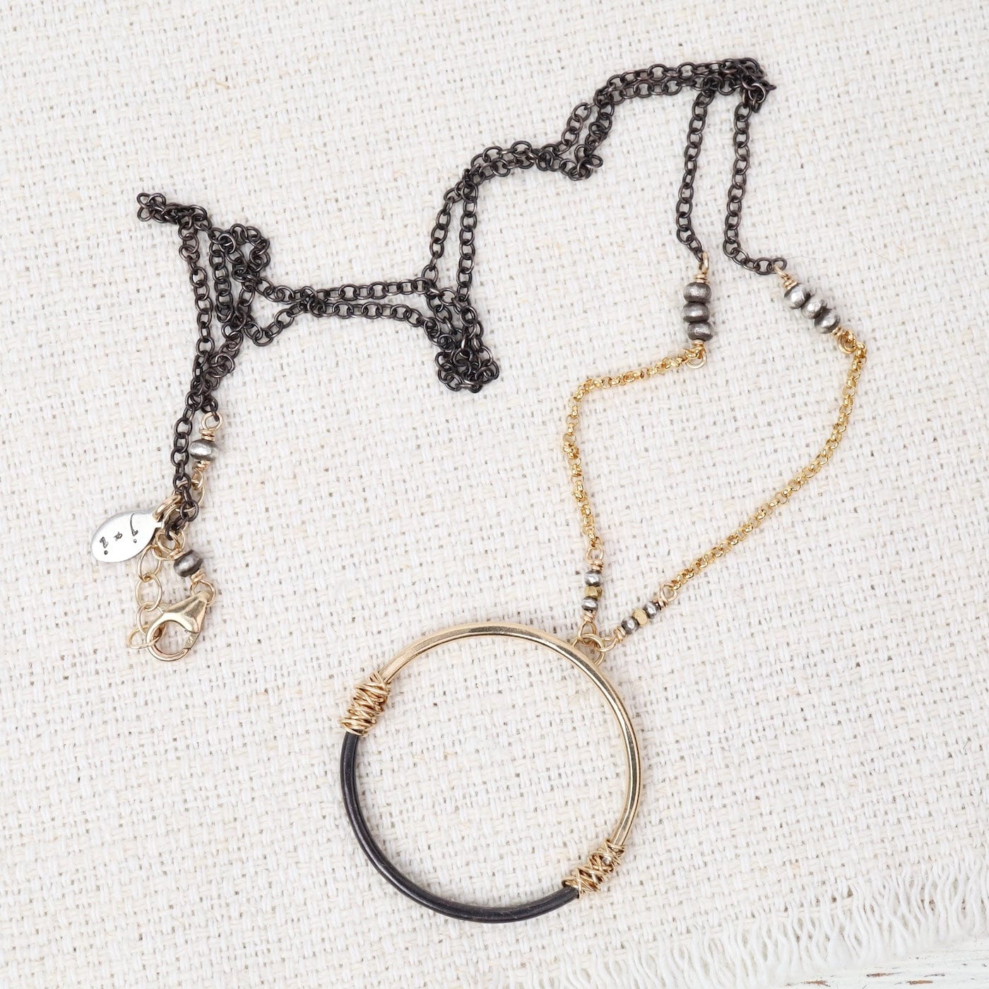 Sleek and versatile, this necklace pairs oxidized sterling silver with warm gold fill for a striking mixed-metal balance. The hand-wrapped circular pendant adds sculptural texture, while the beaded chain detail enhances its modern artistry. Perfect for layering or wearing solo as a statement of understated elegance.