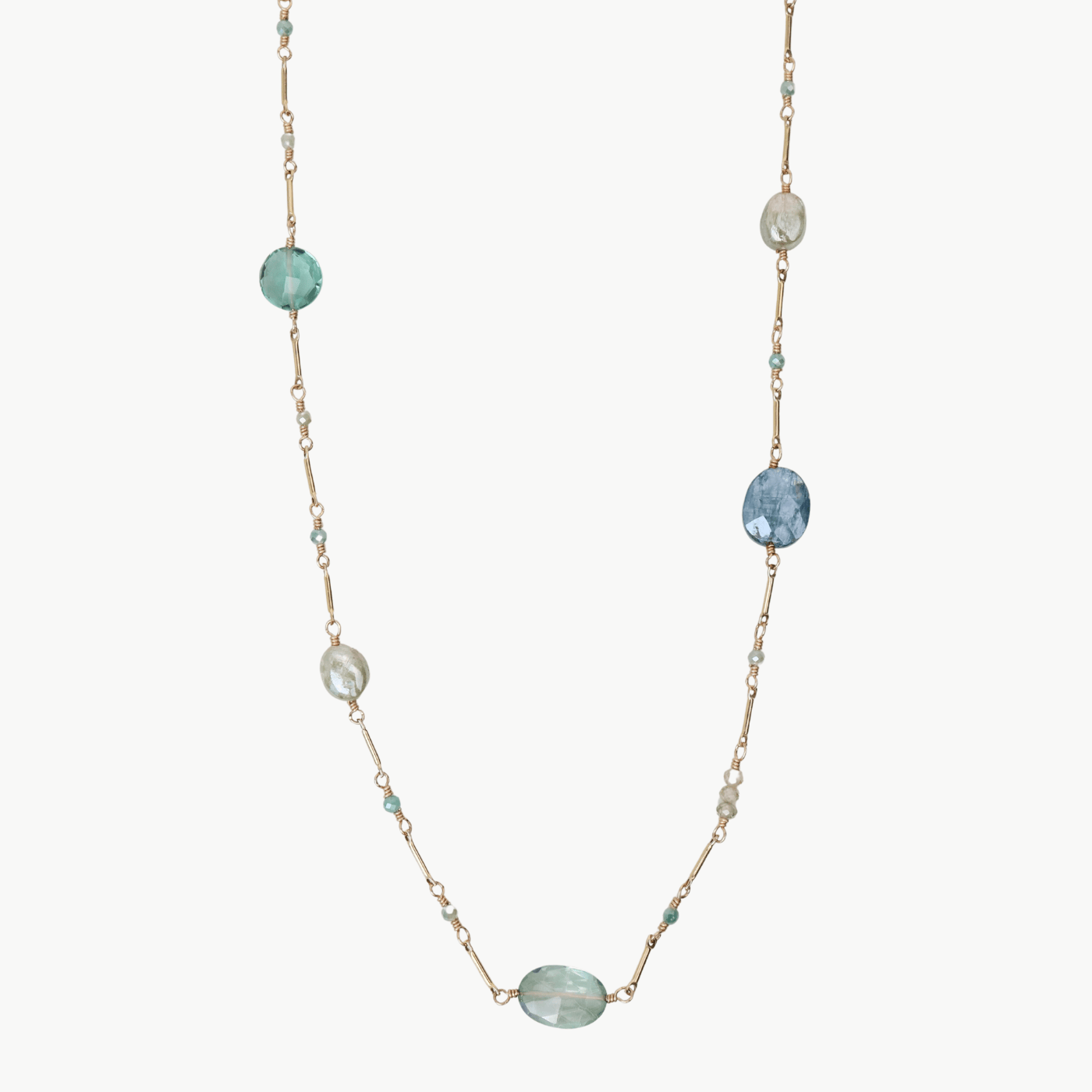 A long, luminous layering piece showcasing a serene mix of soft greens and blues. Faceted stones are spaced along a gold-filled bar-link chain, adding subtle sparkle and graceful movement. Wear it long or double it—this versatile design brings an effortless, elegant finish to any look.