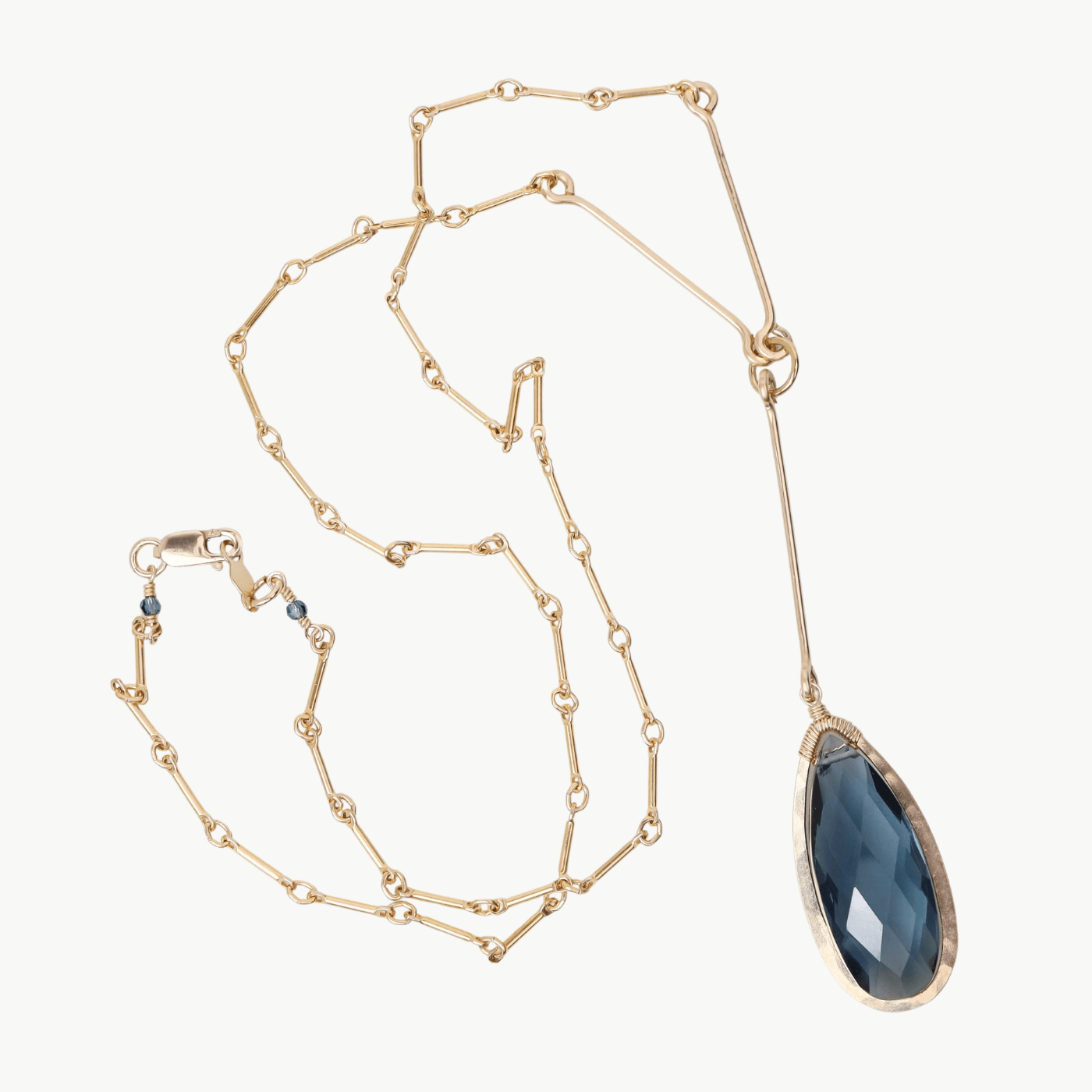 A sleek gold-filled bar link chain leads to an elongated drop of richly faceted London Blue Quartz, framed in darkened silver for a touch of contrast. The extended pendant creates an elegant, modern silhouette—refined enough for evenings out yet simple enough for everyday wear.