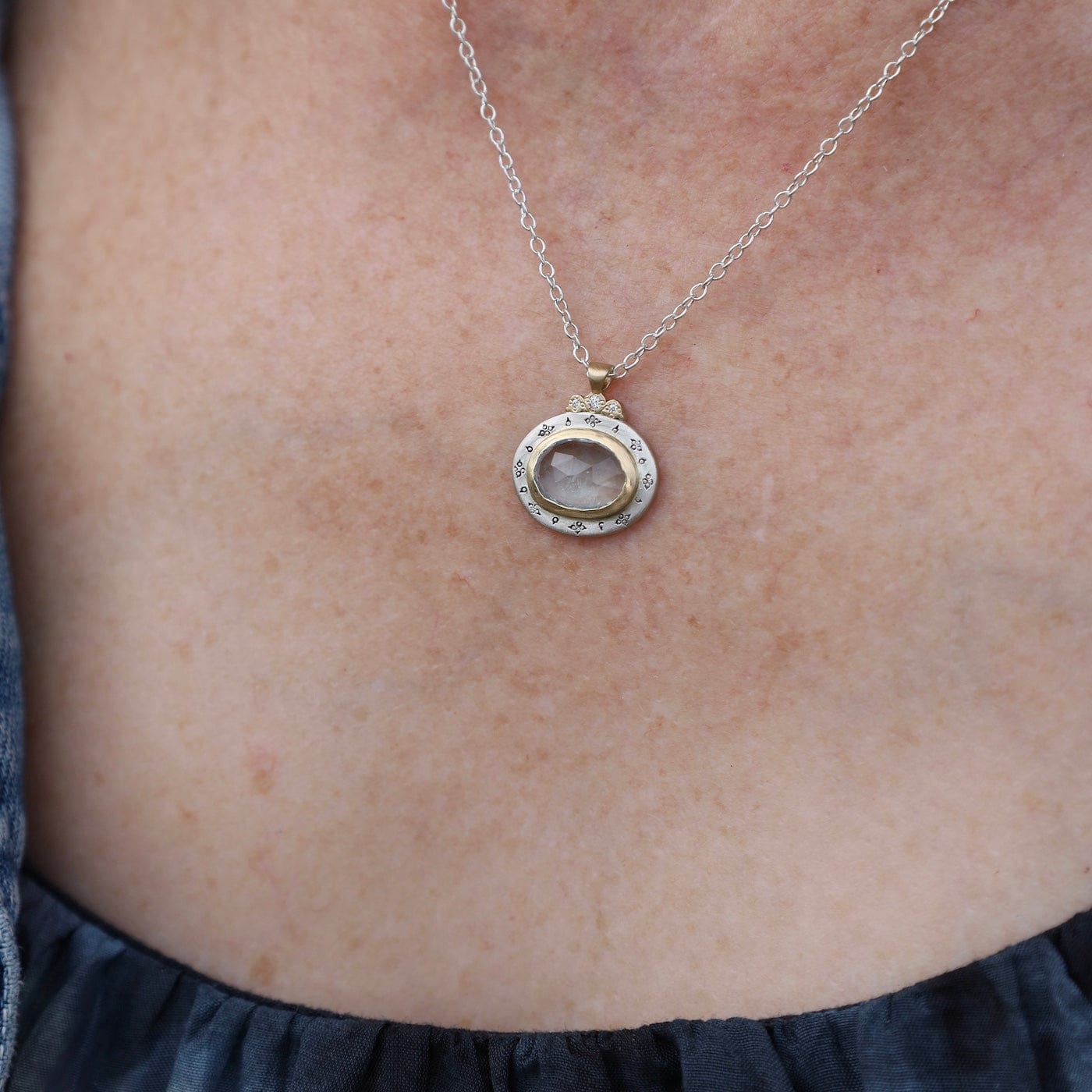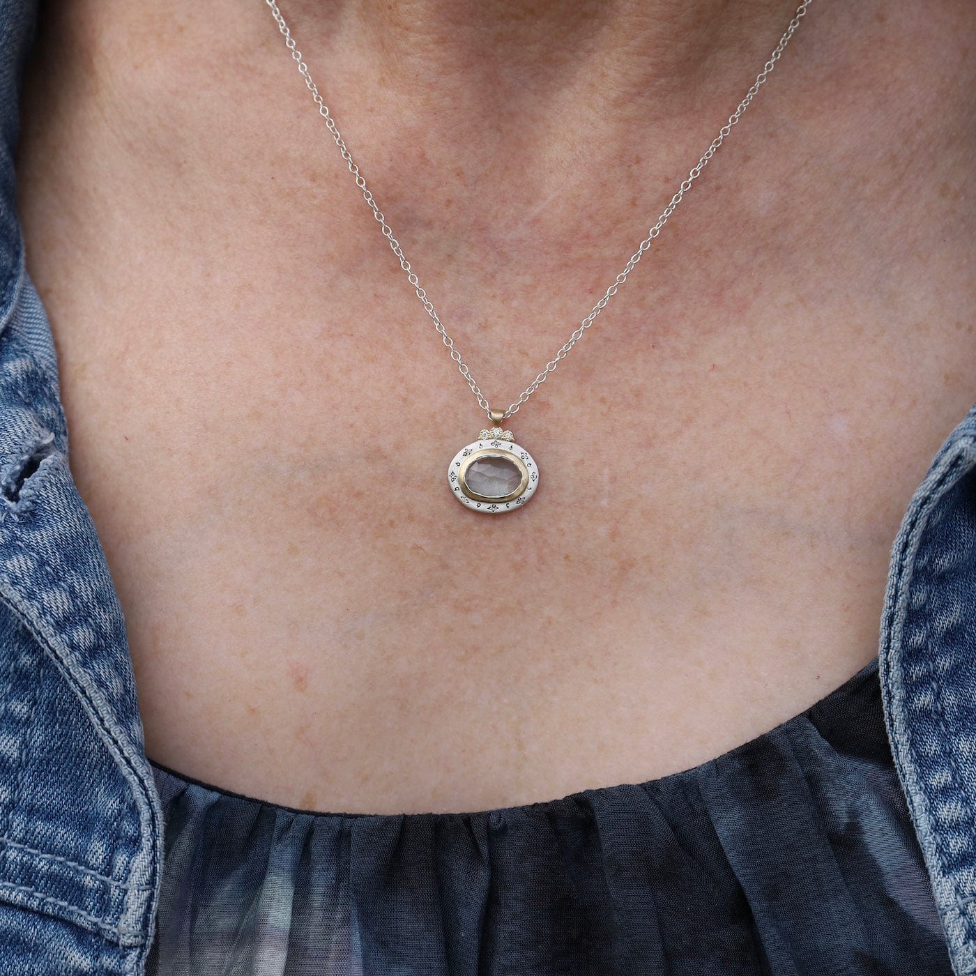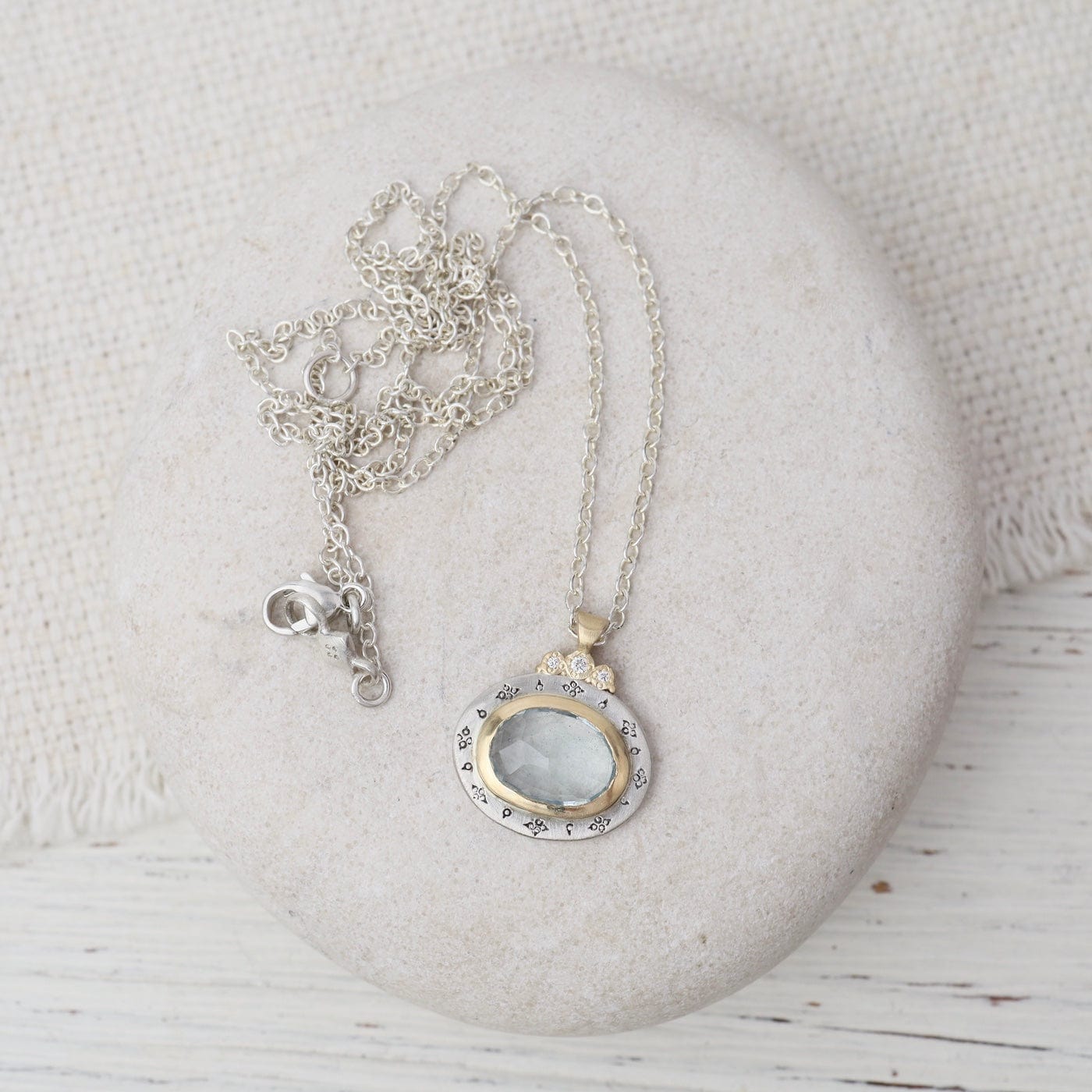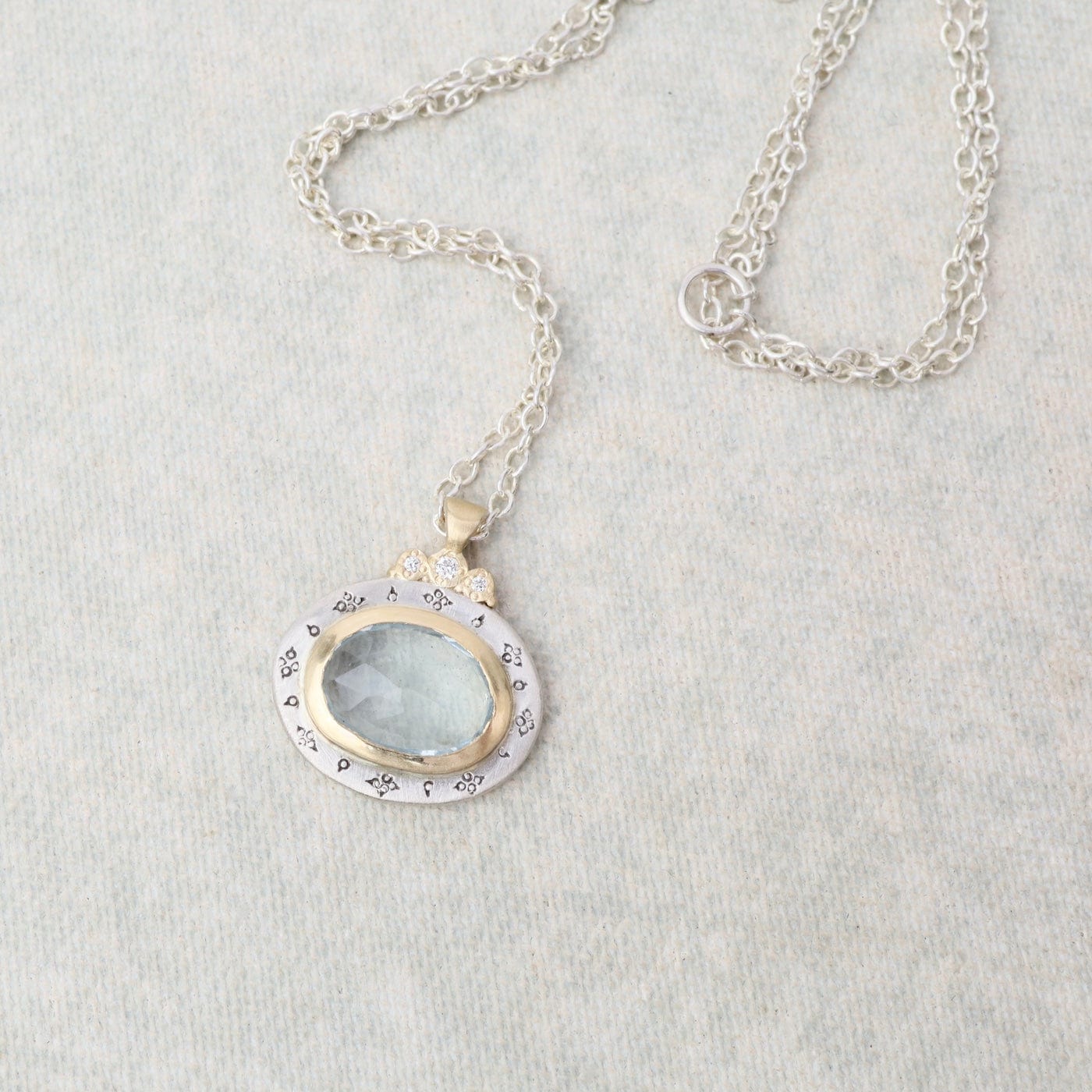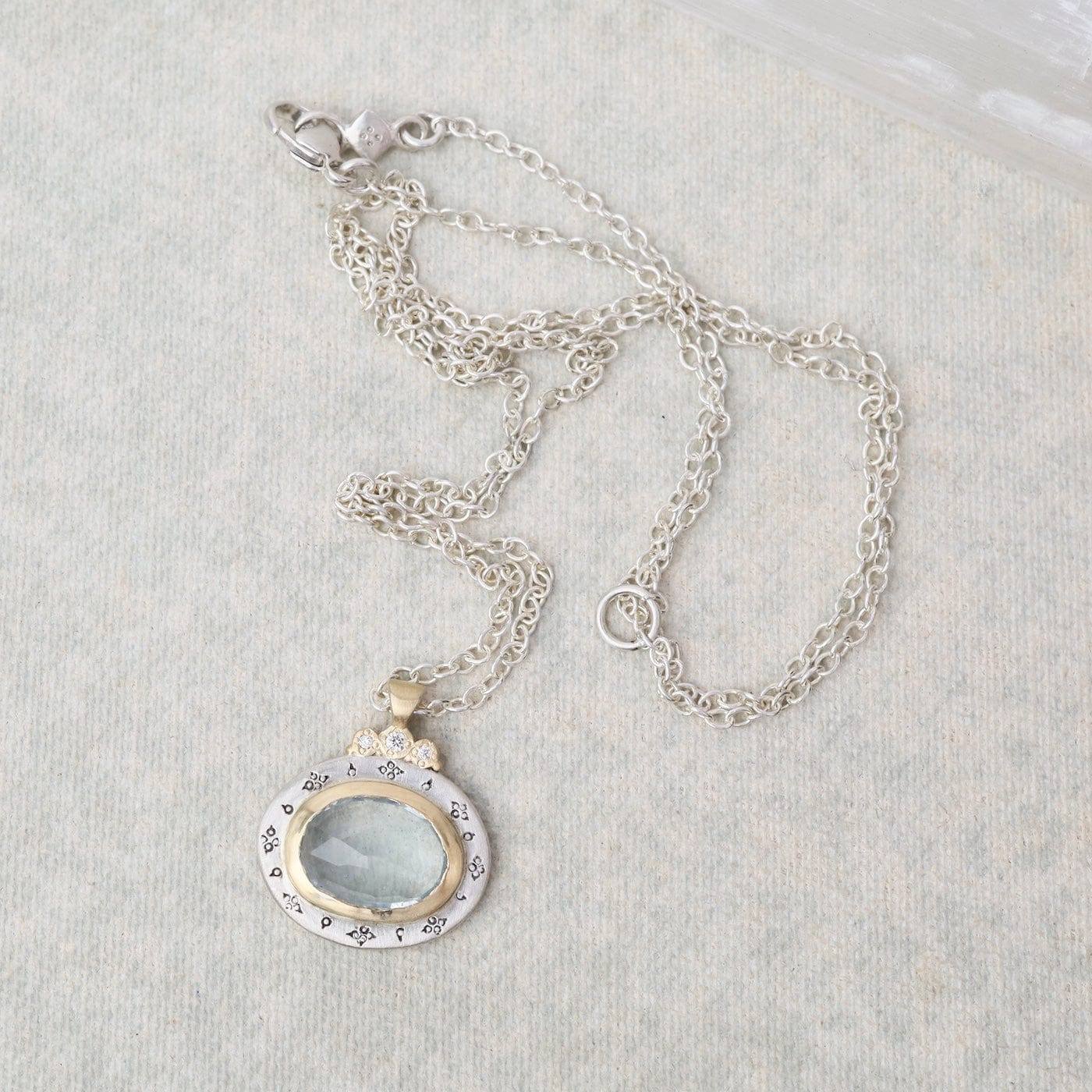 This one-of-a-kind handmade necklace features a faceted oval aquamarine that shimmers with soft, oceanic blue tones. Framed in a rich 18k yellow gold bezel and set in sterling silver, the pendant is finished with delicate hand-etched details that add an extra layer of charm. Suspended from a sterling silver chain, it’s a beautifully balanced piece—elegant, unique, and effortlessly wearable.