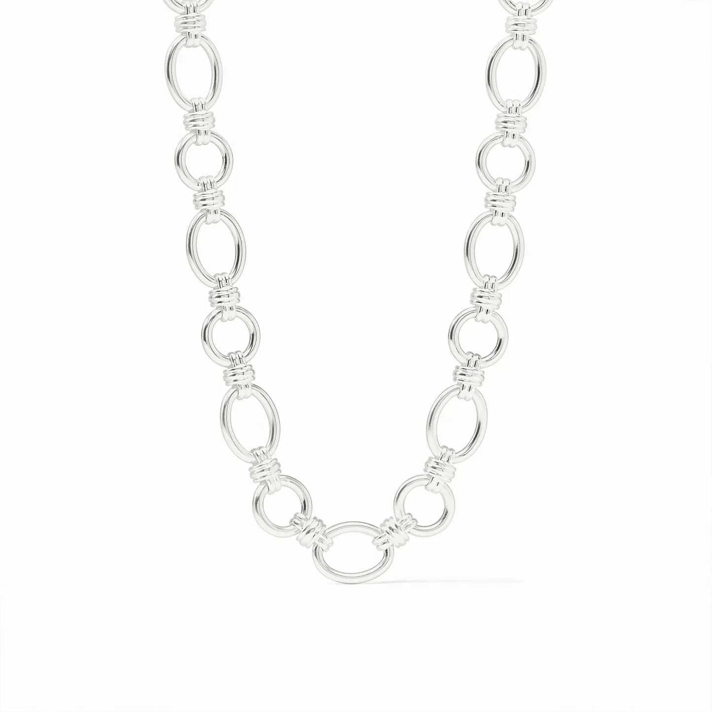 Polished and sculptural, this statement link necklace brings a refined edge to everyday styling. The open circular links are accented with delicate wrapped detailing, creating texture and movement while maintaining a clean, modern silhouette. Finished in luminous silver plate, it’s a versatile piece that elevates both casual and dressier looks.