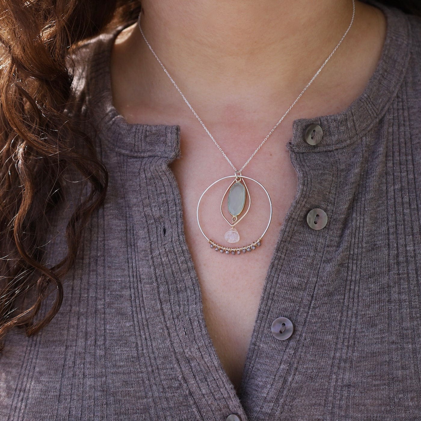 Soft hues and graceful geometry come together in this layered pendant necklace. A faceted chalcedony is framed in gold-filled wire, accented by a moonstone drop and labradorite beads along a silver hoop. Delicate yet distinctive, this piece adds a serene, luminous touch to any look.