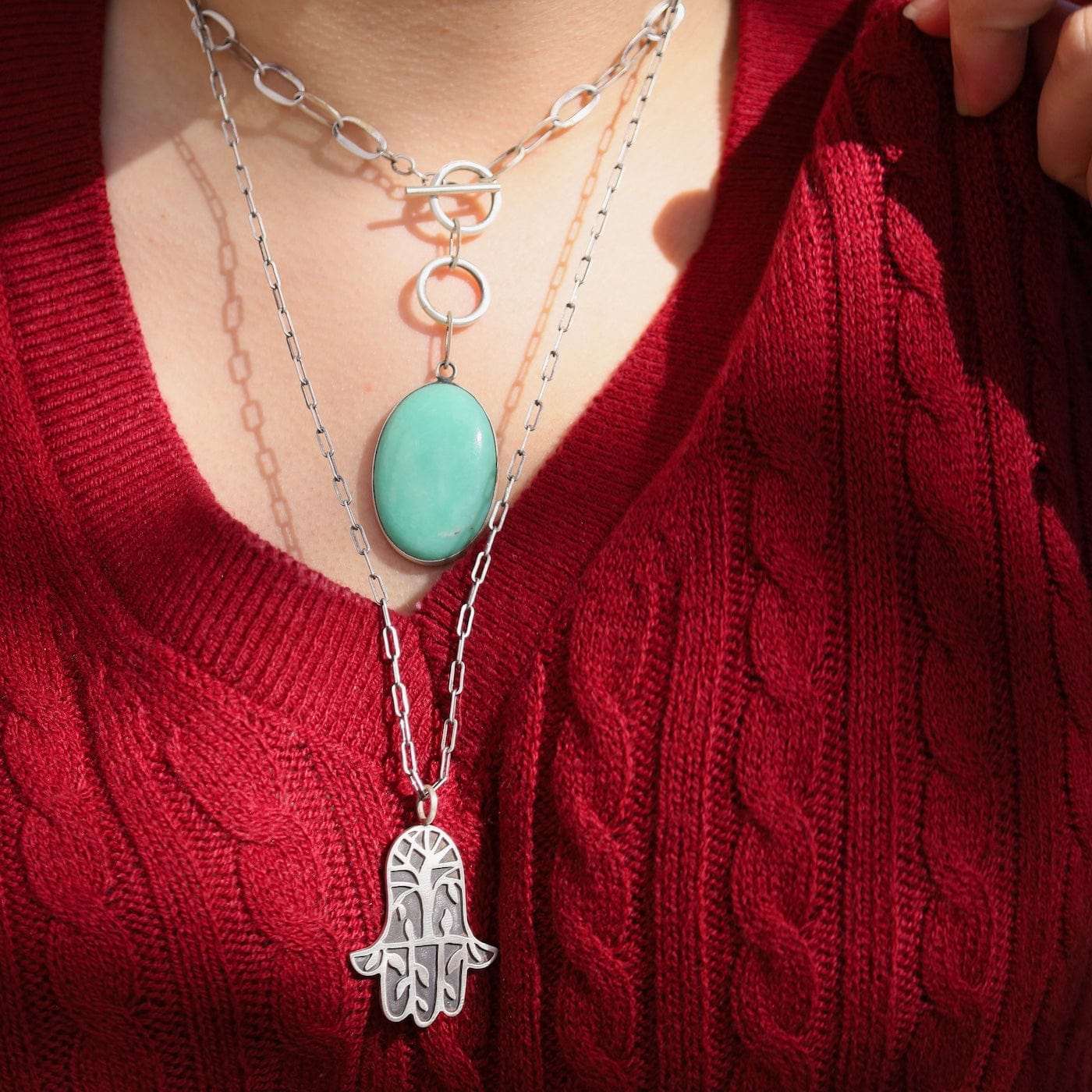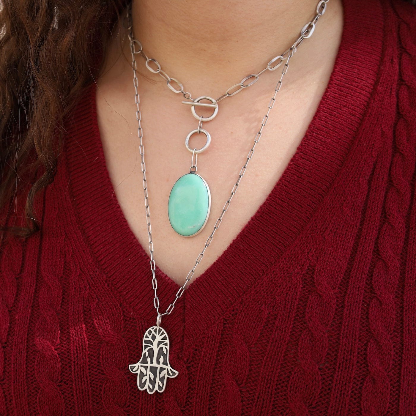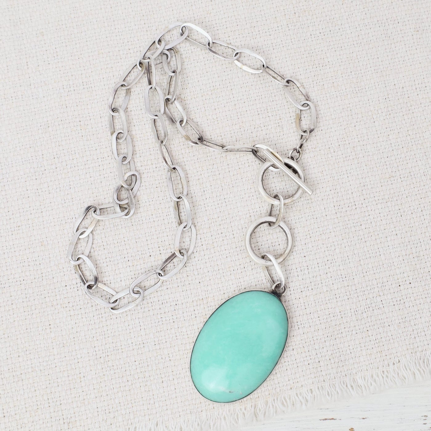 A stunning artisan-crafted necklace featuring a large oval chrysoprase cabochon suspended from a sculptural sterling silver toggle chain. Each link is hand-finished with a softly oxidized patina, creating a modern yet timeless look. The toggle clasp can be fastened at two lengths for versatile styling.