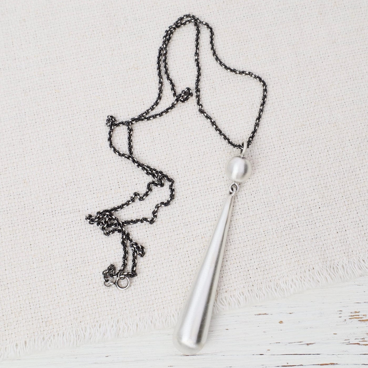Sleek and sculptural, this elongated teardrop pendant is paired with a rounded accent for a minimalist yet eye-catching design. Suspended from an oxidized sterling silver chain, it adds a touch of modern elegance to any look.