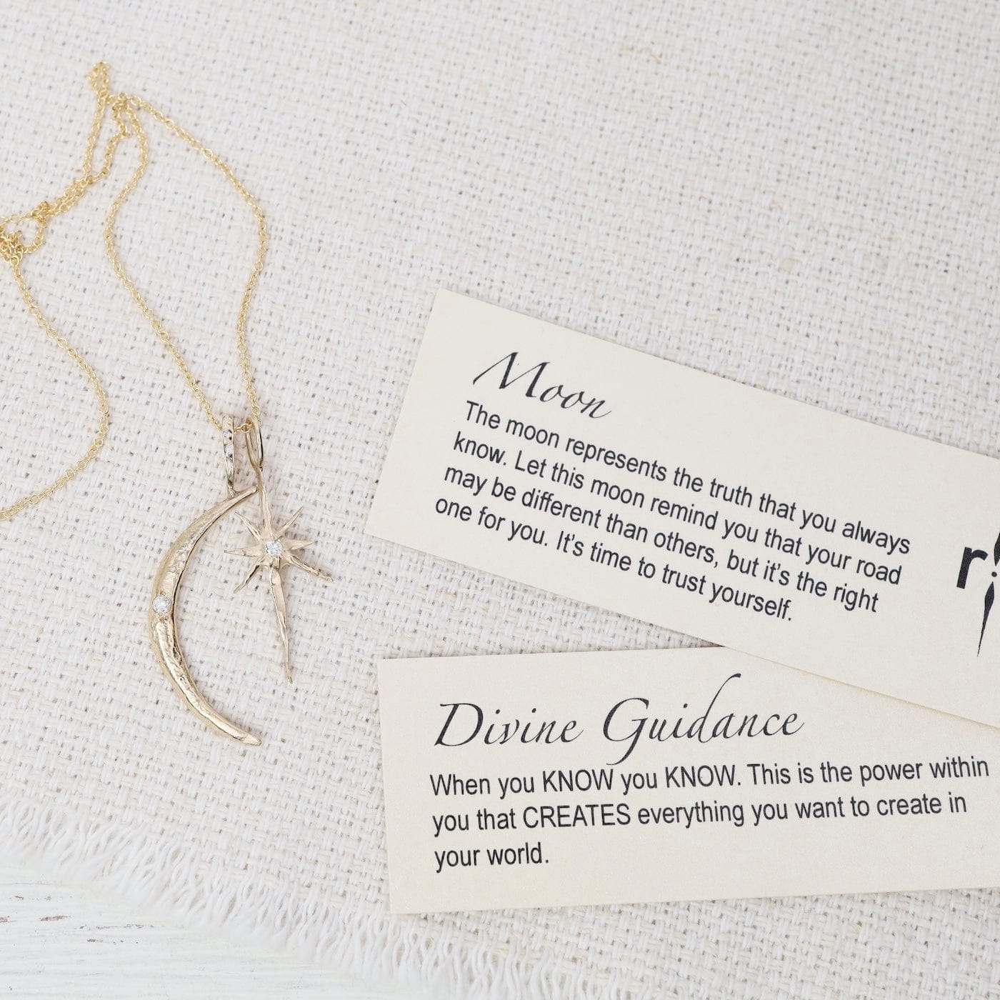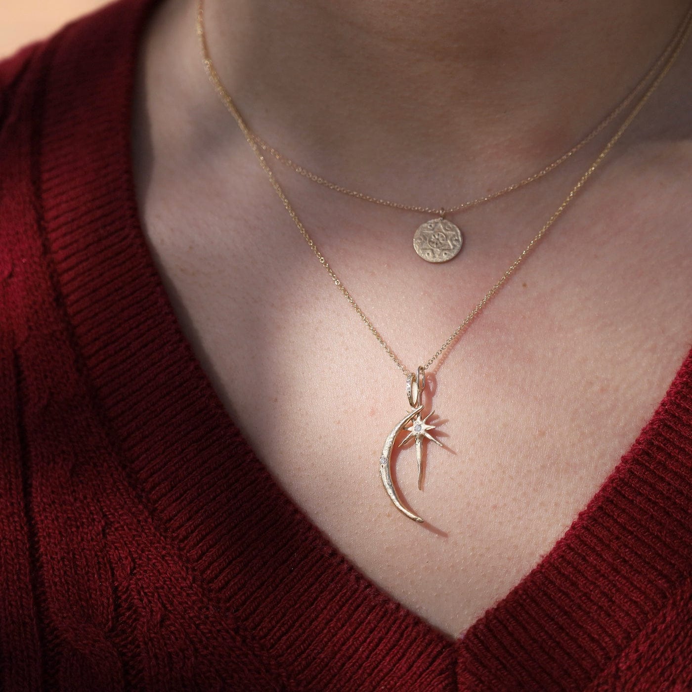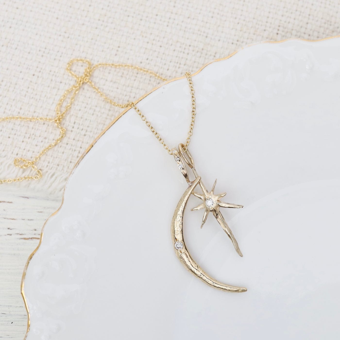 Radiating celestial elegance, this double-charm necklace pairs a luminous crescent moon with a radiant guiding star—each crafted in solid 14K gold and accented with sparkling diamonds. A diamond-set bail and fine 18" gold chain complete this symbolic piece, a reminder to trust your own light and the path it illuminates.