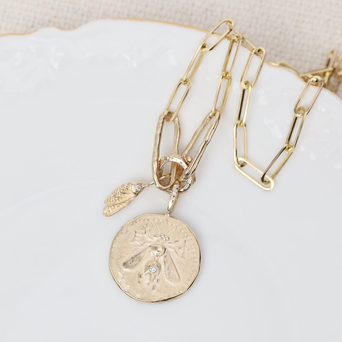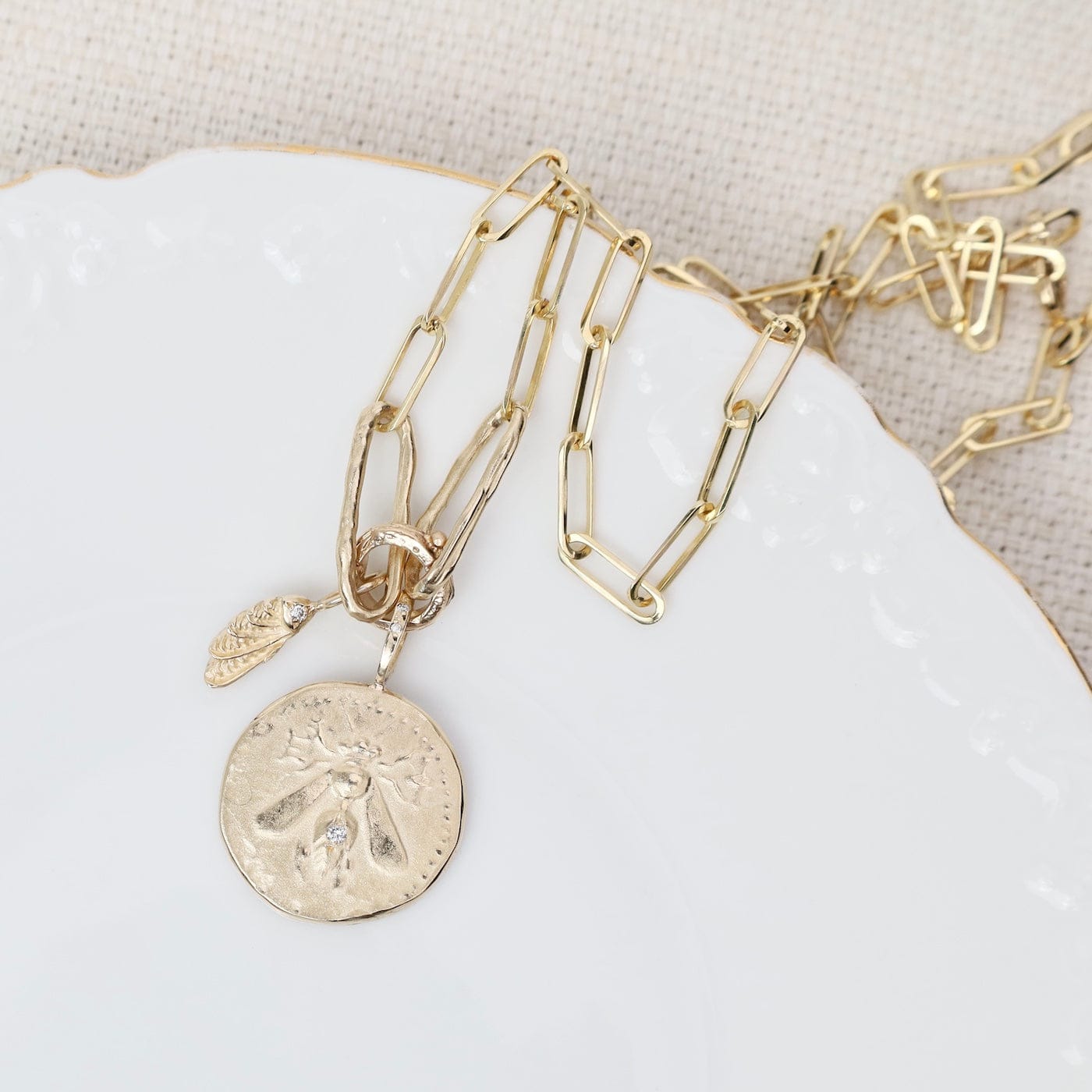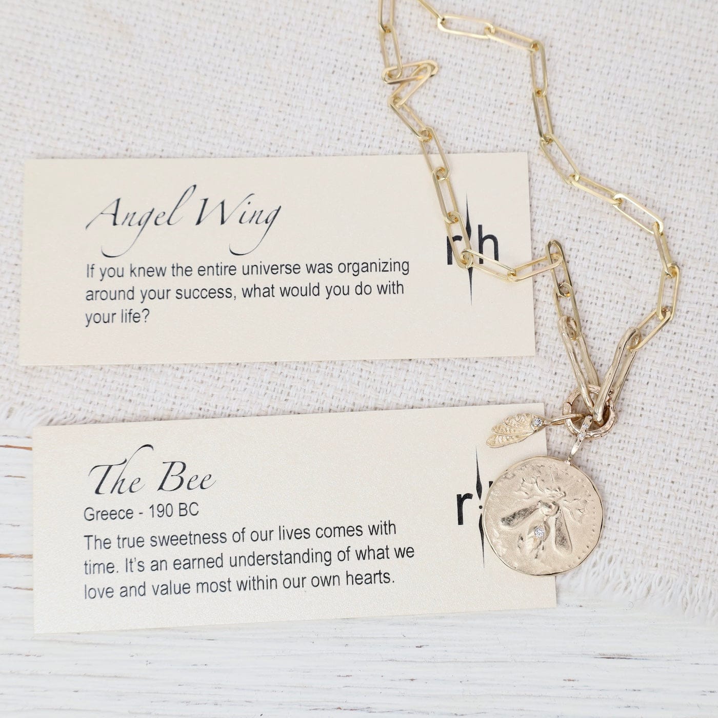 Handcrafted in solid 14K gold, this meaningful necklace features a beautifully textured Bee Artifact pendant accented with a sparkling diamond. A delicate angel wing charm and diamond-set bail add a touch of celestial grace. The pendant hangs from an 18" paperclip-style chain with a clasp ring designed to add or swap charms, inviting personal storytelling through layering and symbolism.