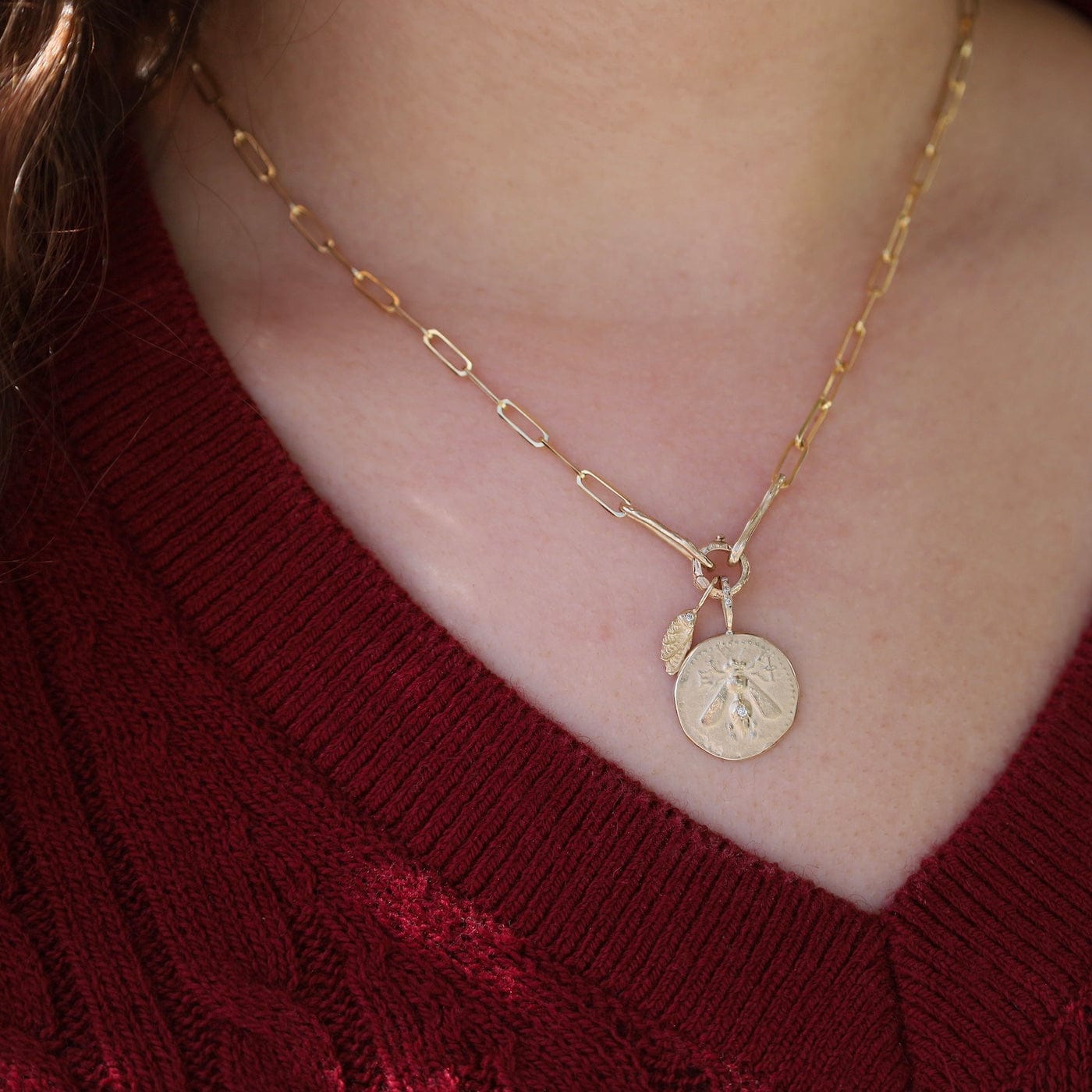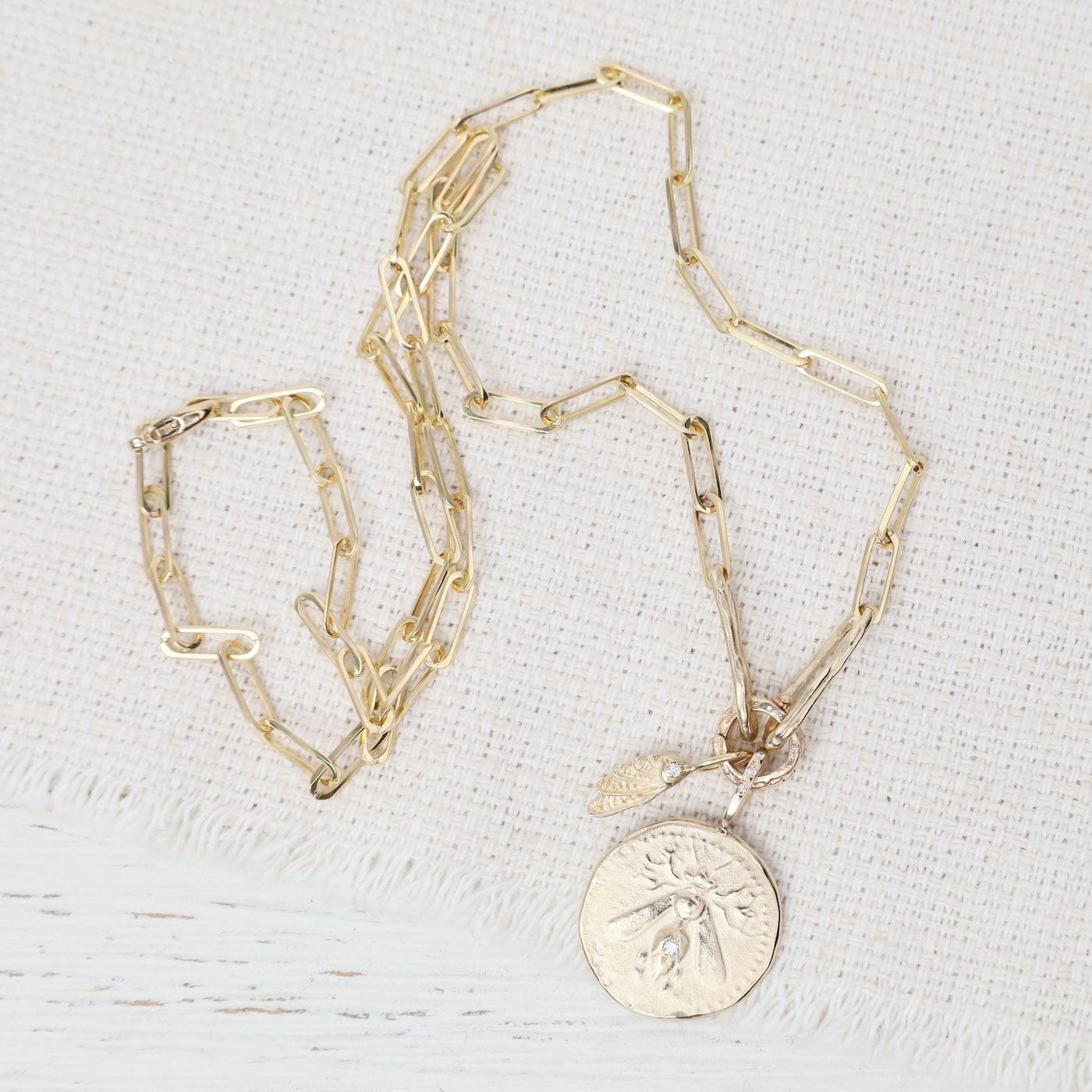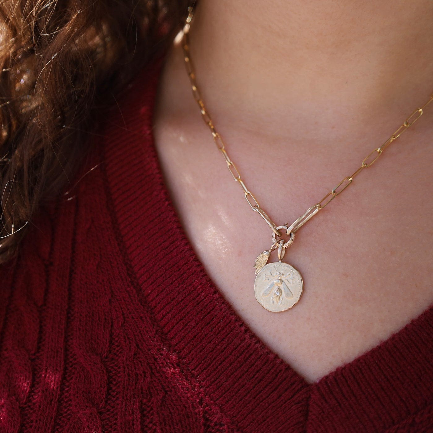 Handcrafted in solid 14K gold, this meaningful necklace features a beautifully textured Bee Artifact pendant accented with a sparkling diamond. A delicate angel wing charm and diamond-set bail add a touch of celestial grace. The pendant hangs from an 18" paperclip-style chain with a clasp ring designed to add or swap charms, inviting personal storytelling through layering and symbolism.