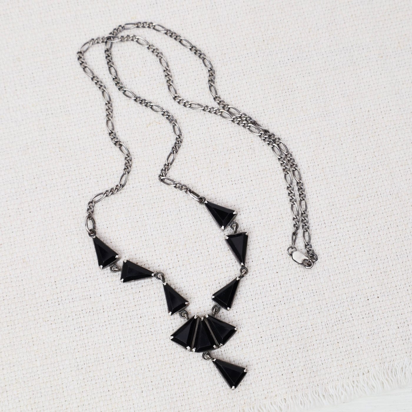 A timeless Art Deco–inspired necklace featuring triangular cuts of polished black onyx set in oxidized sterling silver. The geometric design and dark luster evoke vintage elegance, making this piece a stunning statement on its own or layered for added drama.