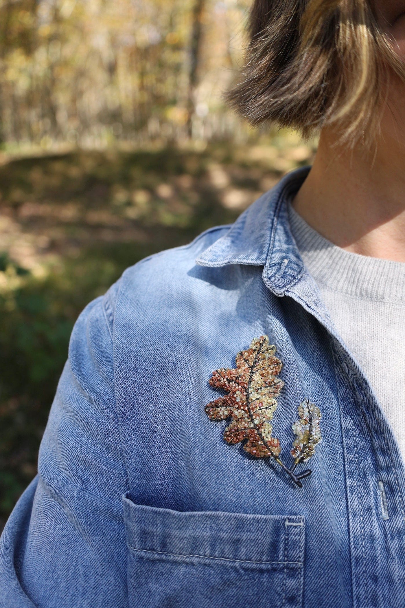 Celebrate the beauty of fall with this intricately hand-beaded oak leaf brooch, shimmering in warm amber, russet, and gold tones. Each sequin and bead captures the rich palette of autumn, bringing a touch of woodland elegance to your jacket, scarf, or sweater.