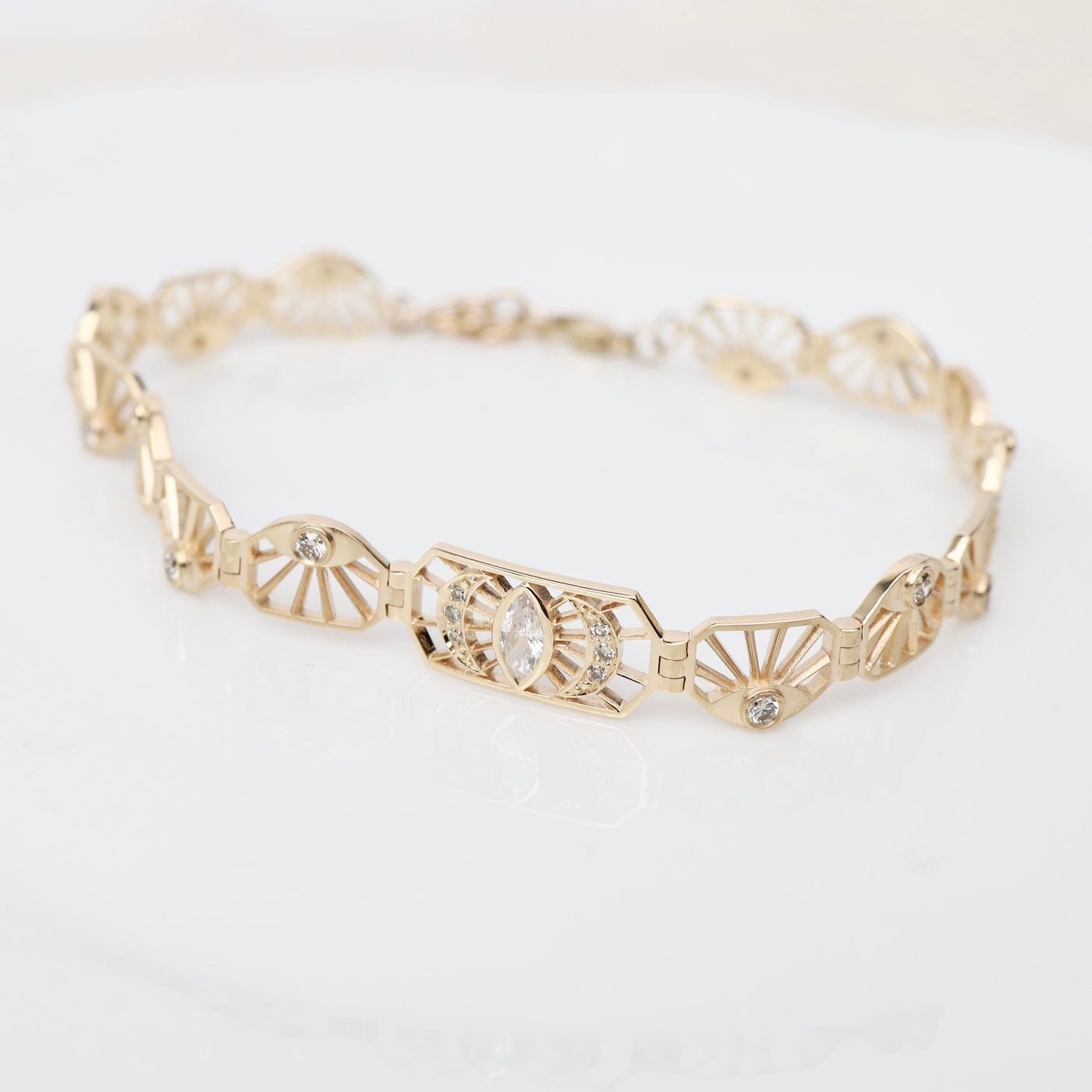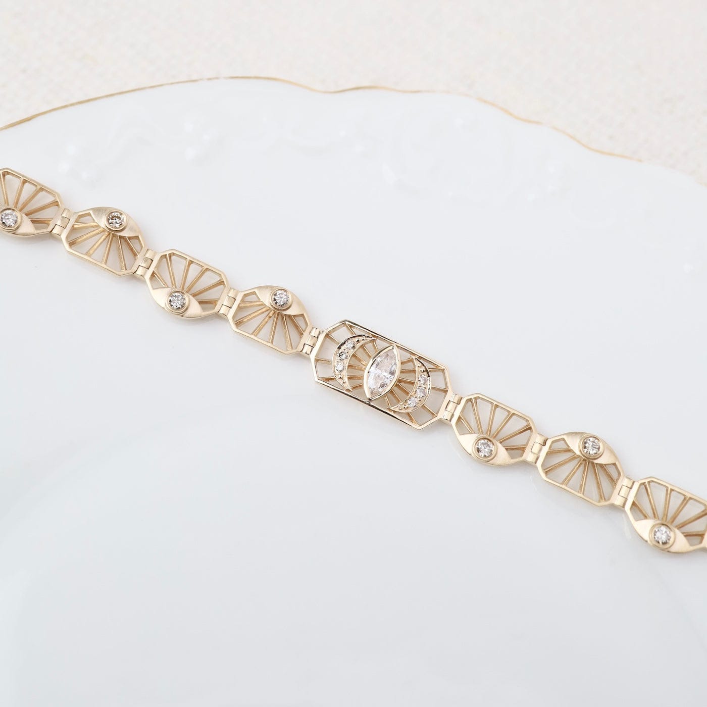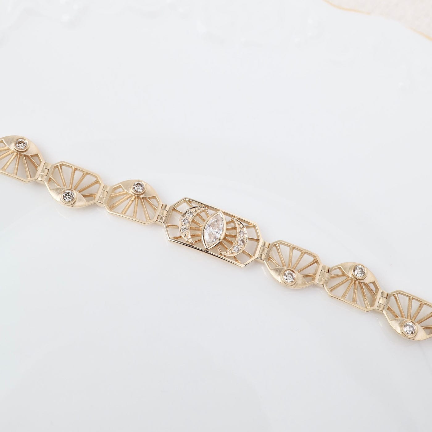 Intricate and luminous, this 14k gold articulated bracelet features an elegant pattern of openwork plates adorned with sparkling diamonds. At its center, a marquise diamond eye radiates protection and light, framed by crescent moons and sunray motifs. The graceful articulation allows the bracelet to move beautifully with the wrist—an exquisite balance of geometry and symbolism.
