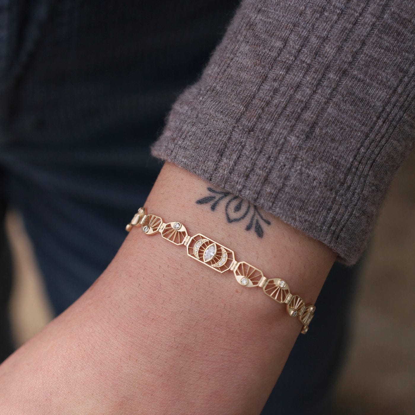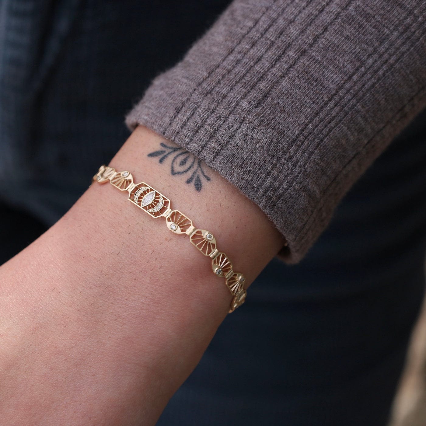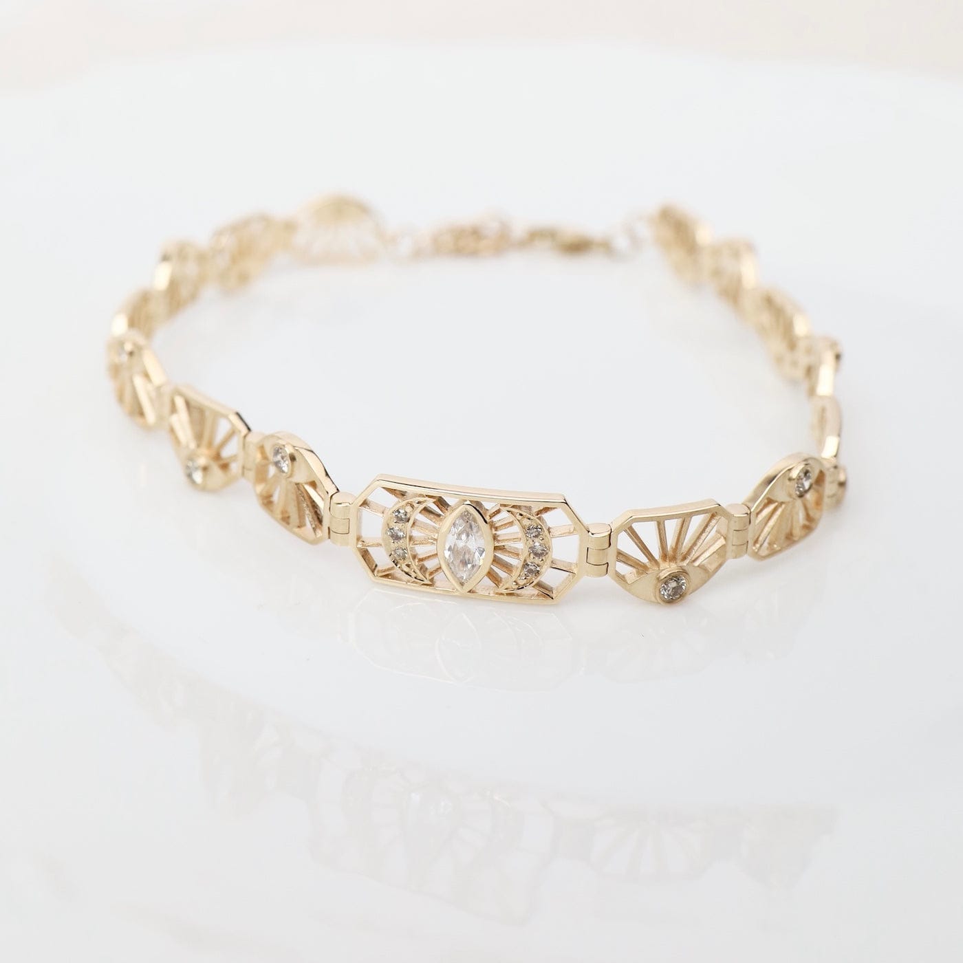 Intricate and luminous, this 14k gold articulated bracelet features an elegant pattern of openwork plates adorned with sparkling diamonds. At its center, a marquise diamond eye radiates protection and light, framed by crescent moons and sunray motifs. The graceful articulation allows the bracelet to move beautifully with the wrist—an exquisite balance of geometry and symbolism.
