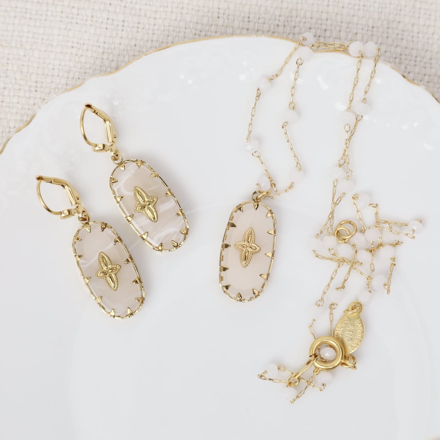 Elegant with just a touch of detail, these have a soft, luminous look that instantly brightens your face. The creamy white stone paired with the gold setting feels classic, while the subtle center detail adds a little something special.