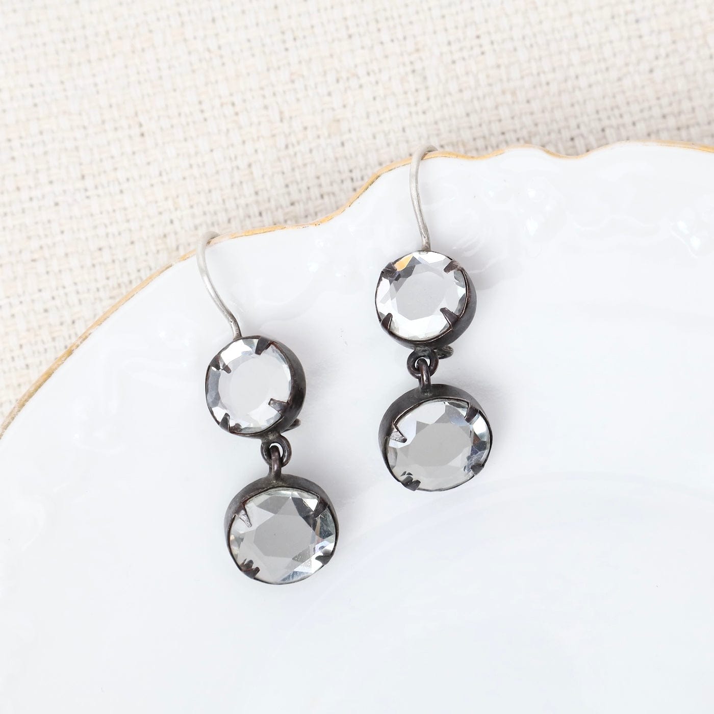 Two round beveled mirror-like stones bezel set in oxidized sterling silver. These earrings catch the light beautifully, adding a touch of subtle sparkle to any outfit.