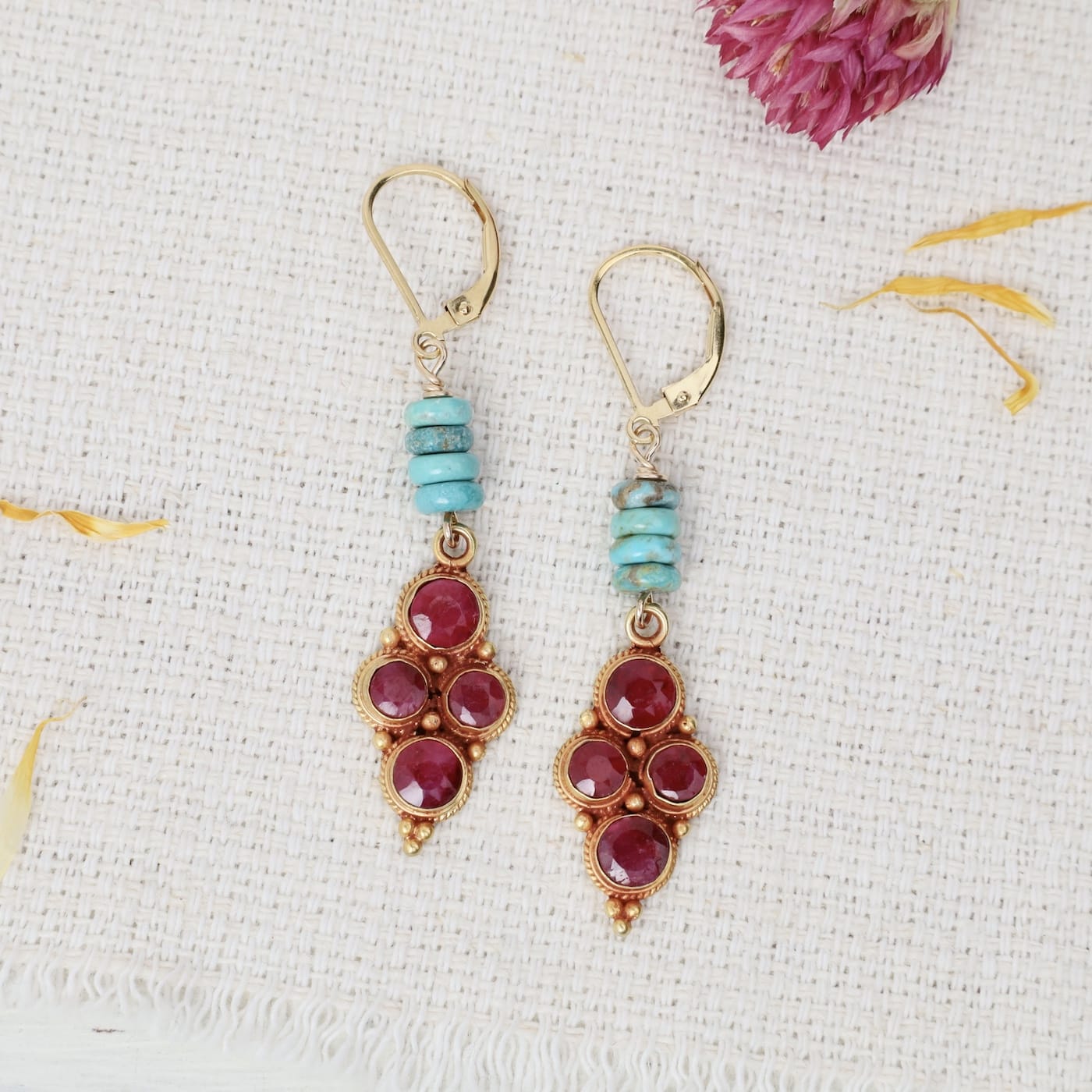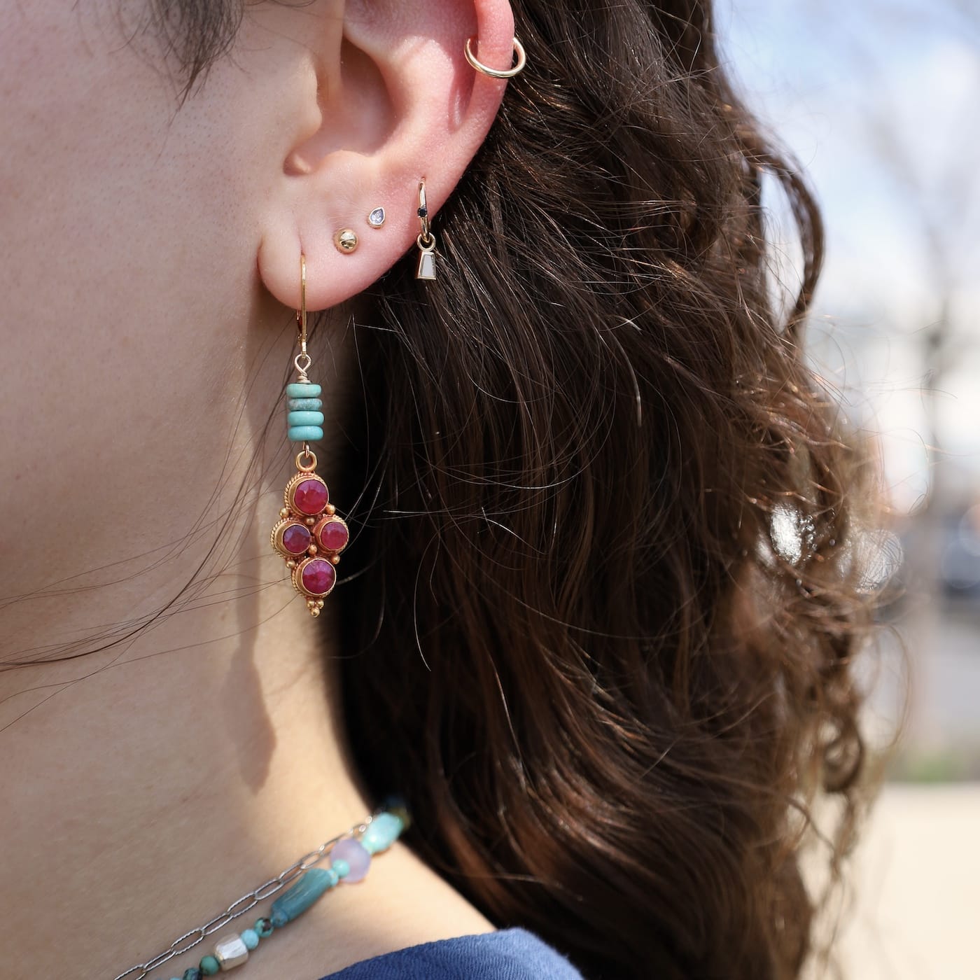 A classic shape with a vibrant twist—these earrings pair rich ruby tones with bright turquoise for a look that feels both timeless and fresh. The four-dot design adds a hint of vintage charm, while the movement keeps them feeling light and easy.