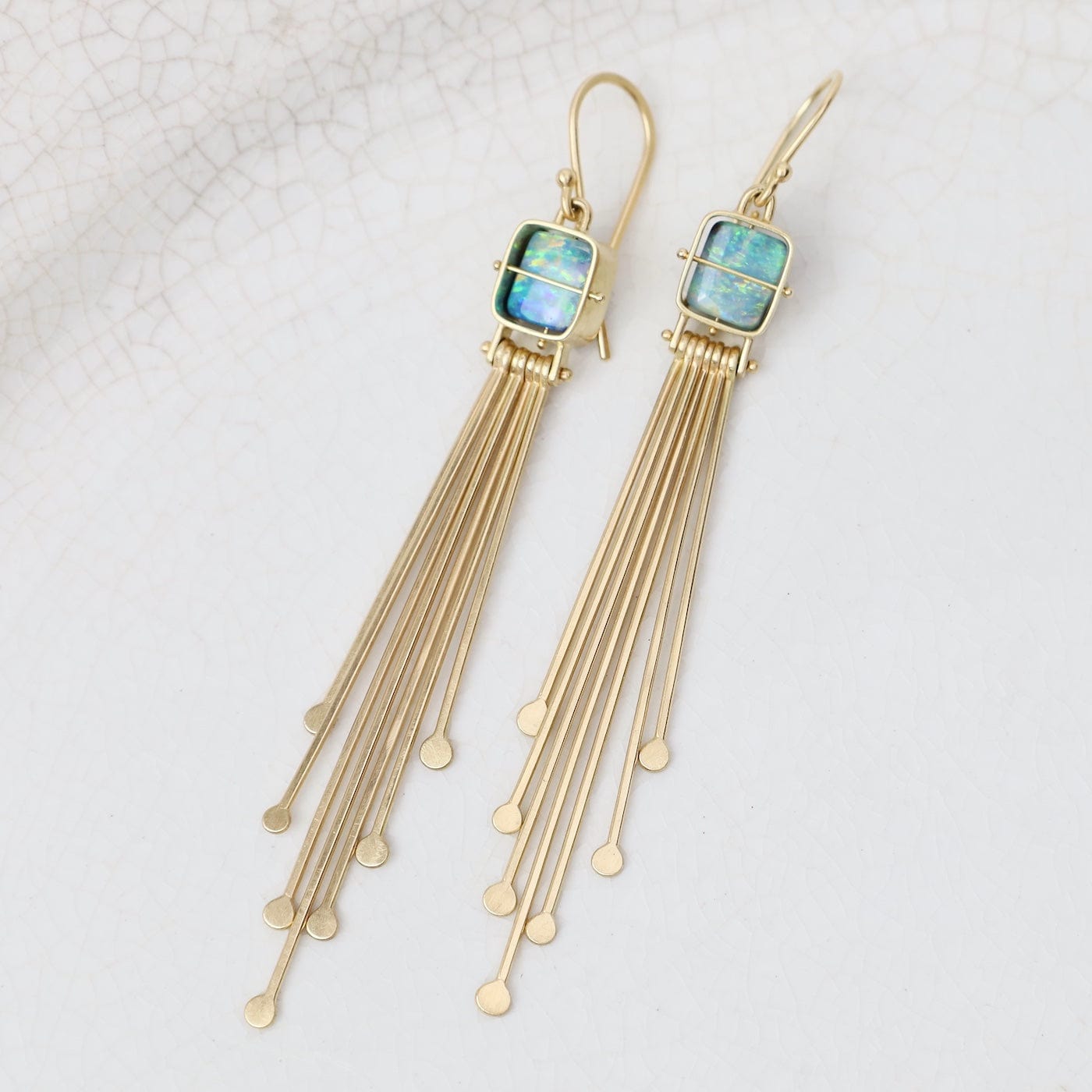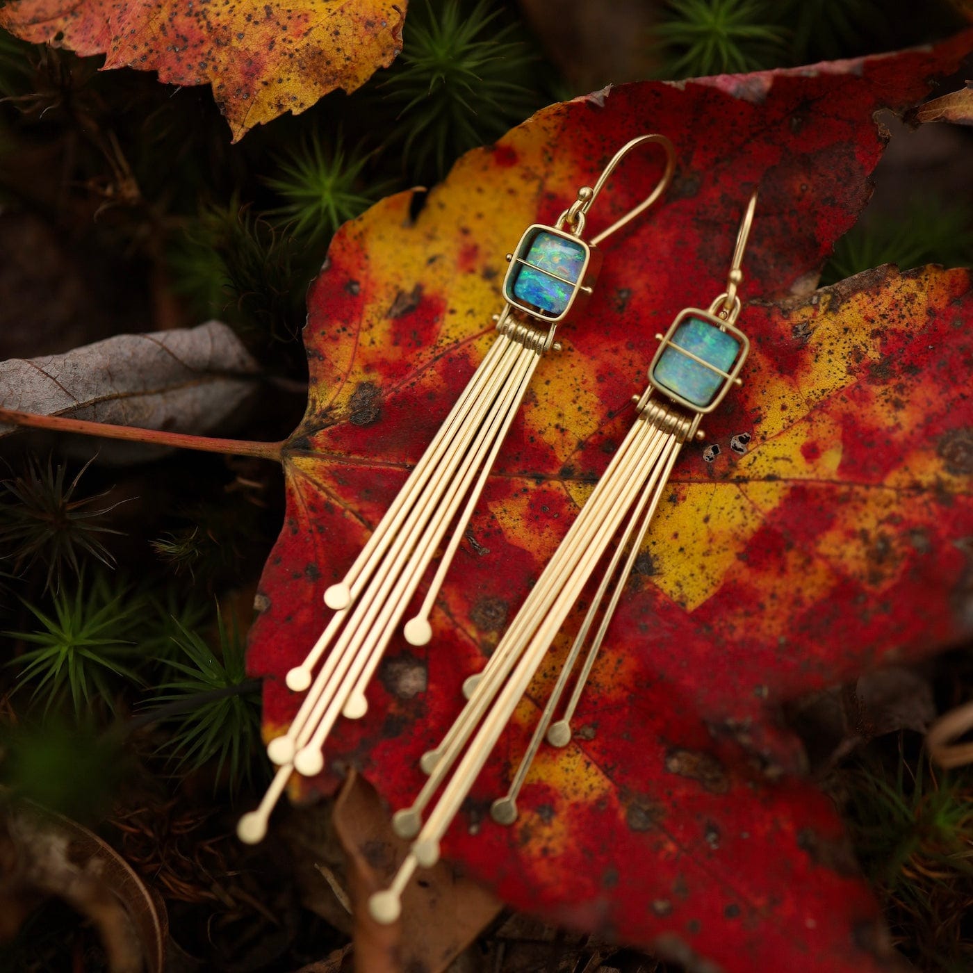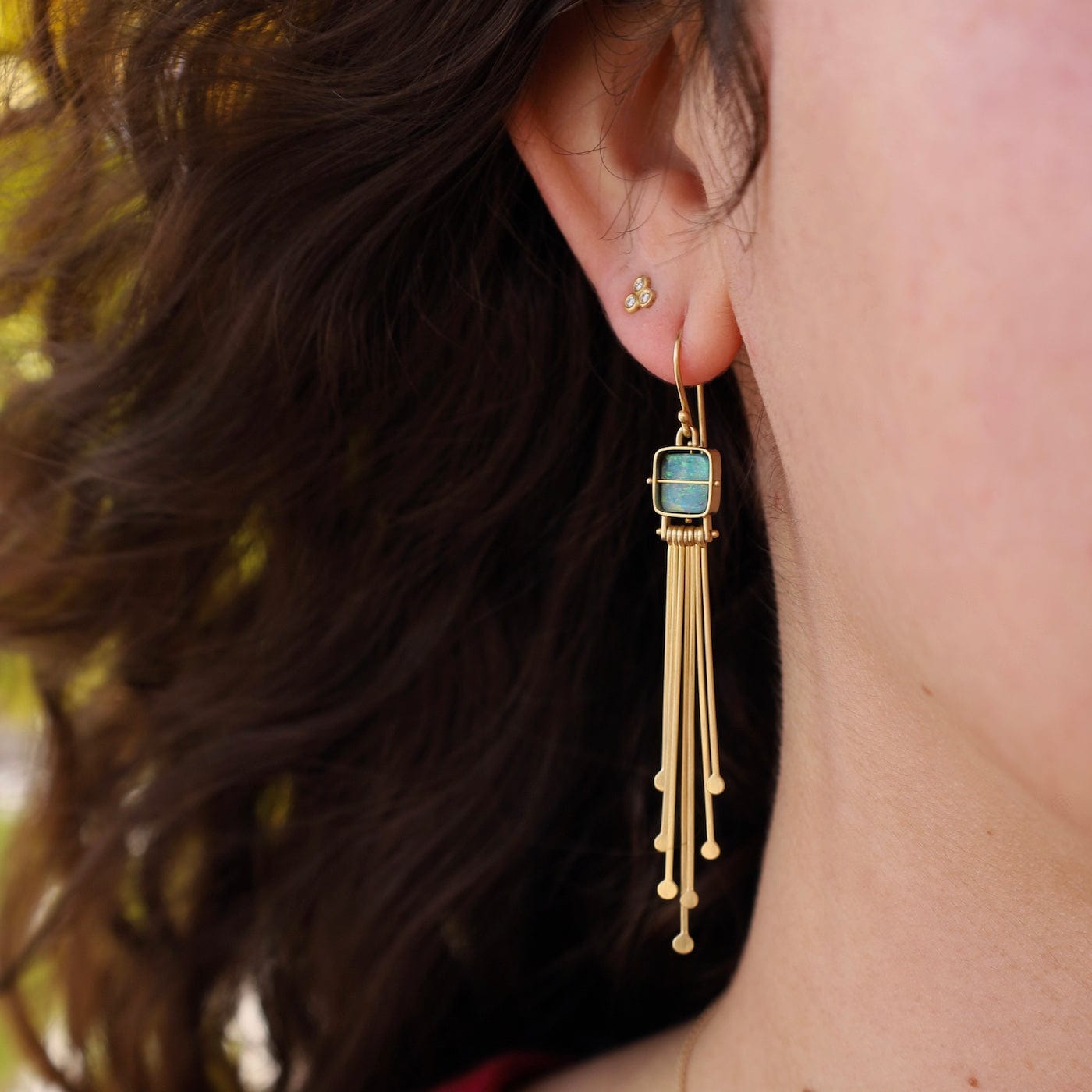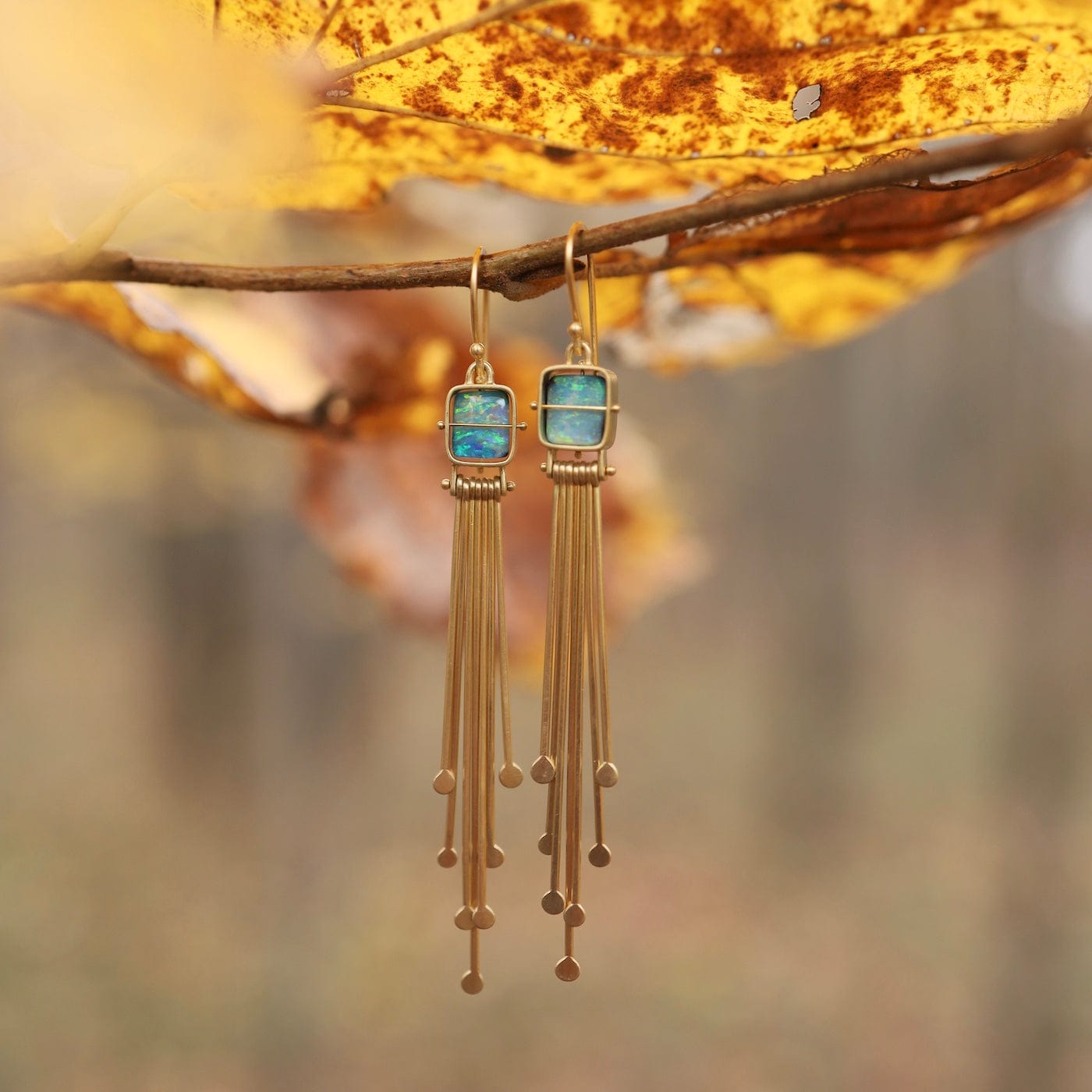 Showstopping earrings featuring flashes of electric blue and green boulder opals, each framed in 18k gold and finished with cascades of hand-hammered fringe. The elegant movement and rich iridescence make these one-of-a-kind earrings unforgettable—modern heirlooms meant to be treasured.