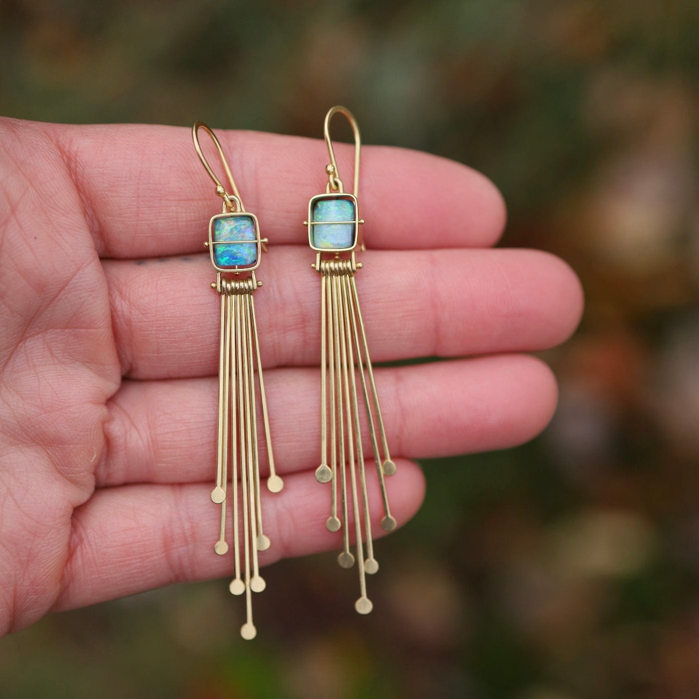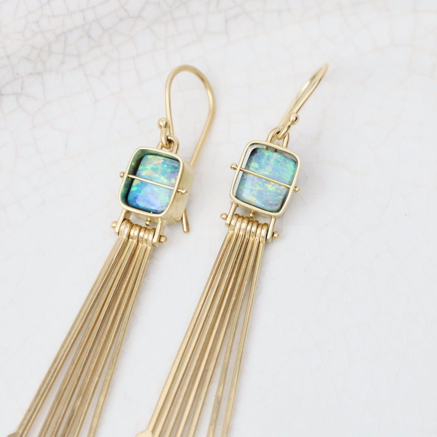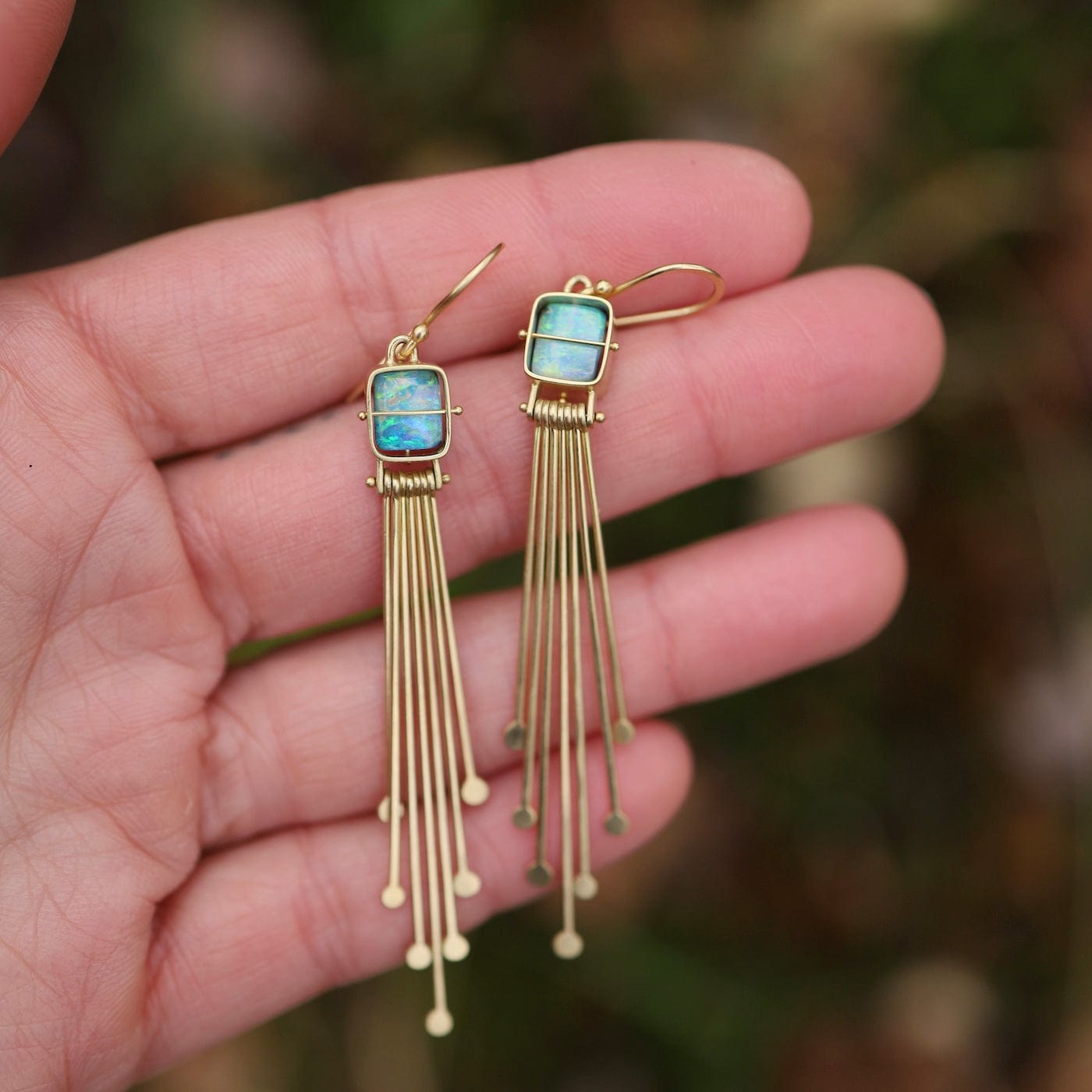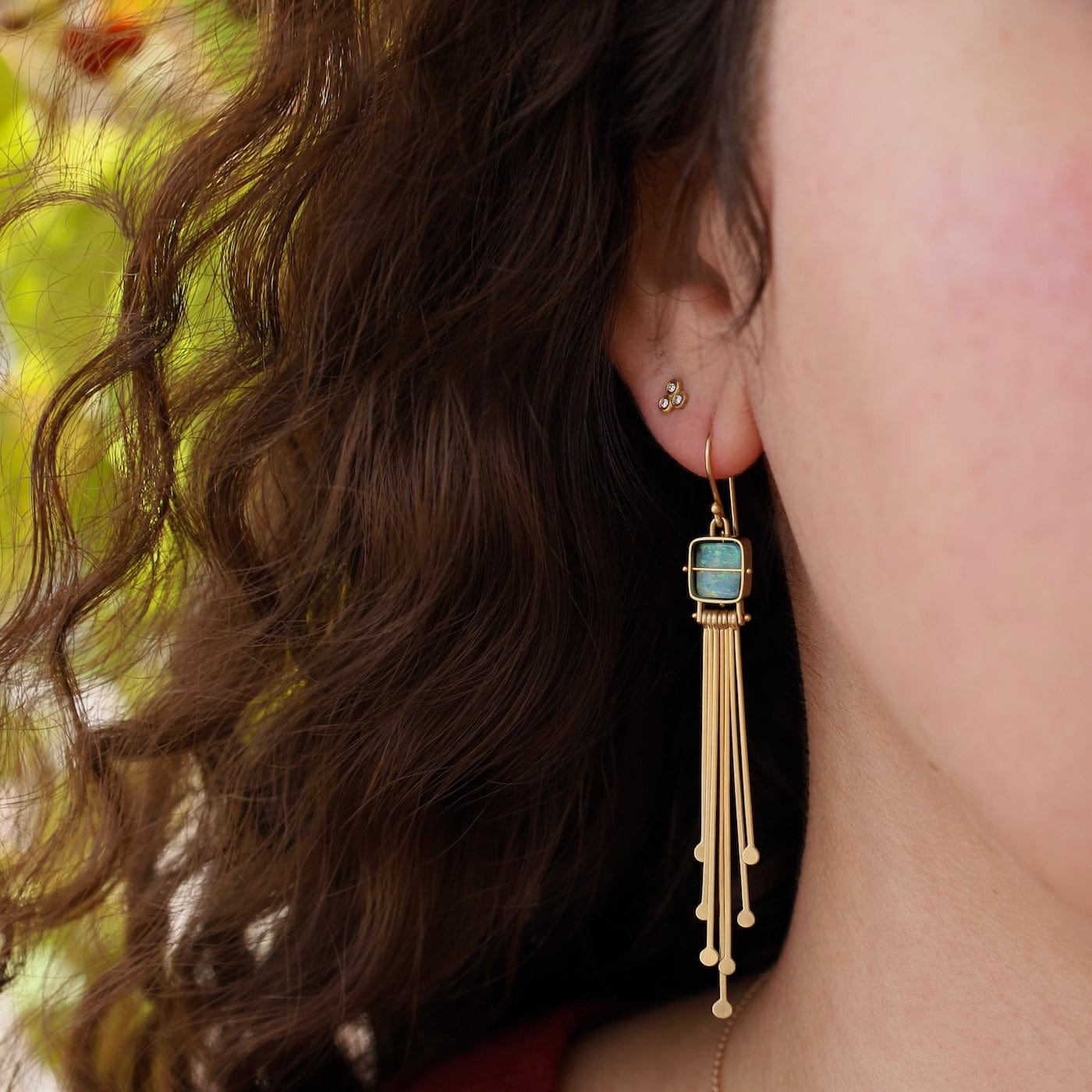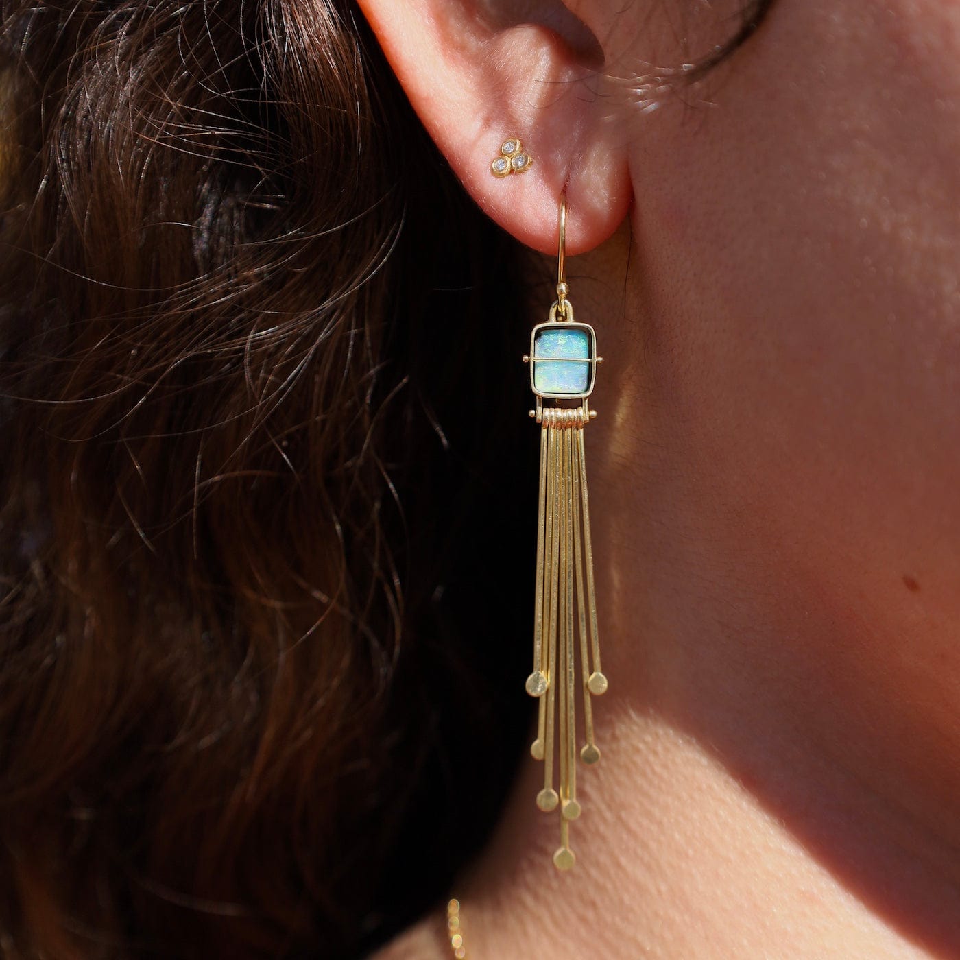 Showstopping earrings featuring flashes of electric blue and green boulder opals, each framed in 18k gold and finished with cascades of hand-hammered fringe. The elegant movement and rich iridescence make these one-of-a-kind earrings unforgettable—modern heirlooms meant to be treasured.