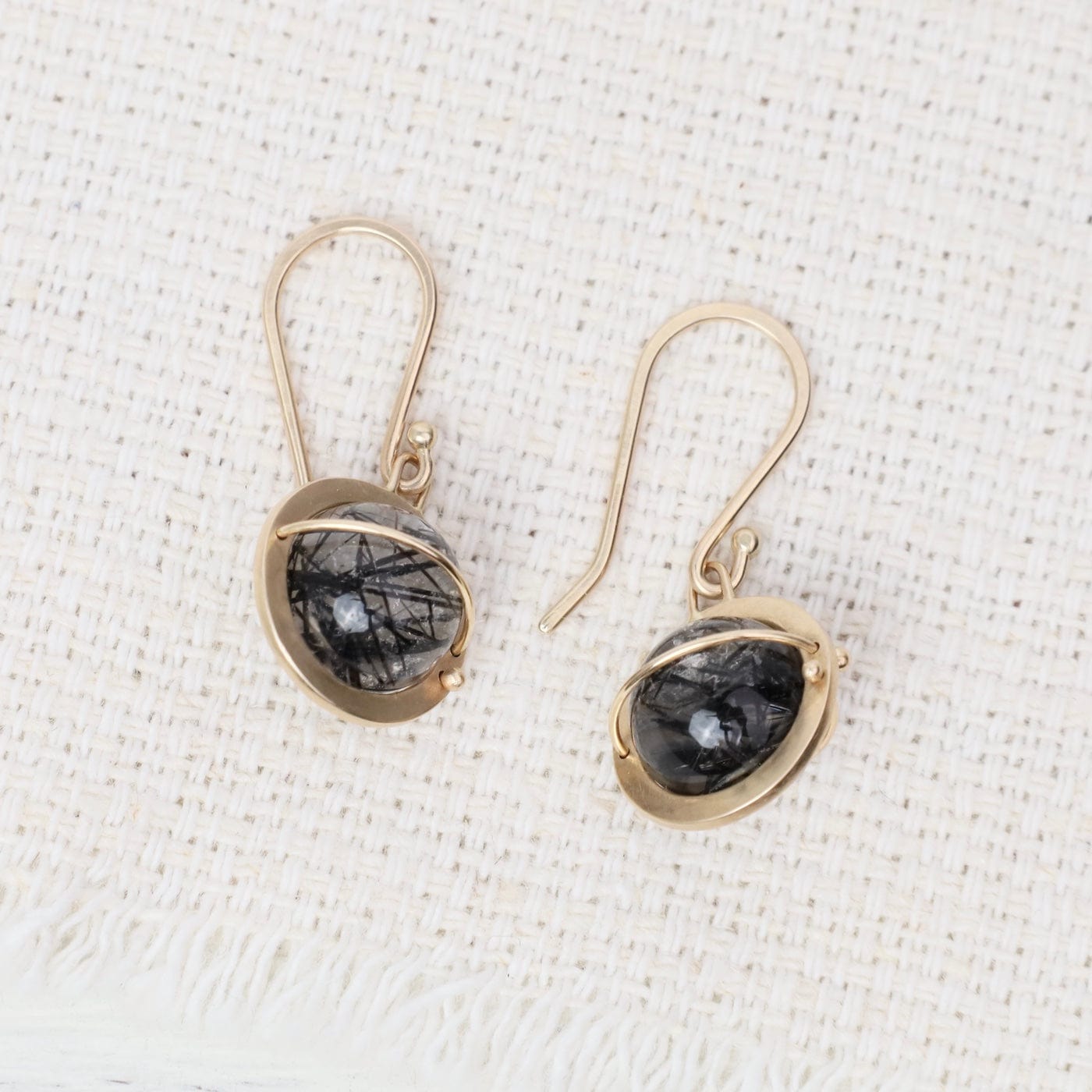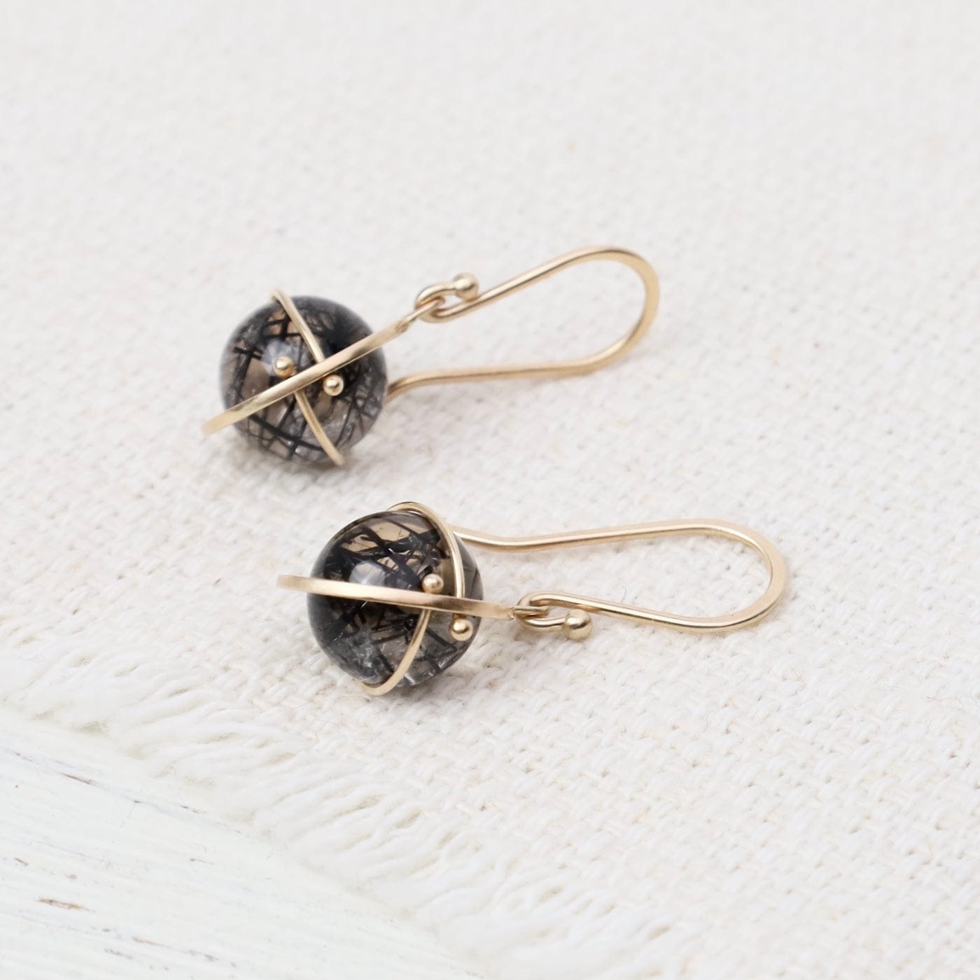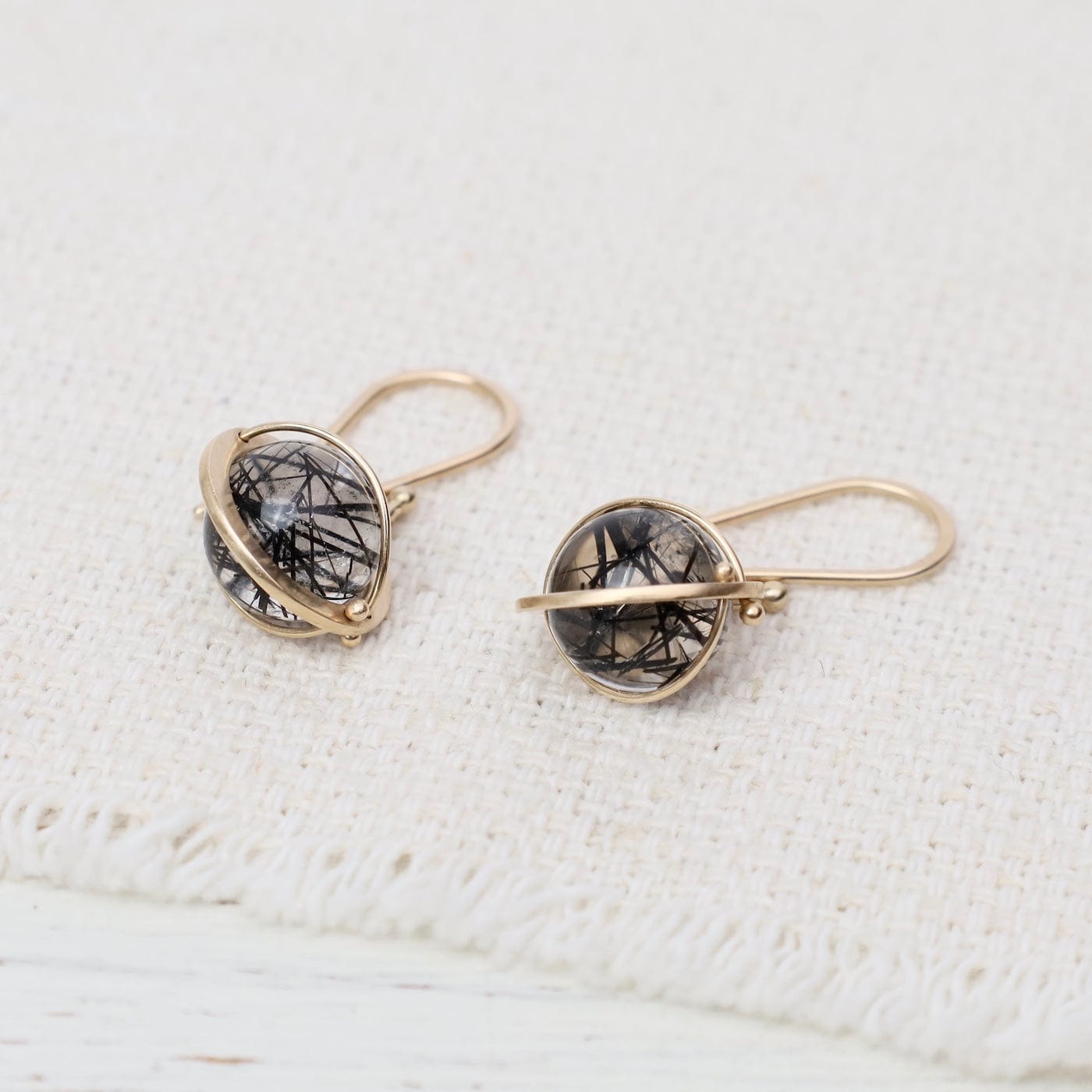 Elegant yet edgy, these luminous orb earrings feature threads of black tourmaline suspended within crystal-clear quartz. Each orb is captured in Hilary’s signature 14k gold setting—an artful balance of structure and movement. The contrast of gold and inky inclusions creates a look that’s both bold and timeless.