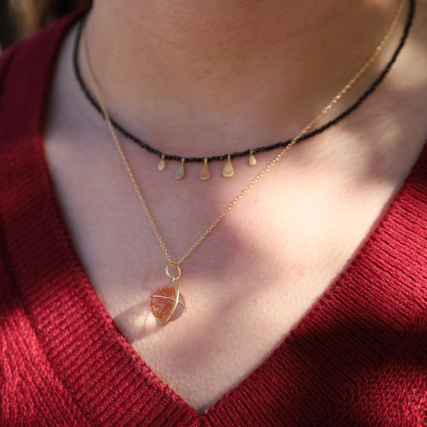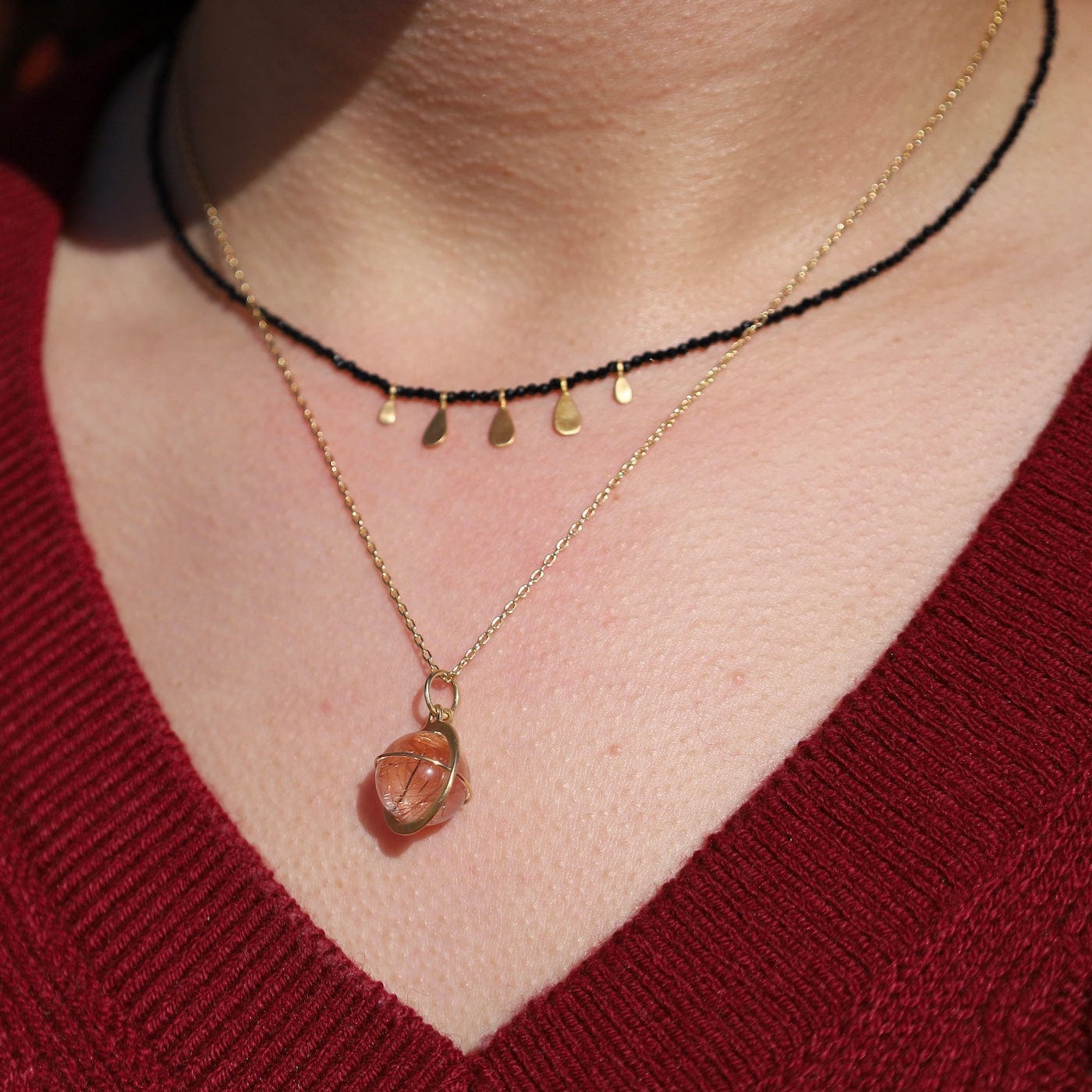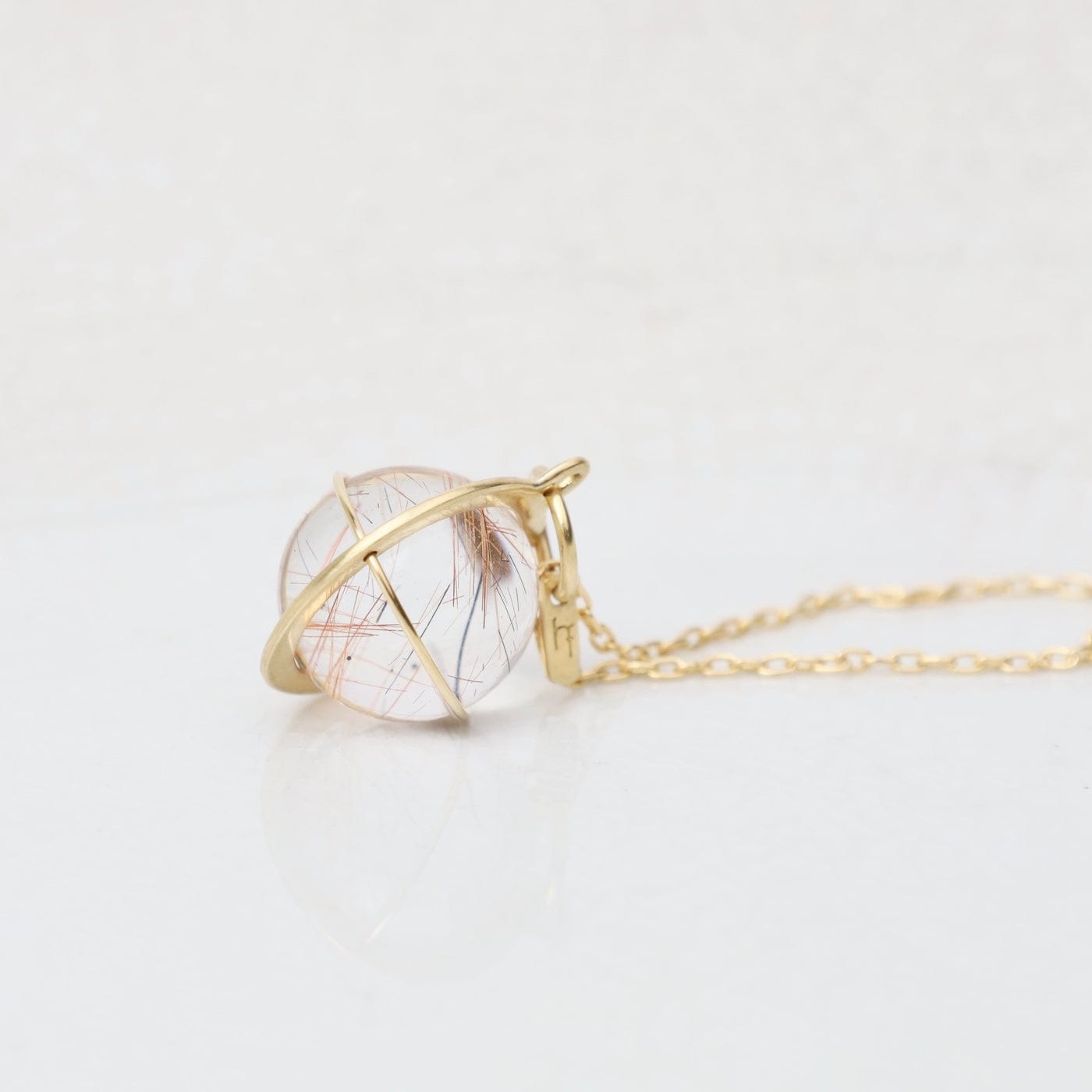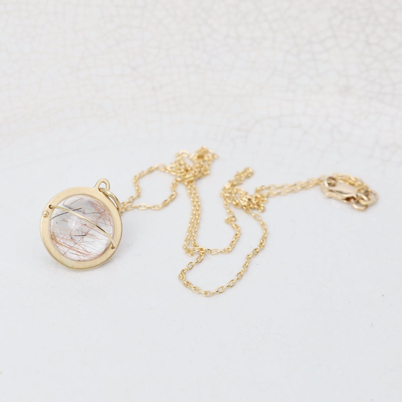 The must-have necklace from Hilary’s Captured Collection—a timeless piece that blends natural beauty with sculptural elegance. A golden rutilated quartz orb, alive with delicate golden threads, is held securely within Hilary’s signature 14k gold Captured setting. Each piece feels both modern and enduring, making it an effortless everyday treasure.
