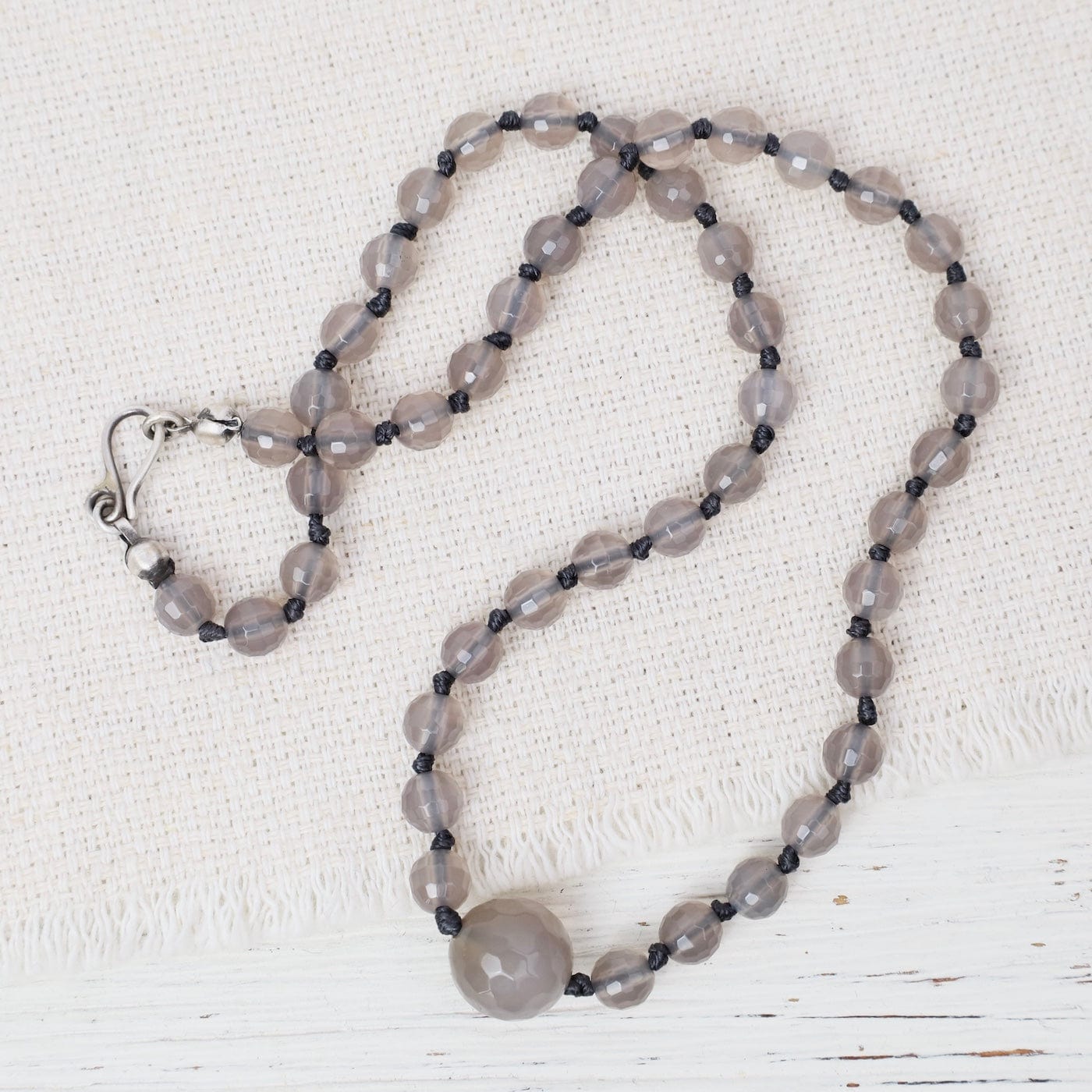 A faceted grey agate necklace, hand-knotted on silk for a beautiful drape and timeless appeal. Finished with a sterling silver clasp, this versatile piece pairs effortlessly with any style.