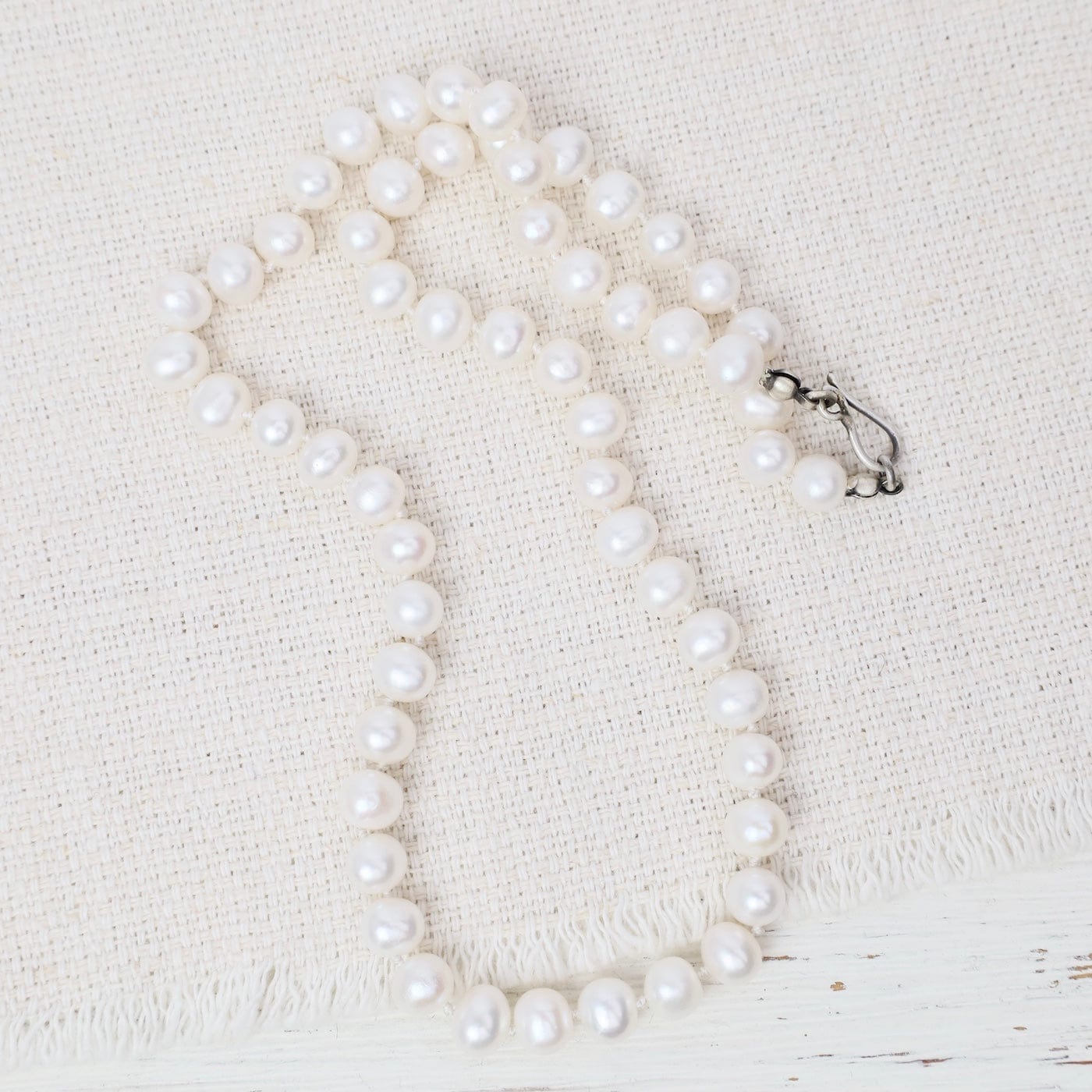 Timeless and elegant, this strand of luminous 8mm freshwater pearls is hand-knotted on silk and finished with a sterling silver clasp. A classic piece that complements any look, from everyday to evening.