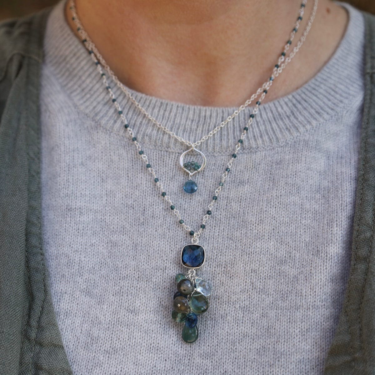 Delicate and luminous, this necklace features a faceted London blue quartz teardrop suspended from a sterling silver arabesque frame. Accented with petite grandidierite beads, the design captures a balance of elegance and color. Finished on a sterling silver link chain with an adjustable length for versatile wear.
