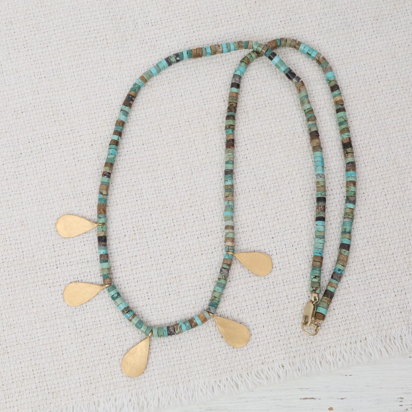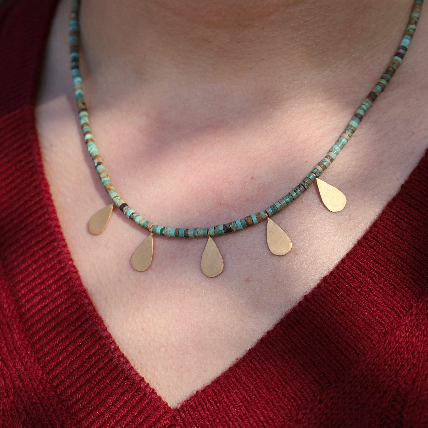 Five glowing 22k gold teardrops shimmer on a strand of turquoise beads with variations from blue to brown. A beautiful piece to wear alone or layered.