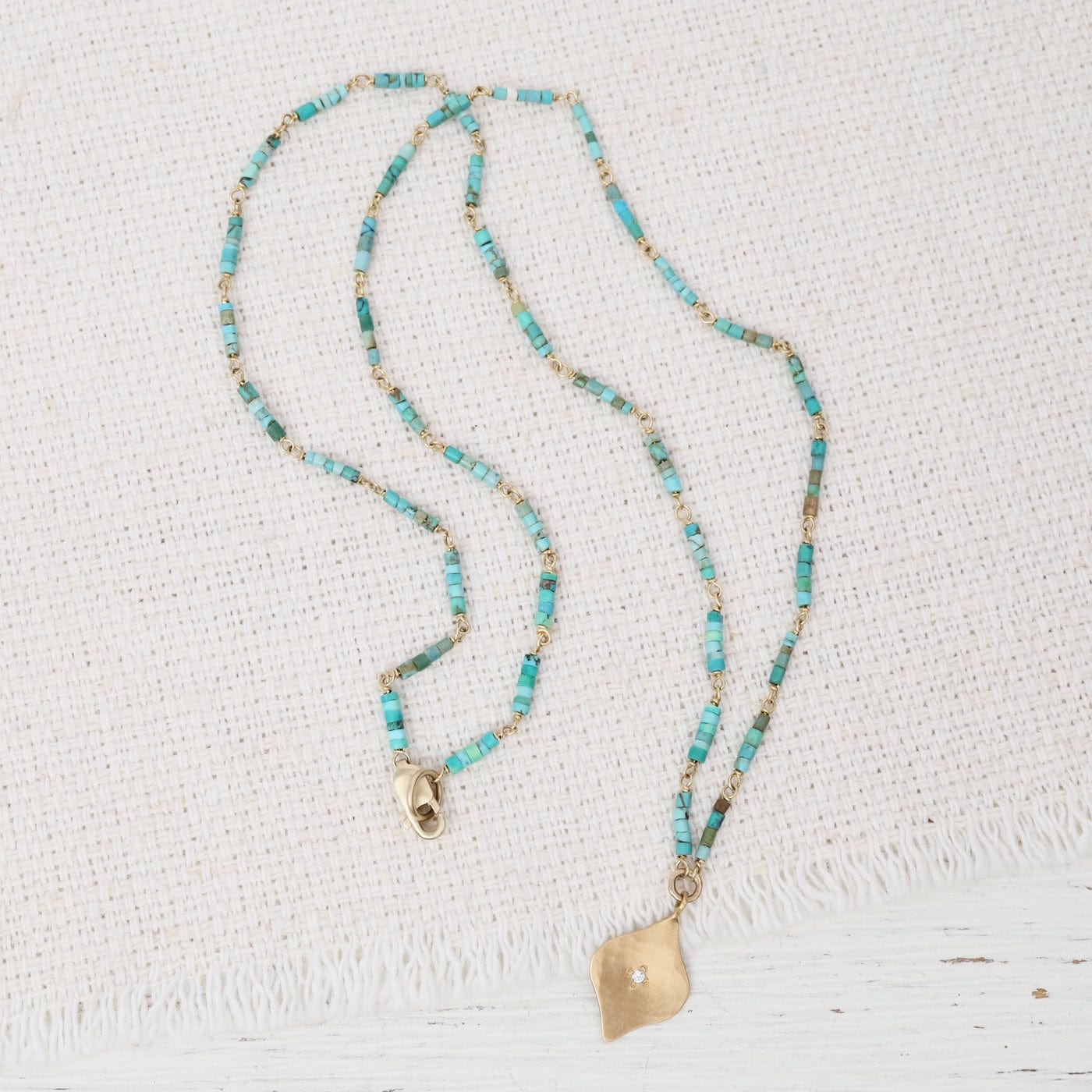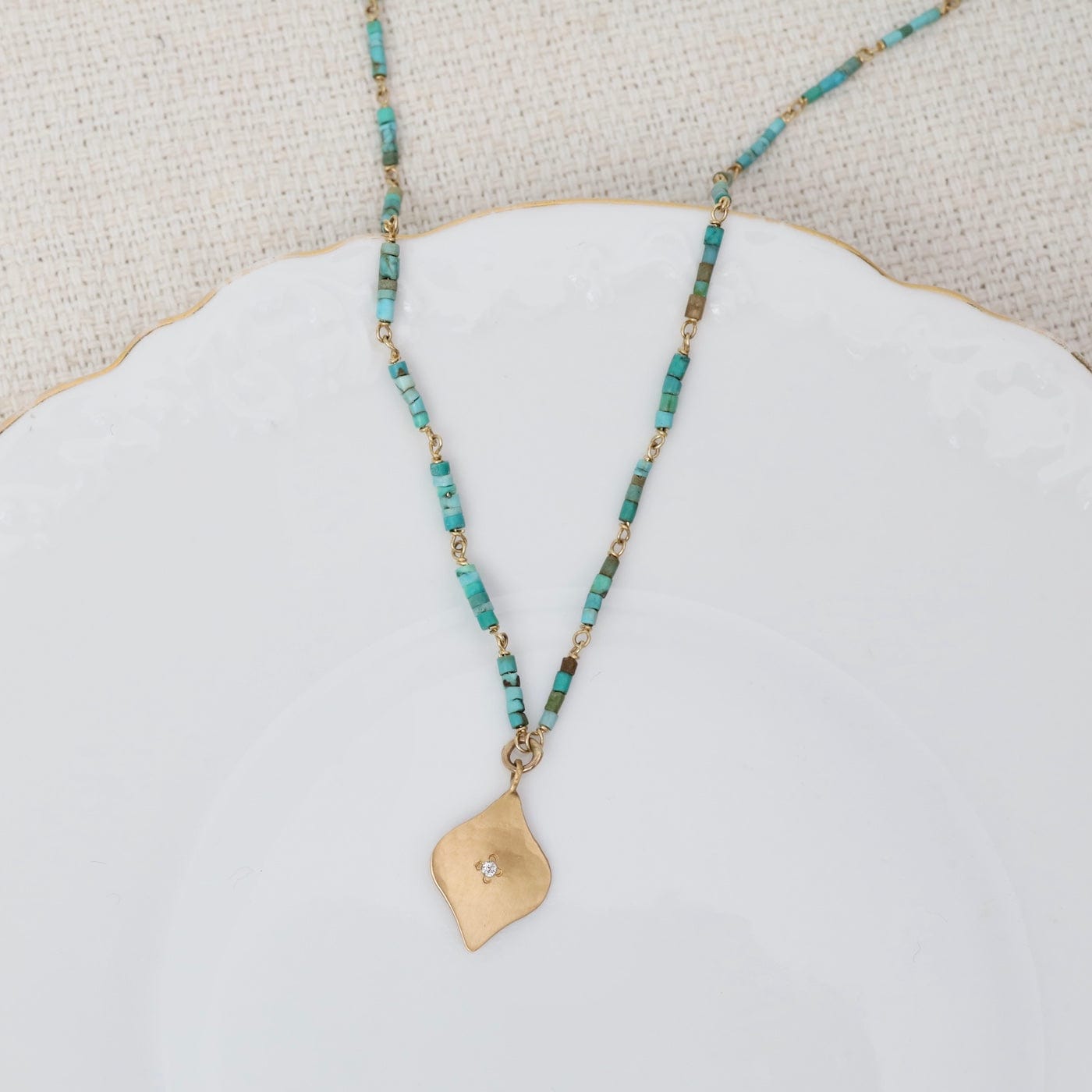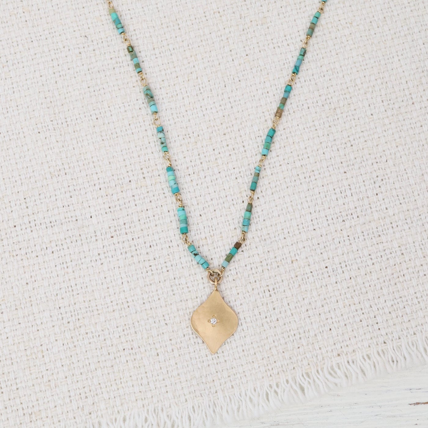 A graceful hammered 22k gold charm, accented with a single white diamond at its center, is stationed on a delicate, linked strand of vibrant turquoise heishi beads.