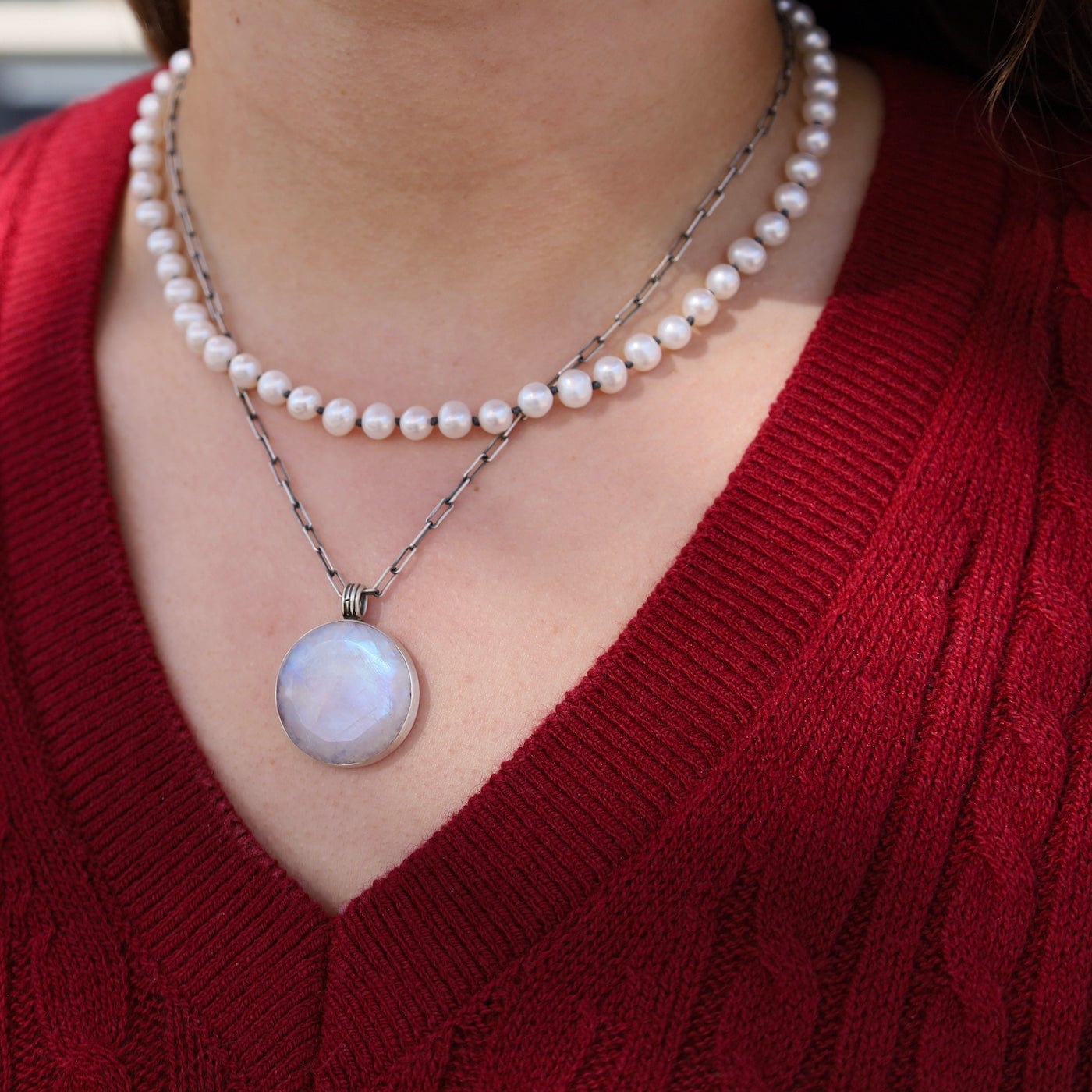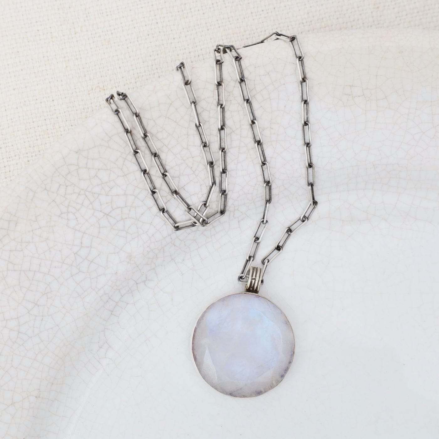 A timeless design with a touch of ethereal glow. This faceted rainbow moonstone pendant is bezel-set in oxidized sterling silver, catching the light with every movement. Elegant on its own or layered with other favorites.