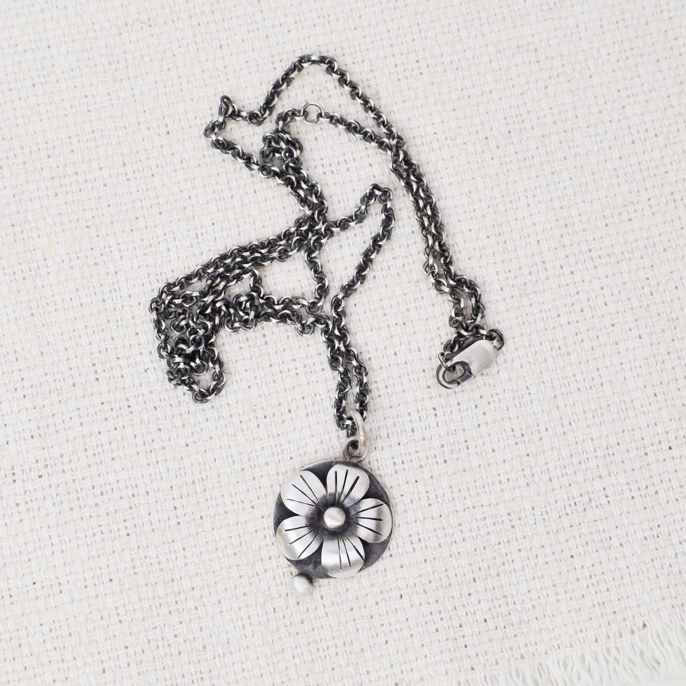 A sweet sterling silver flower pendant with delicately etched petals and a softly domed design. Suspended from an oxidized cable chain for a vintage-inspired finish.