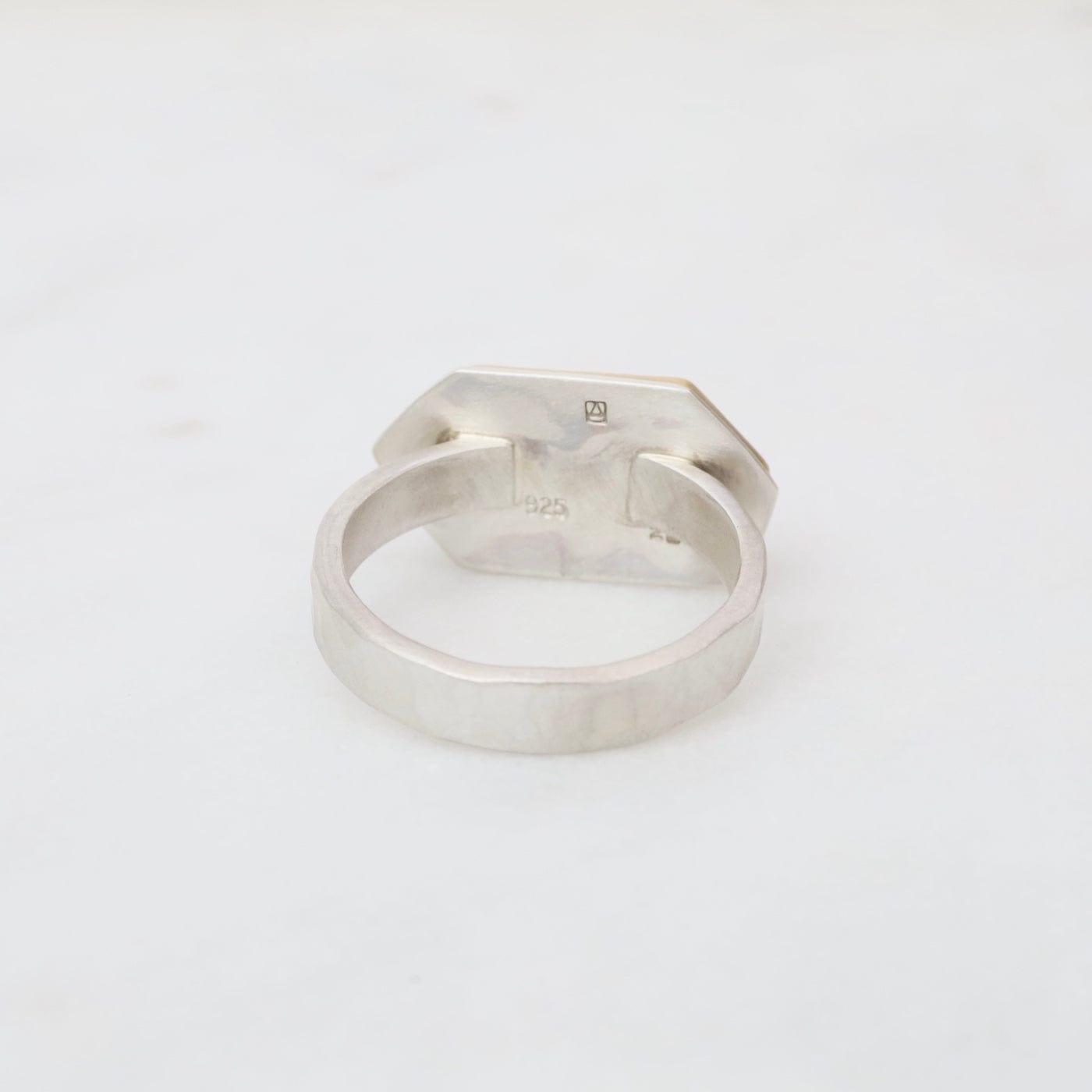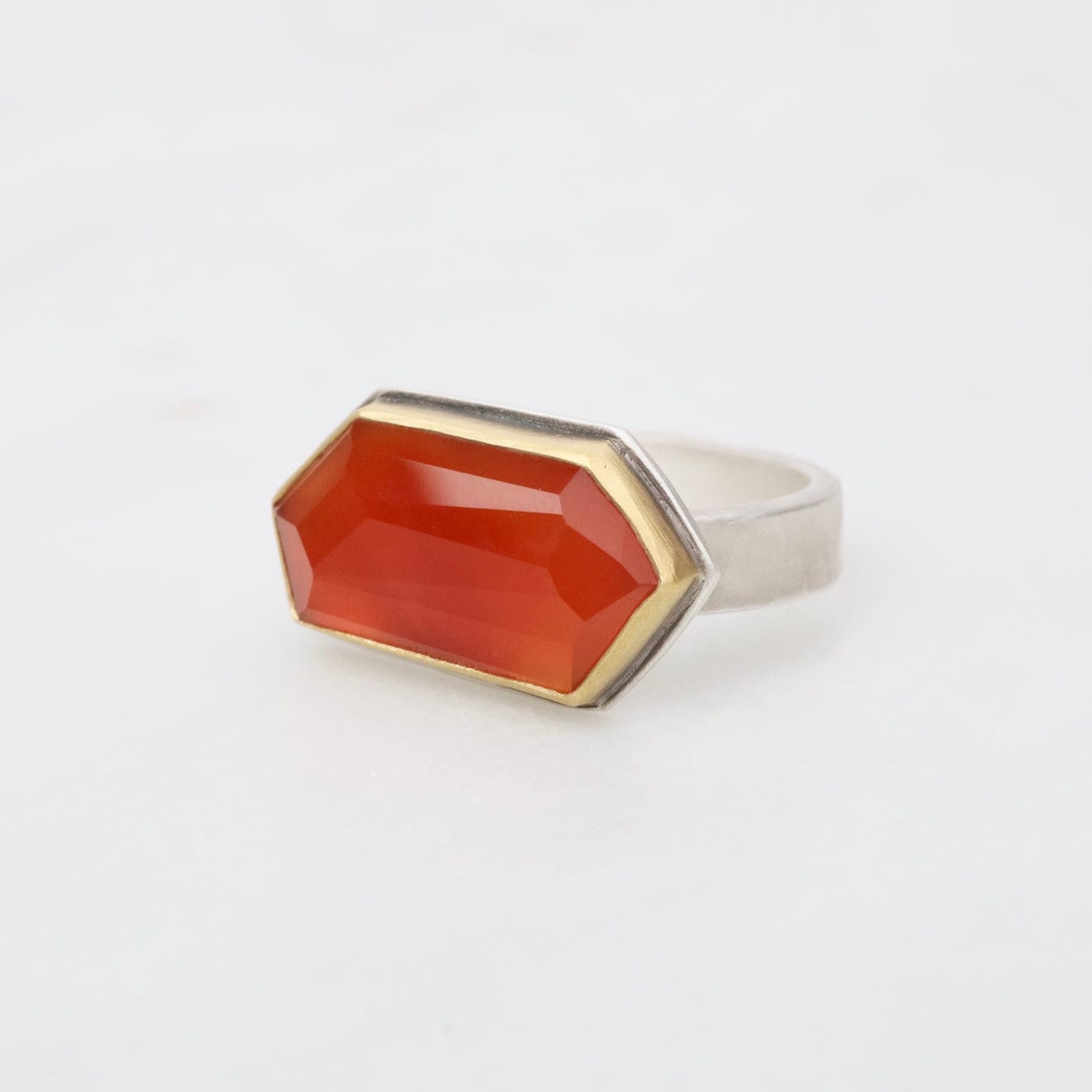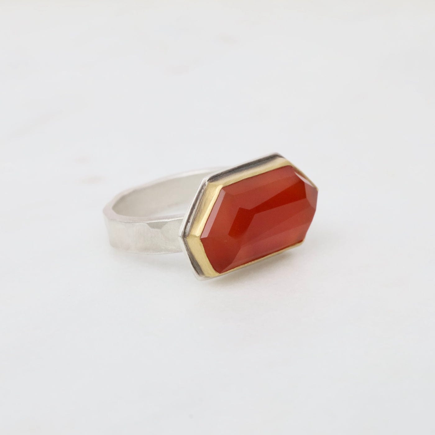 A stunning orange, rose cut carnelian is simply wrapped in warm 22k gold and set on a hammered, sterling silver band.